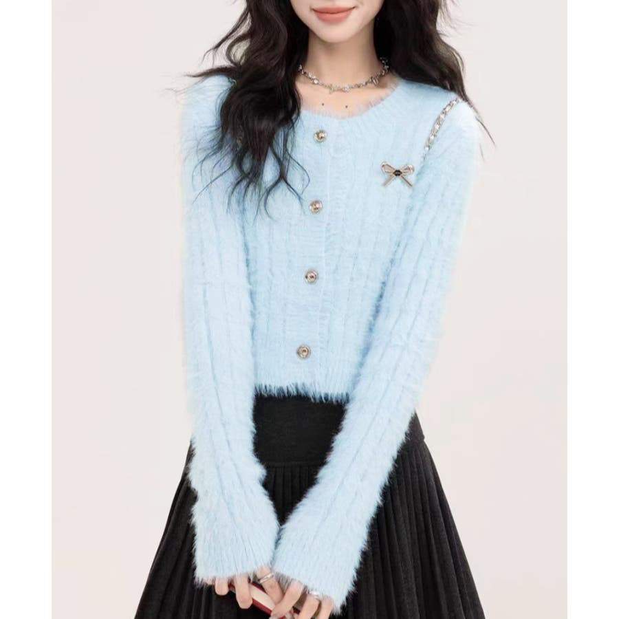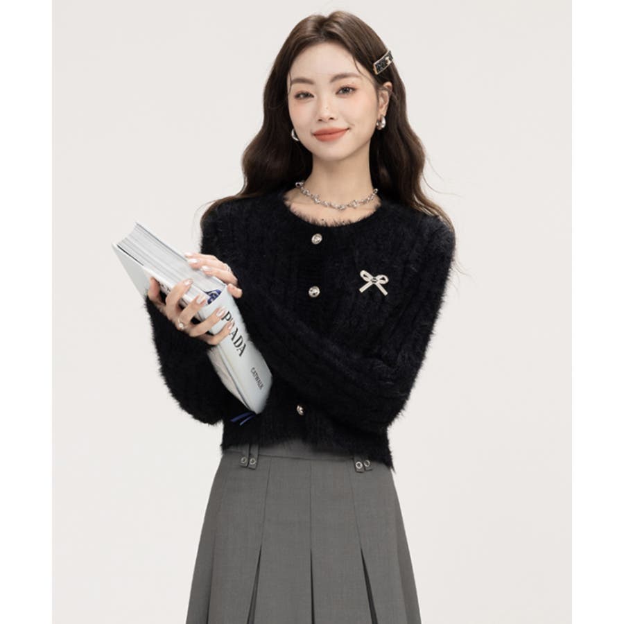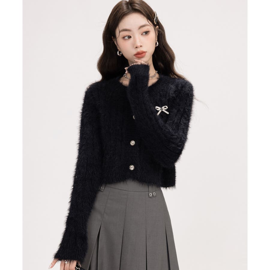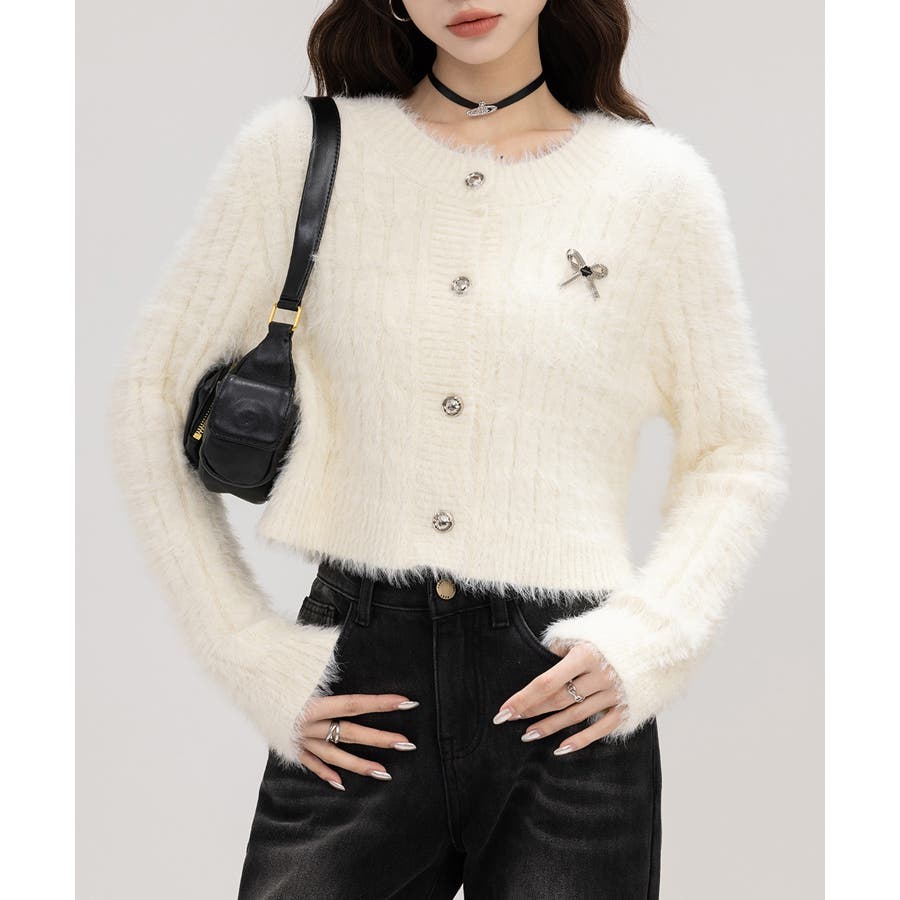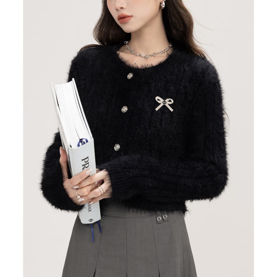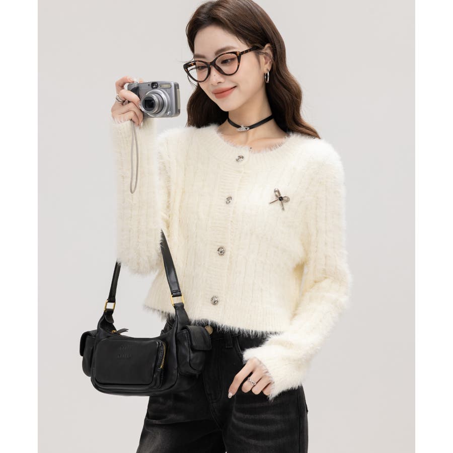 フェミニンな装いを引き立てるリボンブローチ付きフワフワカーディガン カーディガン…