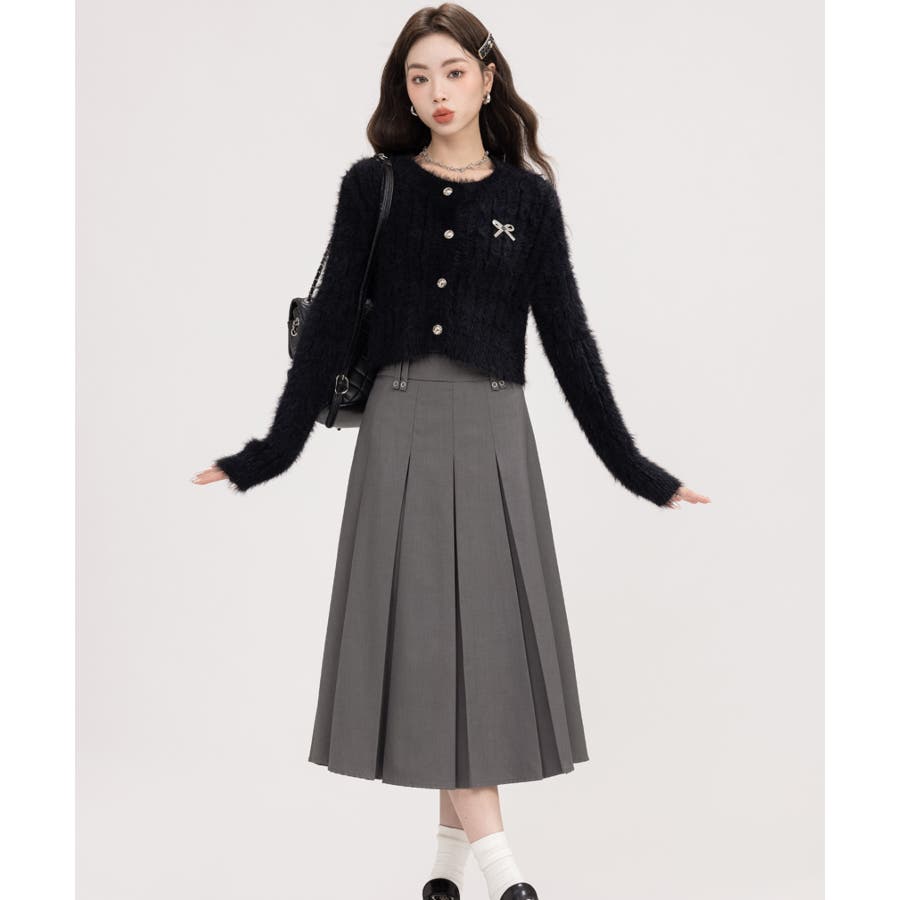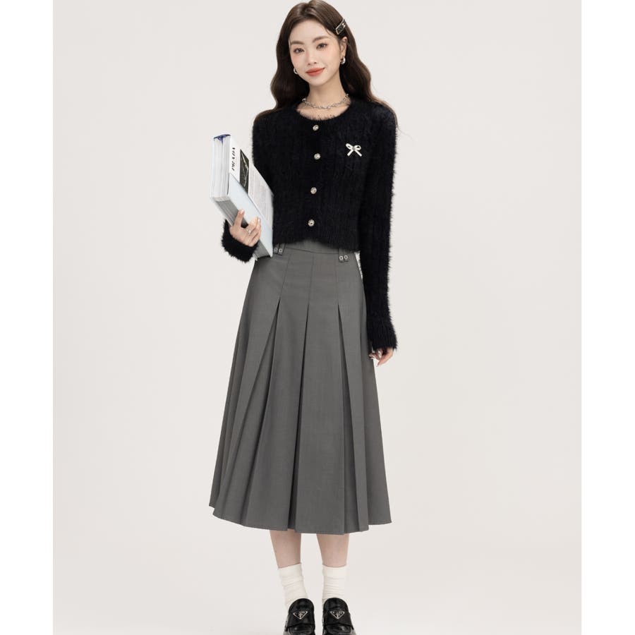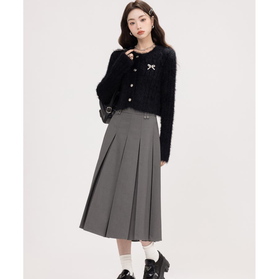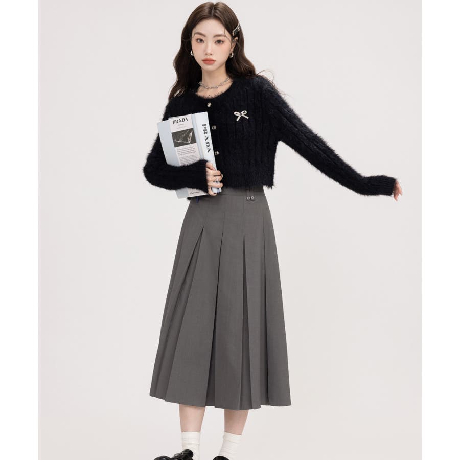 【スタイリング提案】 インナーにはシンプルなロングスリーブTシャツを合わせて、カーディガンを主役に。また、ワイドパンツやプリーツスカートと合わせることで、上品でモダンな雰囲気のコーディネートが完成します。アクセサリーを控えめにして、カーディガンのリボンブローチを目立たせるのがポイントです。