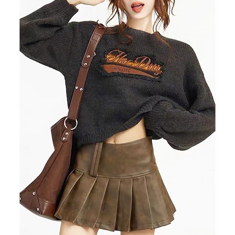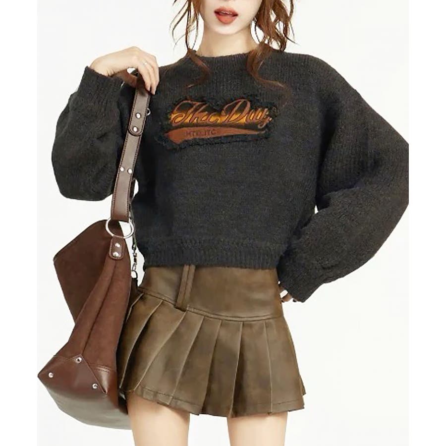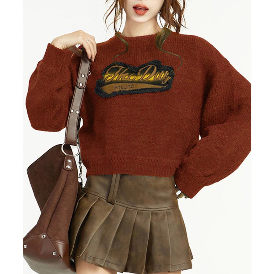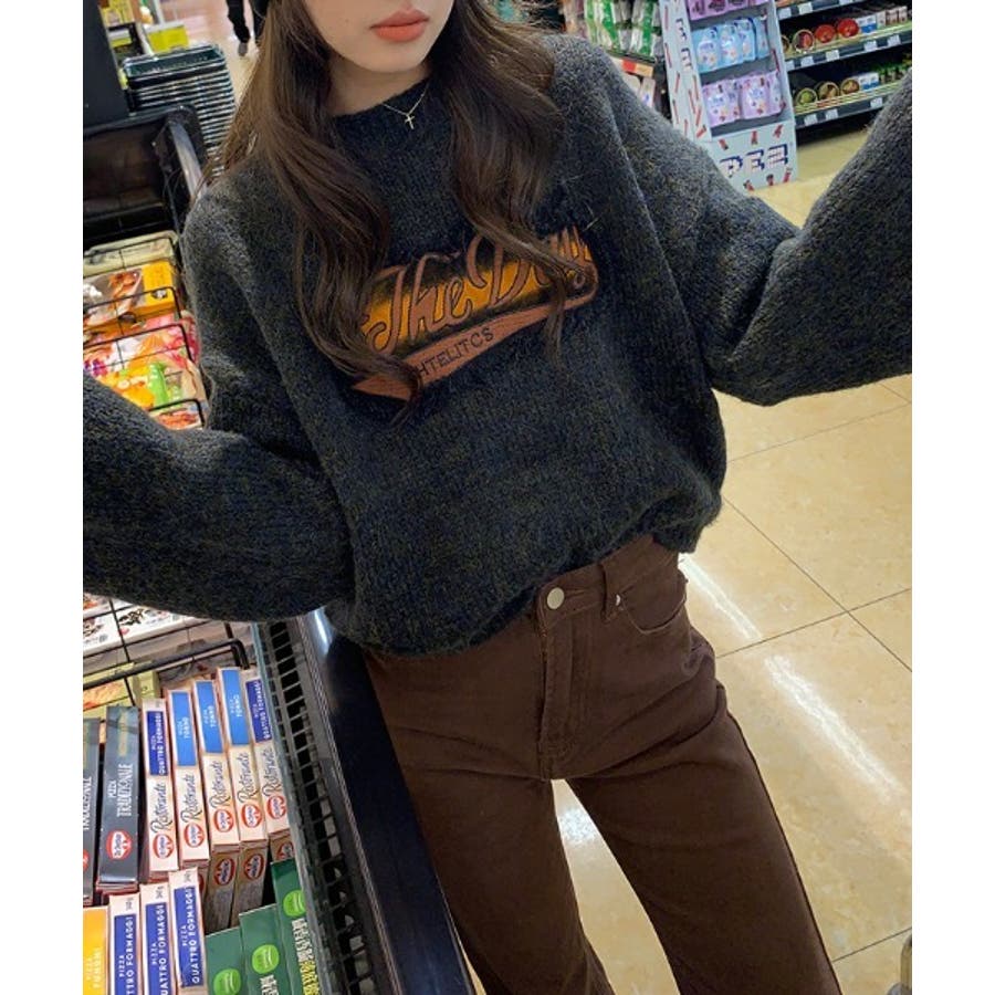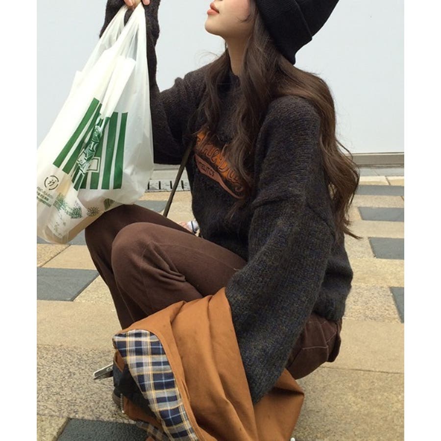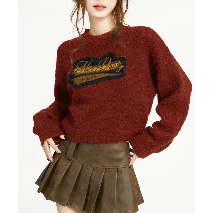 胸元のパッチワーク風ロゴが目を引く、トレンド感あふれるニットプルオーバー。ゆったりとしたシルエットと程よい丈感で、ハイウエストボトムスやスカートとの相性も抜群◎。