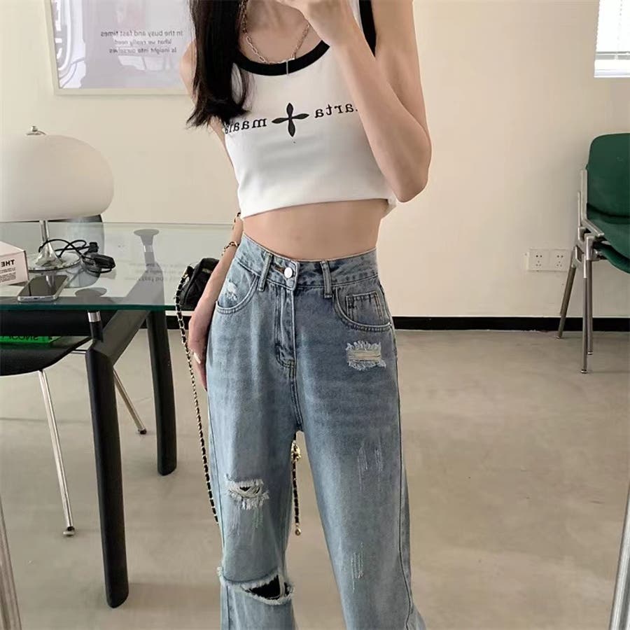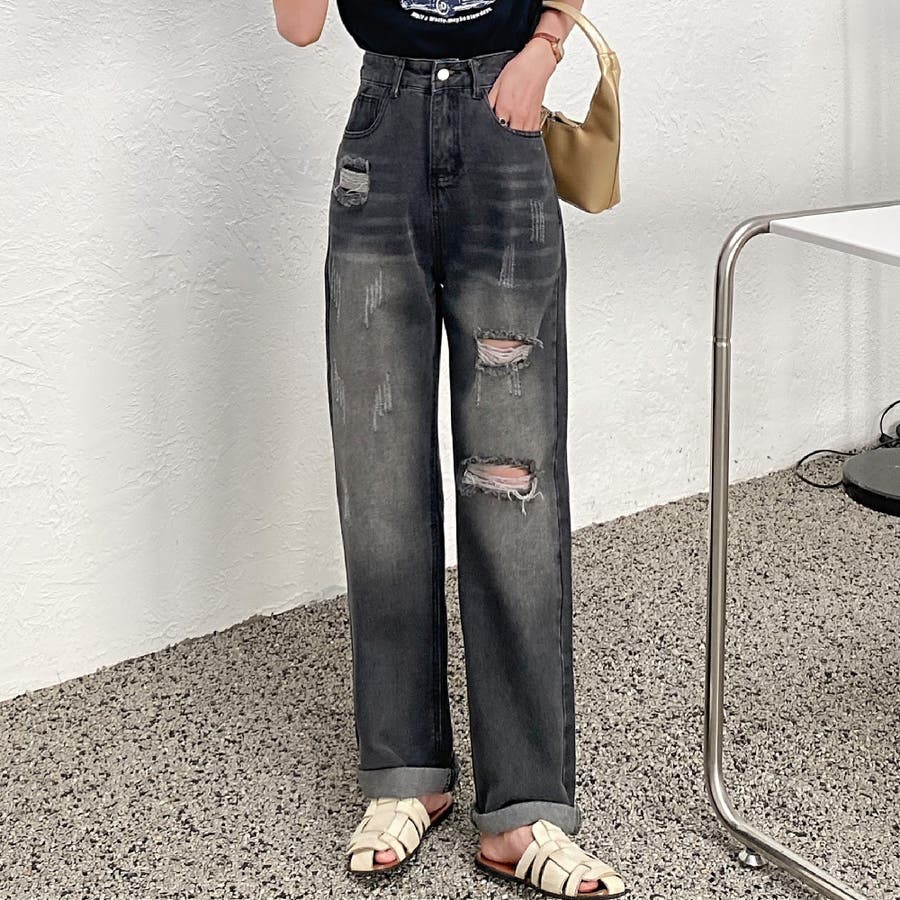 ダメージワイドデニムパンツ 韓国ファッション ハイウエスト