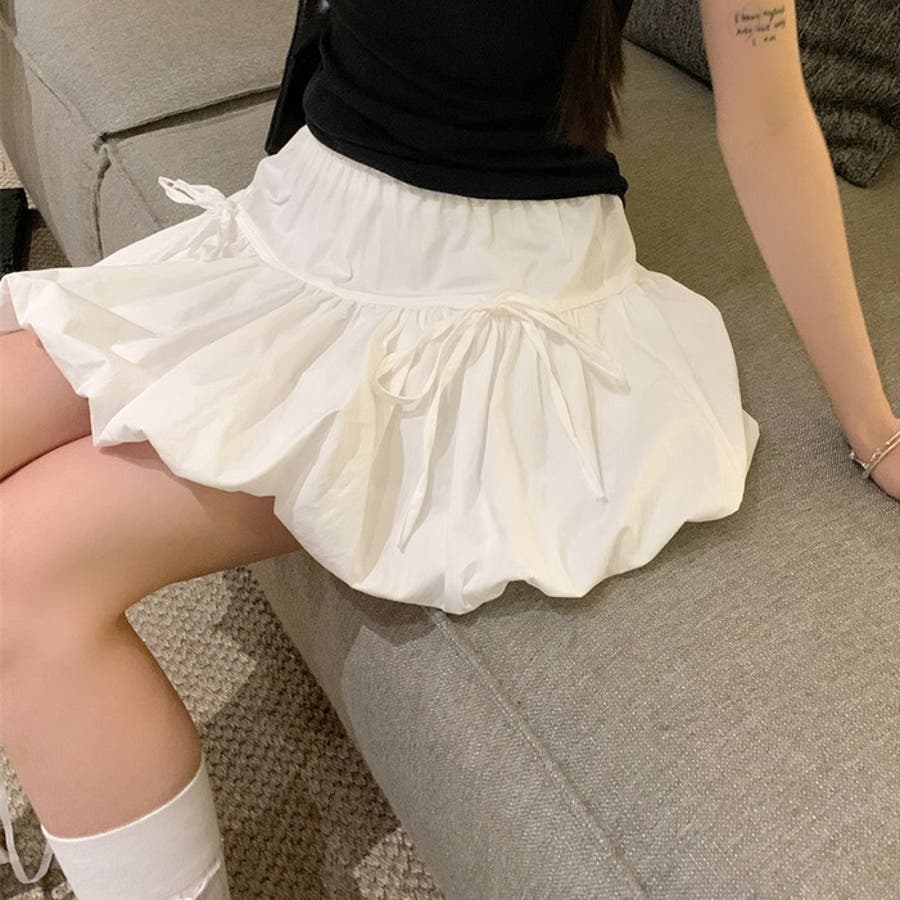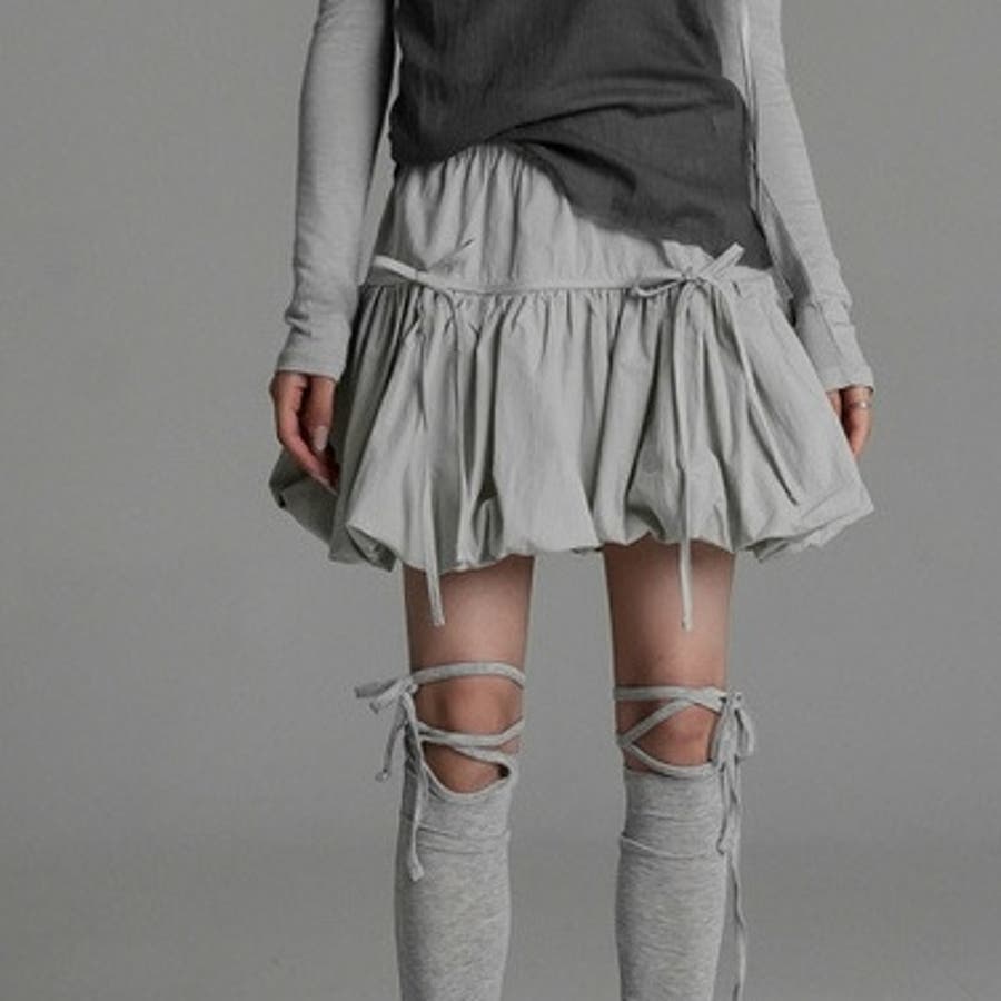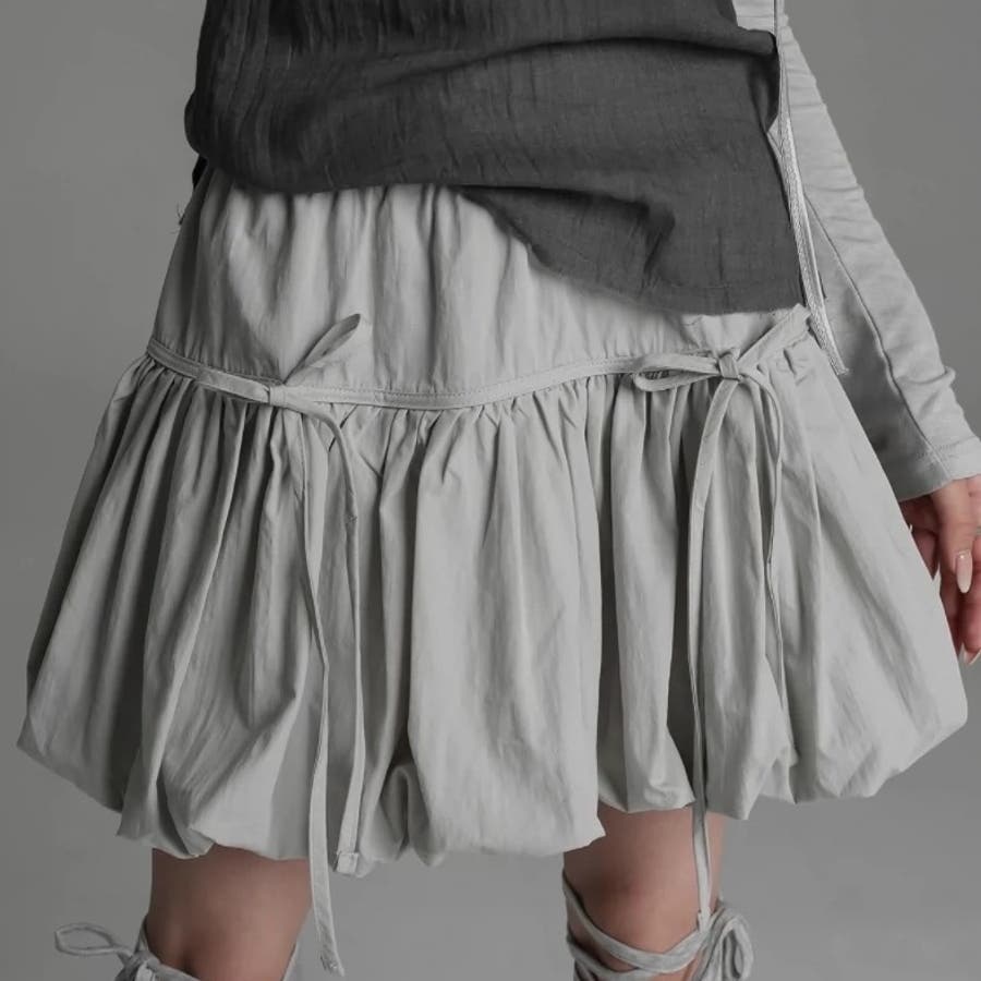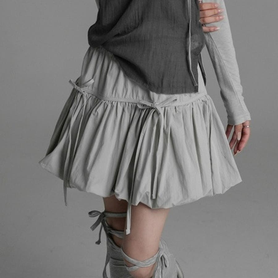 インナーパンツ付きフロントリボンバルーンナイロンフレアミニスカート