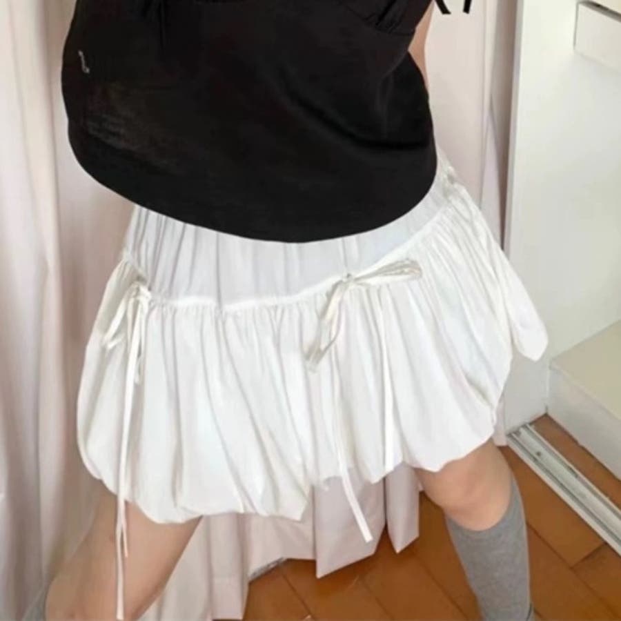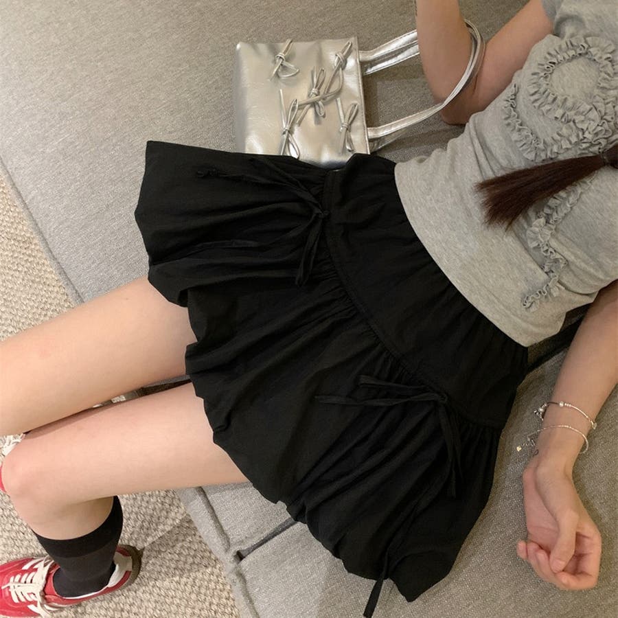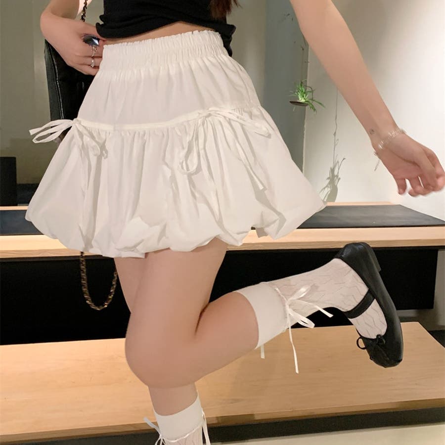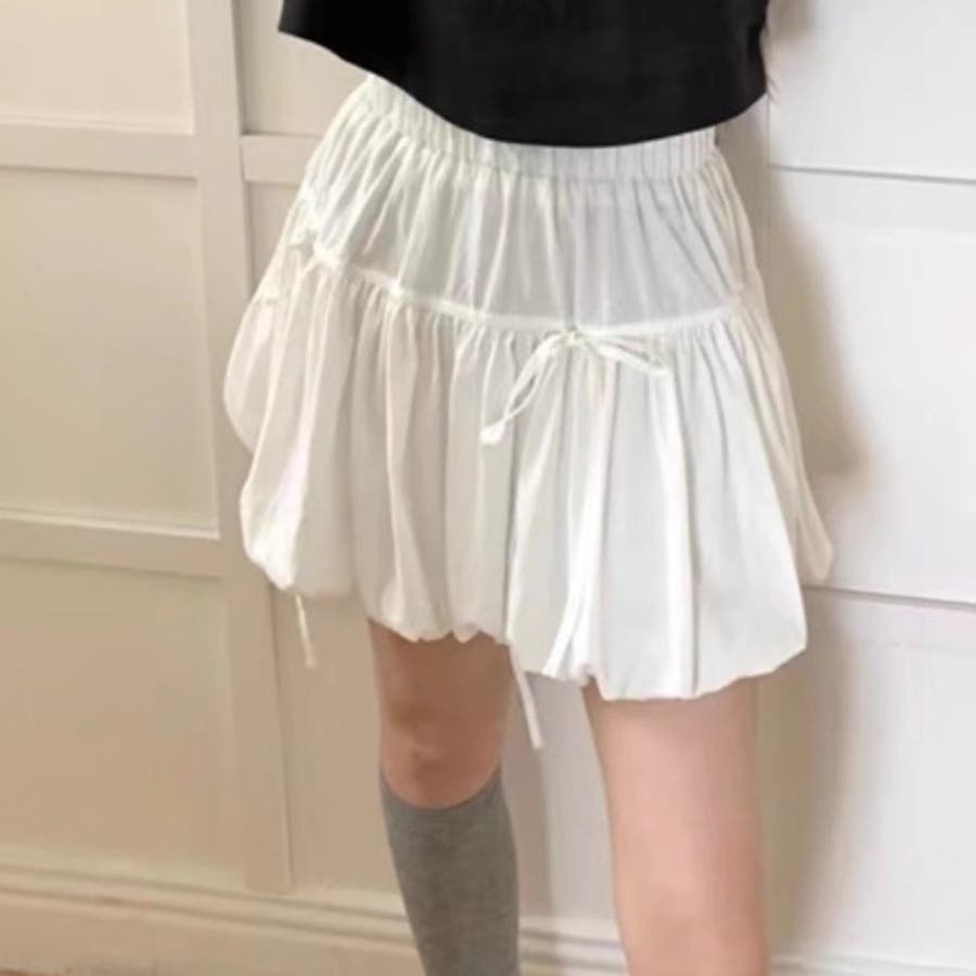 インナーパンツ付きフロントリボンバルーンナイロンフレアミニスカート