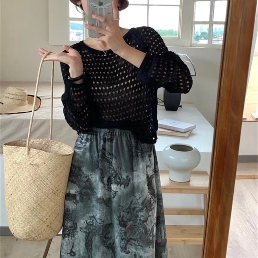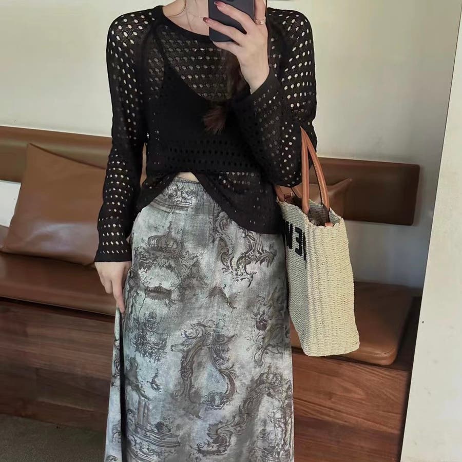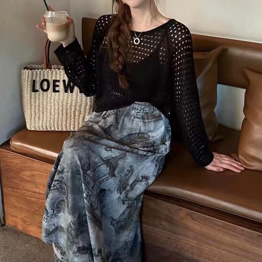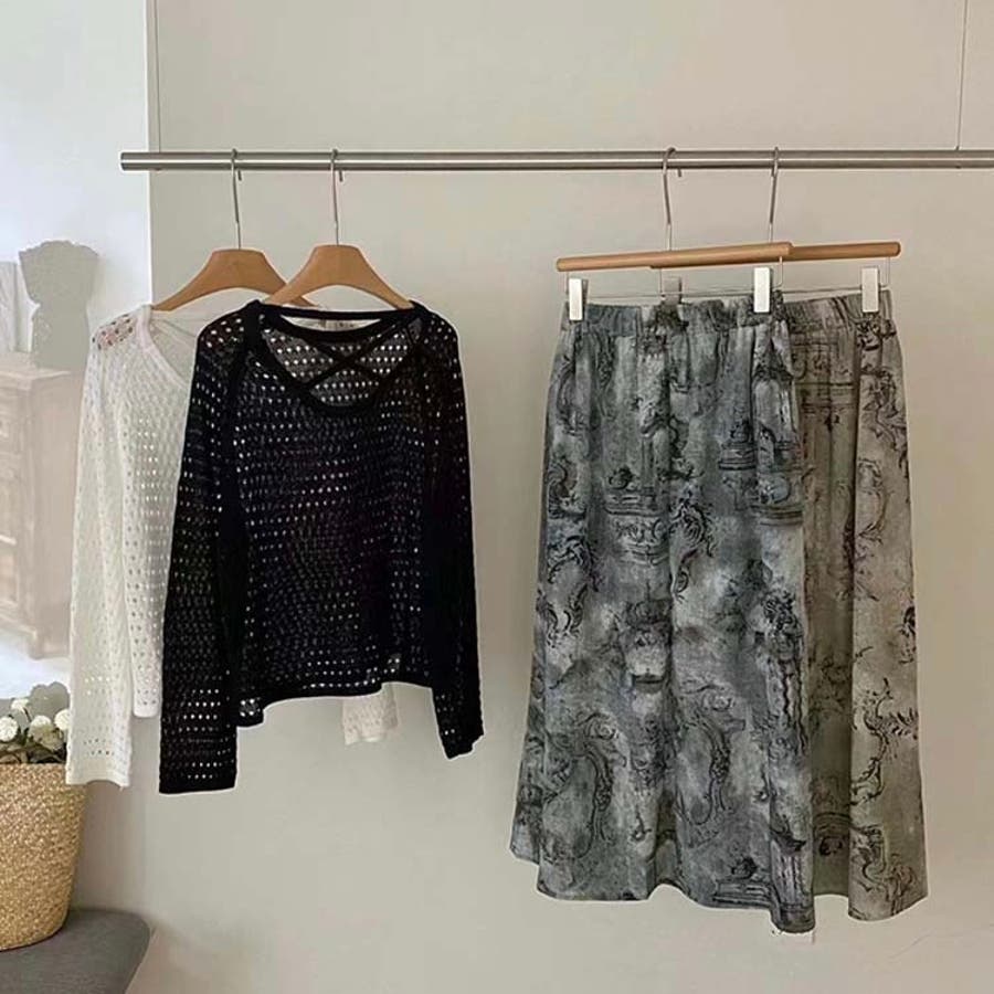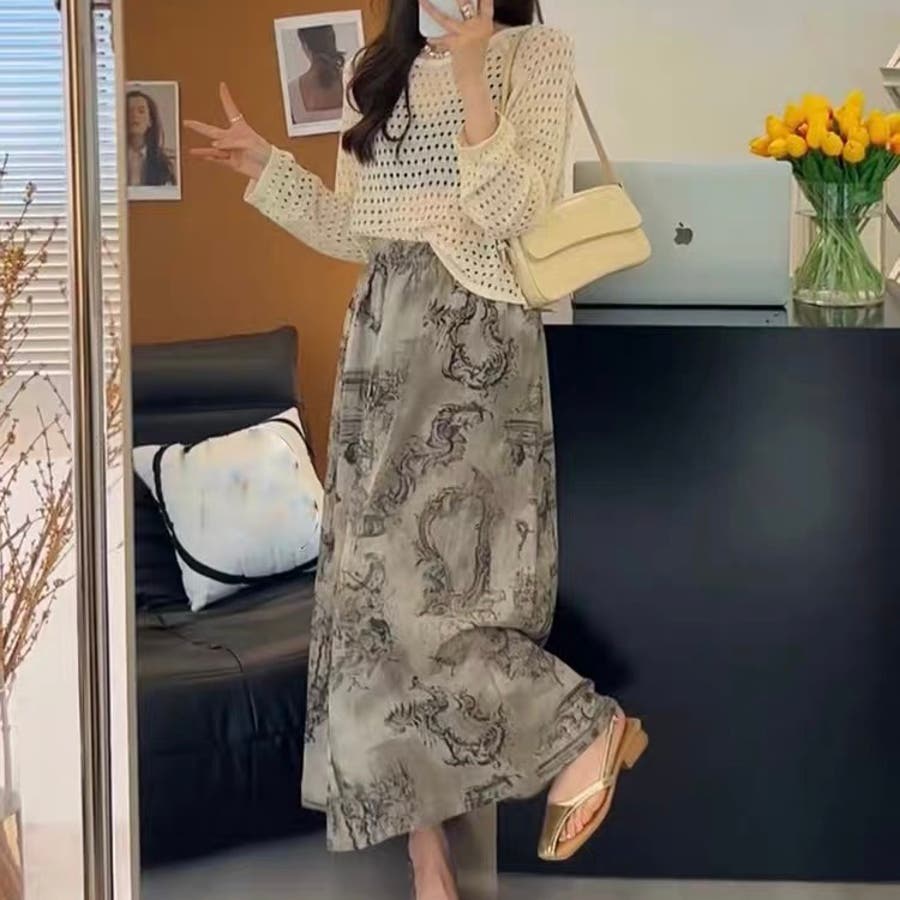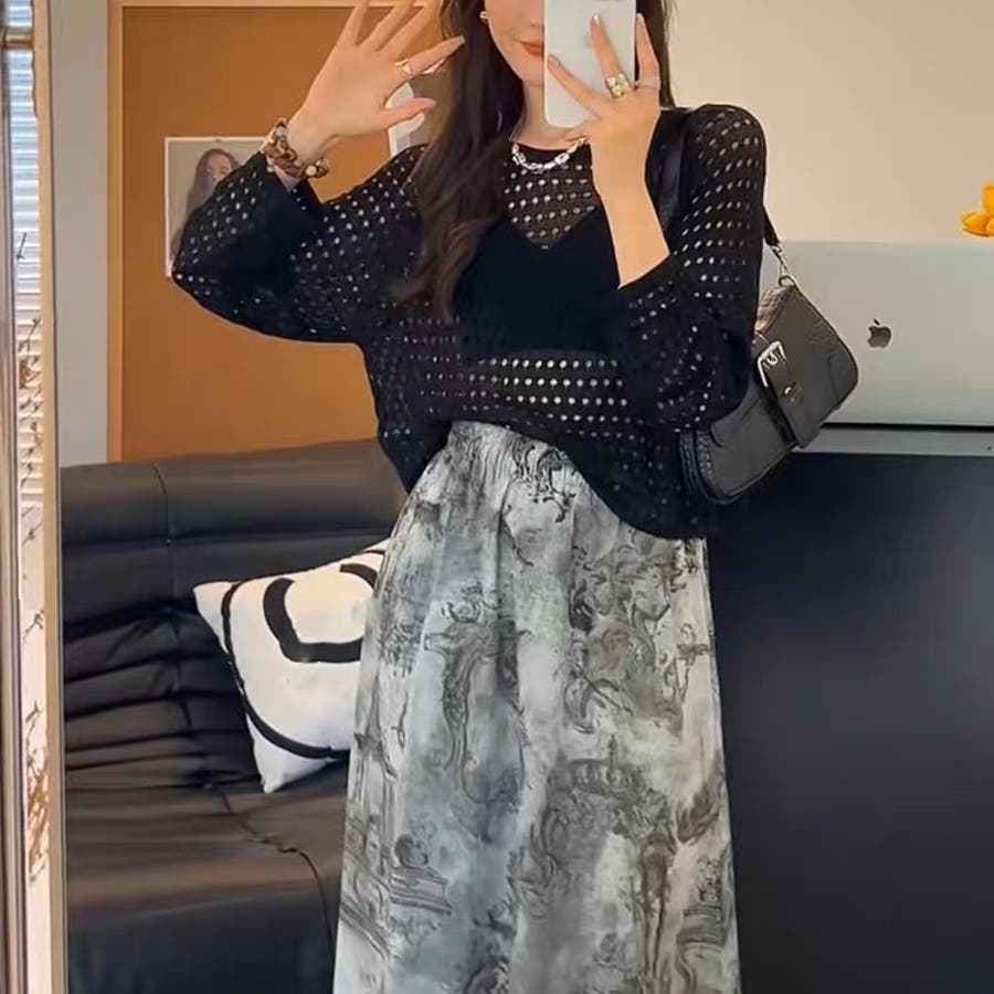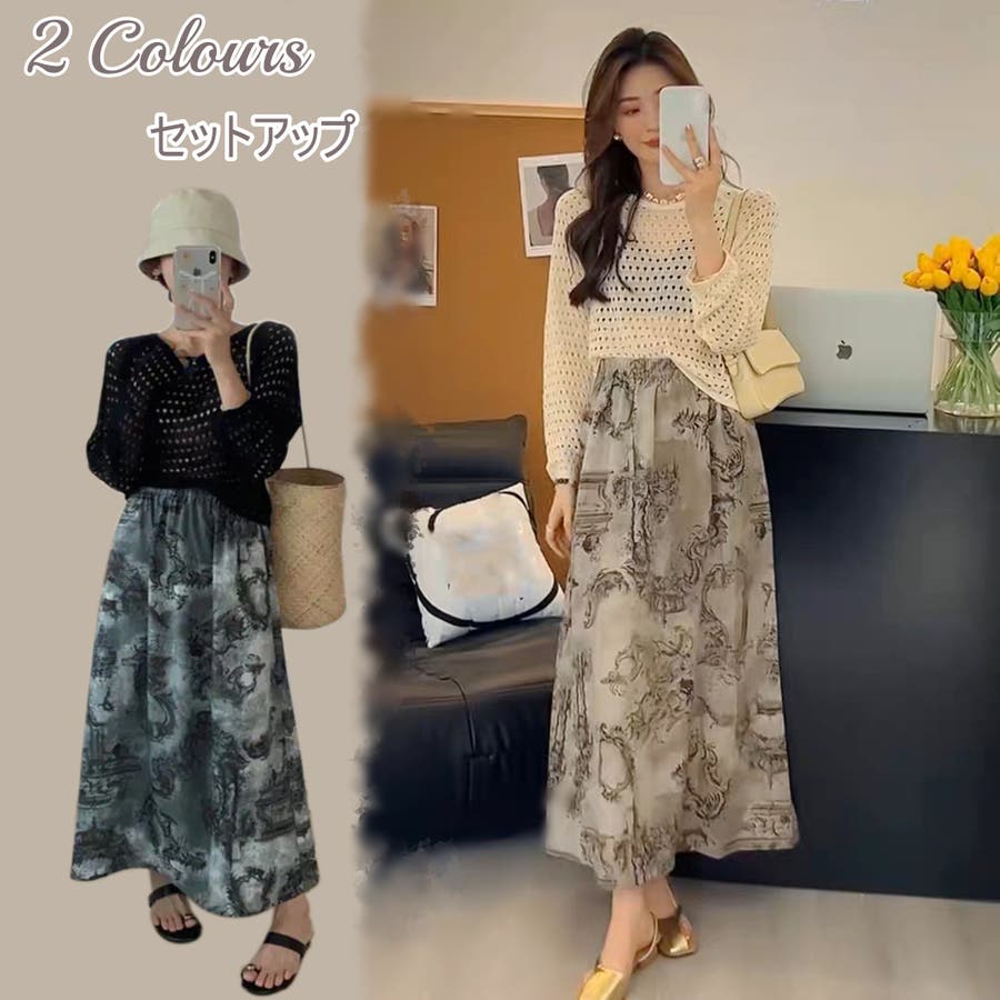 透かし編みトップス+画柄スカートセットアップ 夏服 韓国ファッション