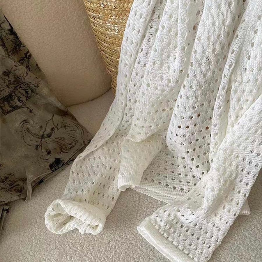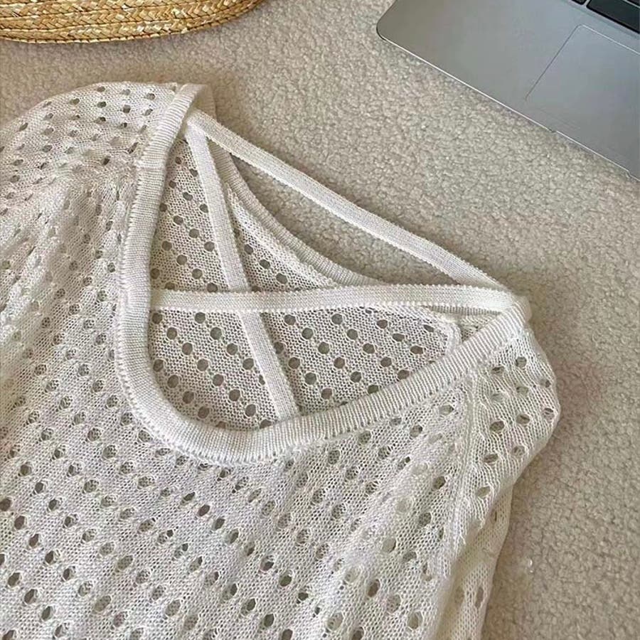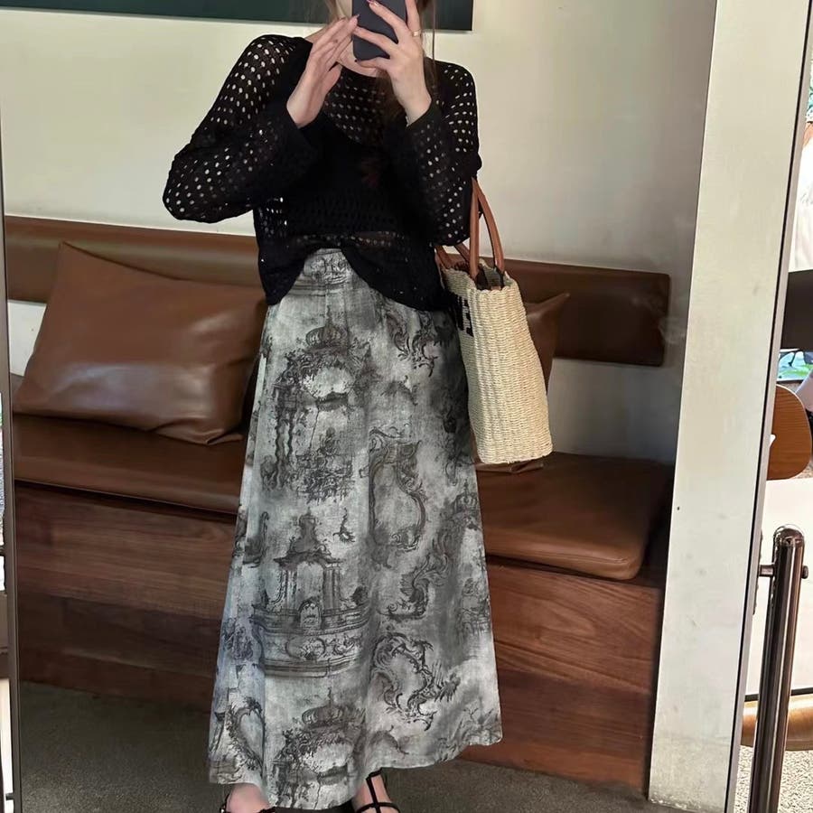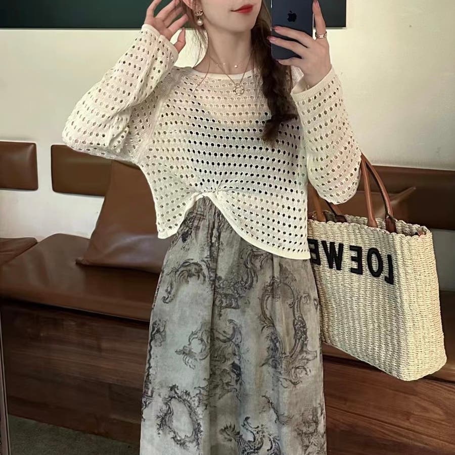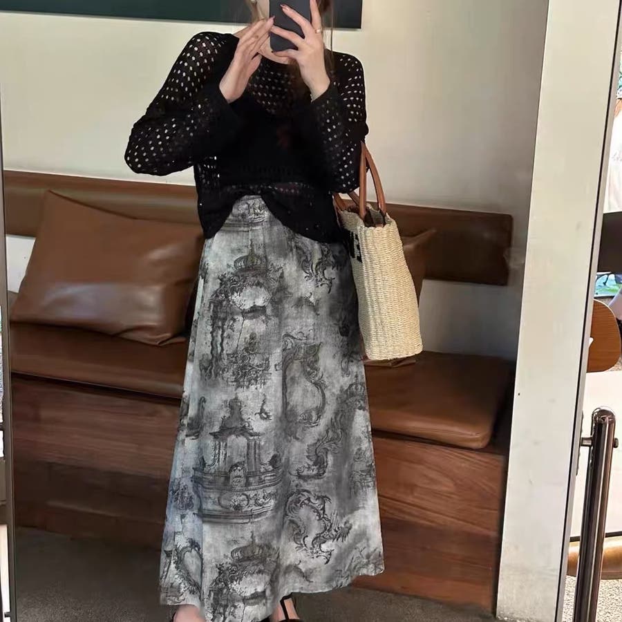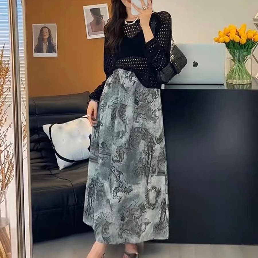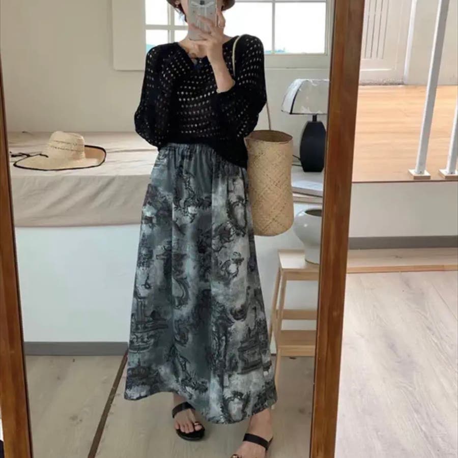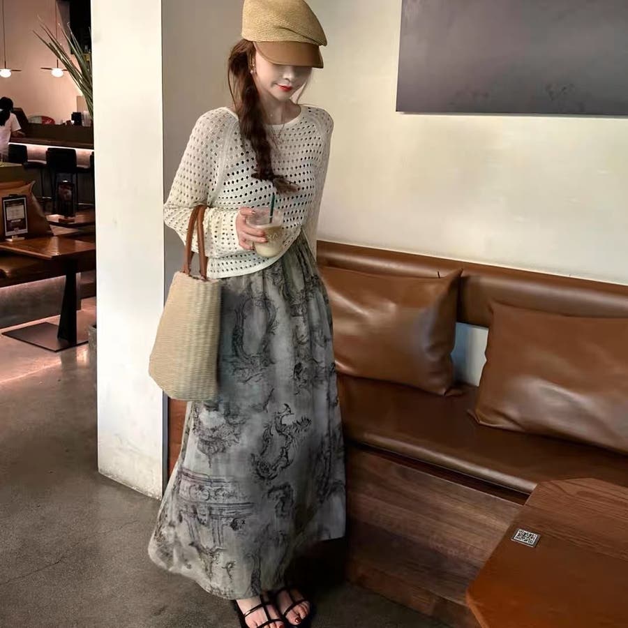 透かし編みトップス+画柄スカートセットアップ 夏服 韓国ファッション