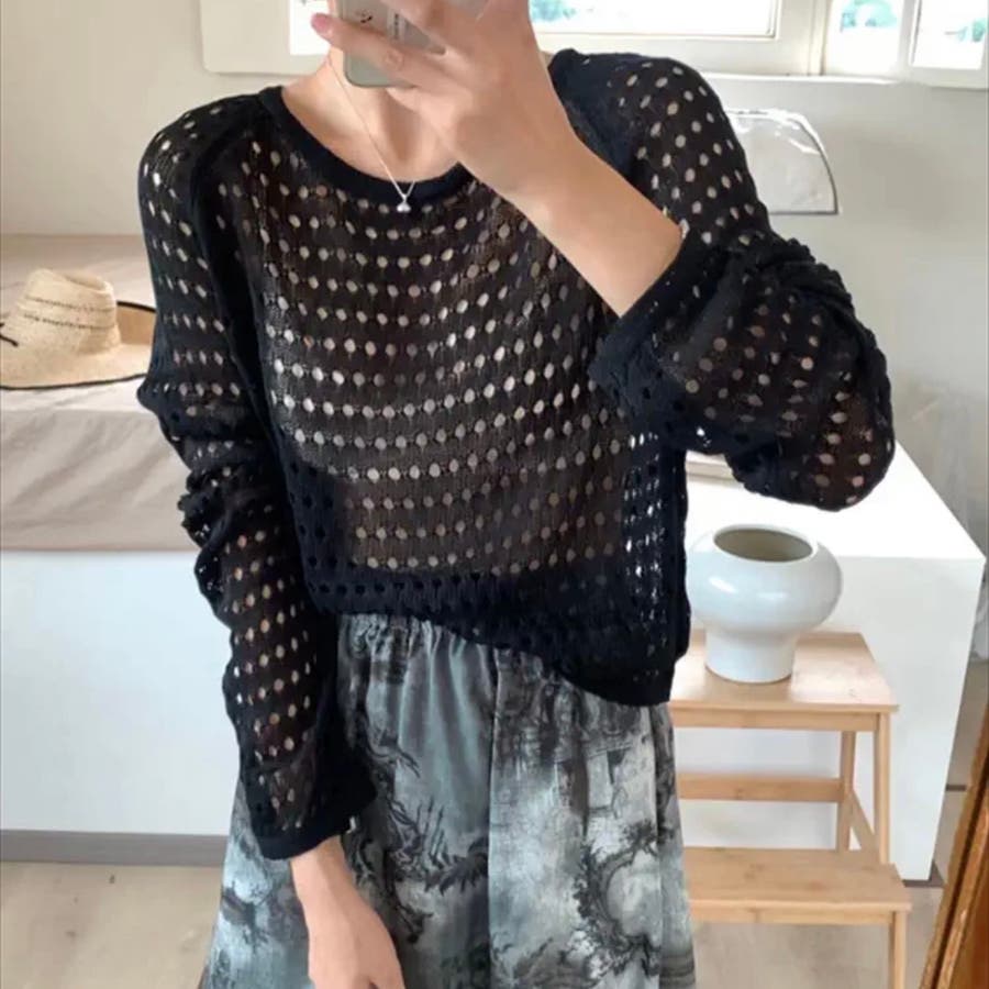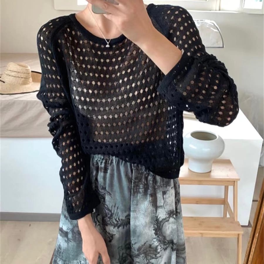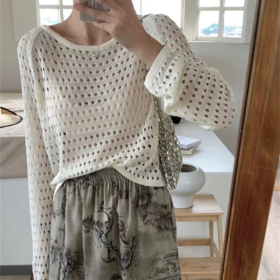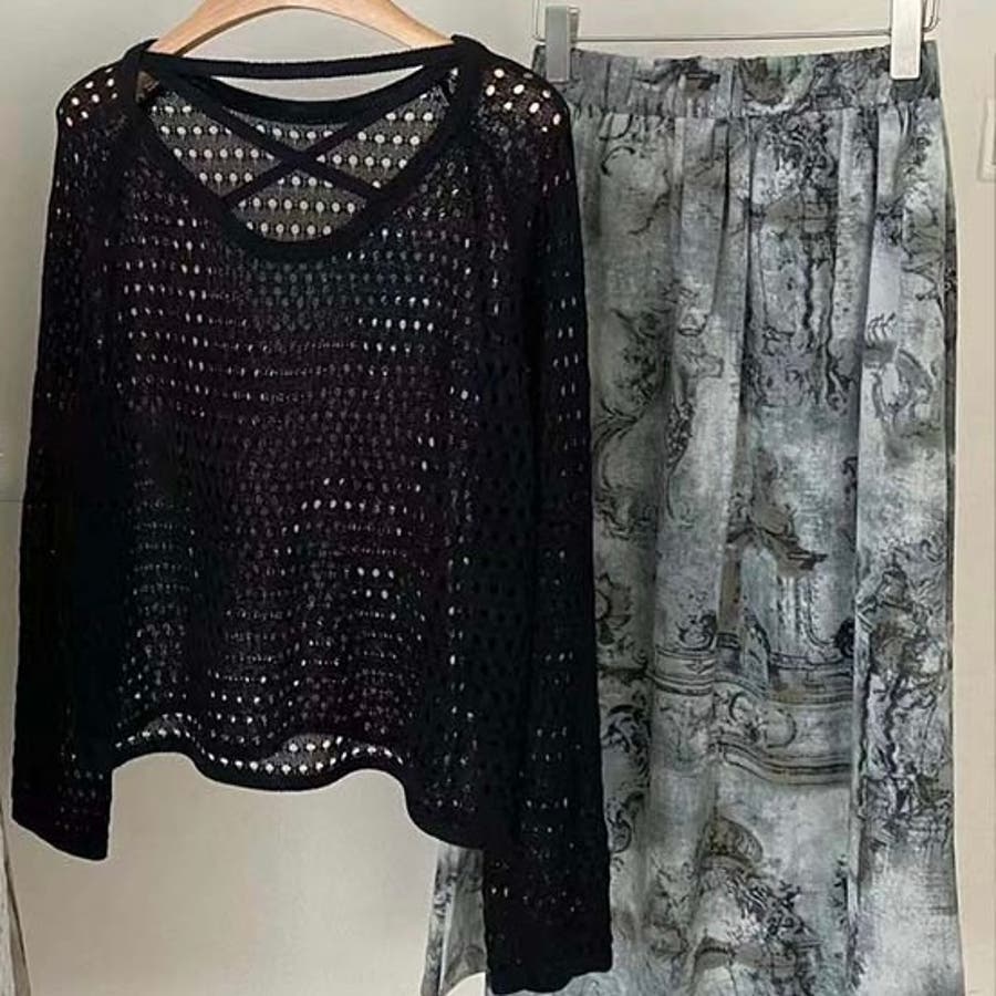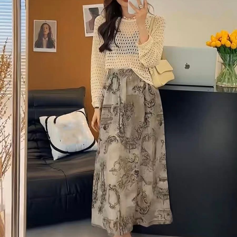 透かし編みニットトップス+ロングスカートのセットアイテム◎