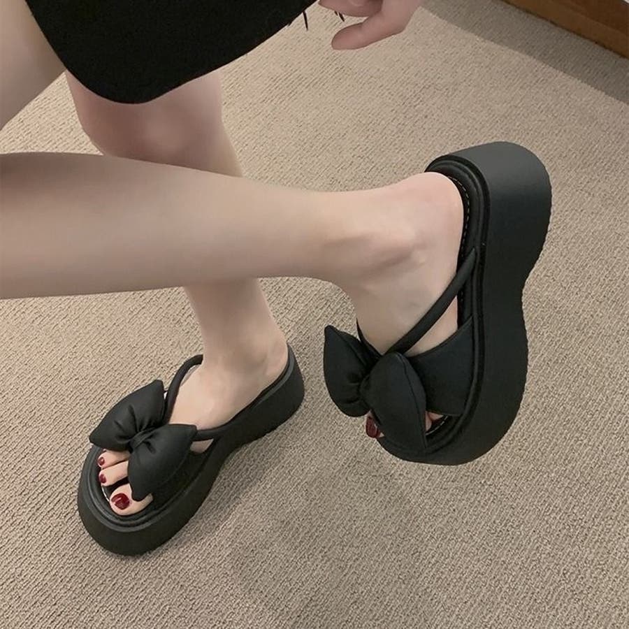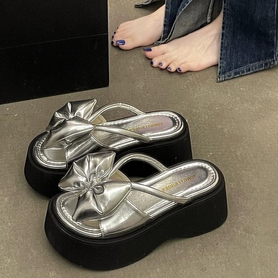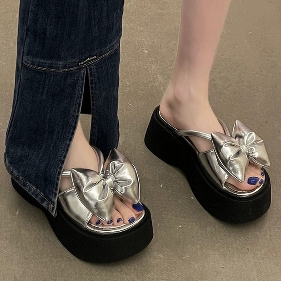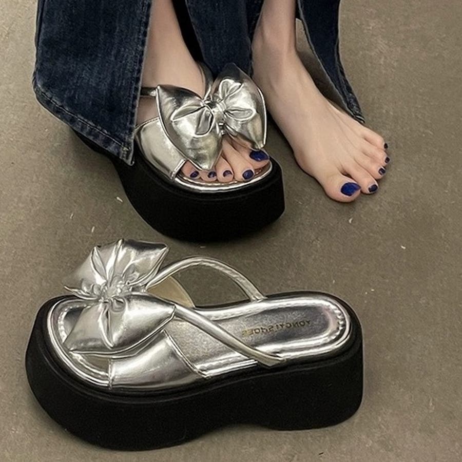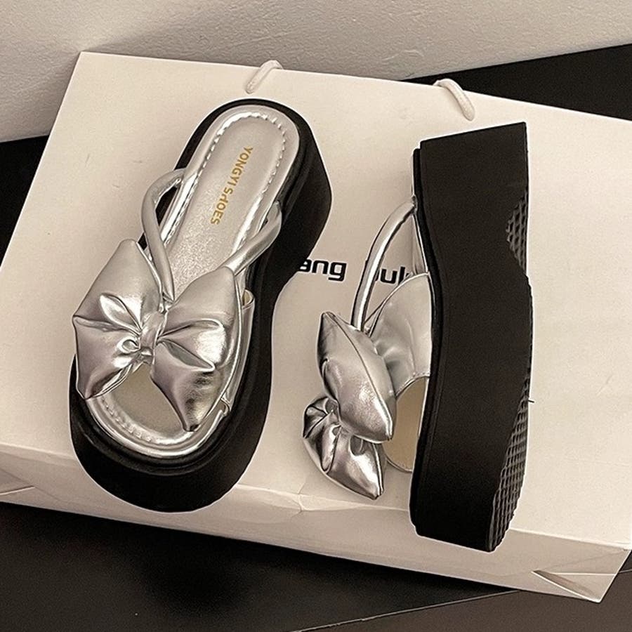 【シルバー】リボンサンダルレディース厚底靴 春 夏