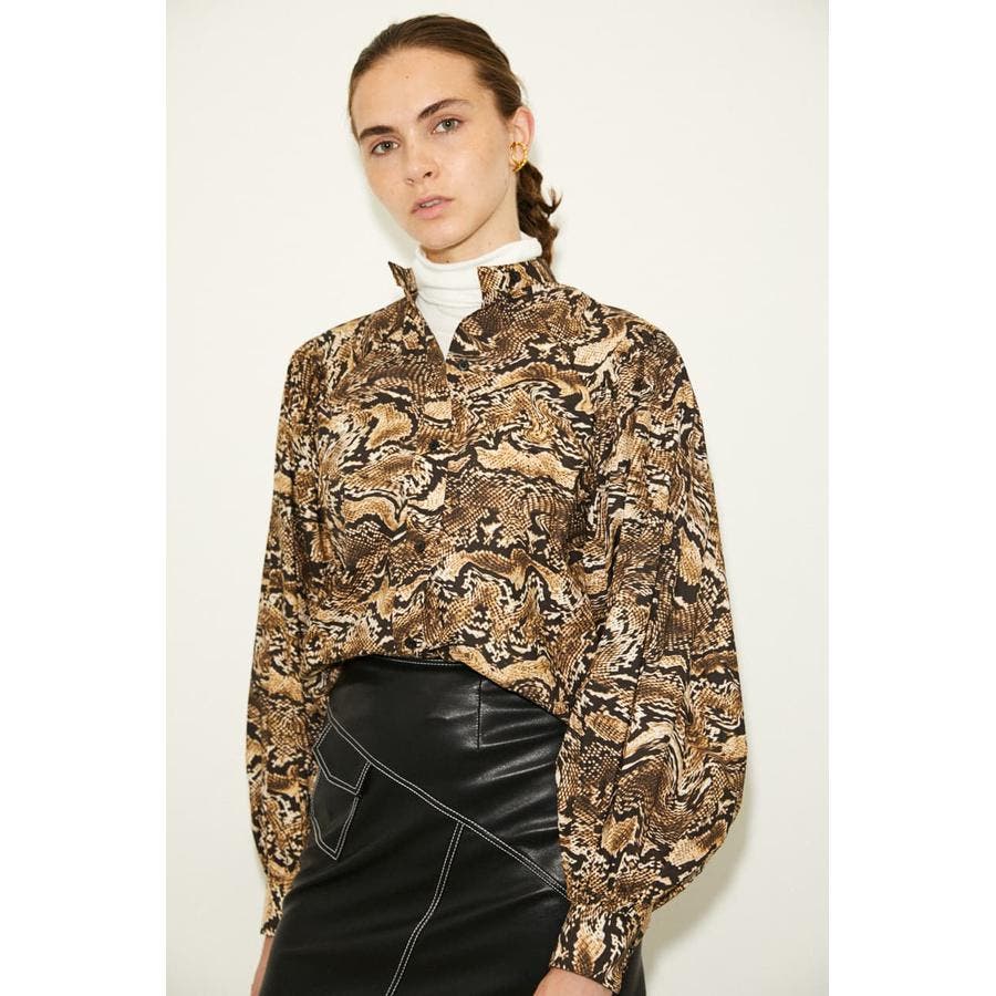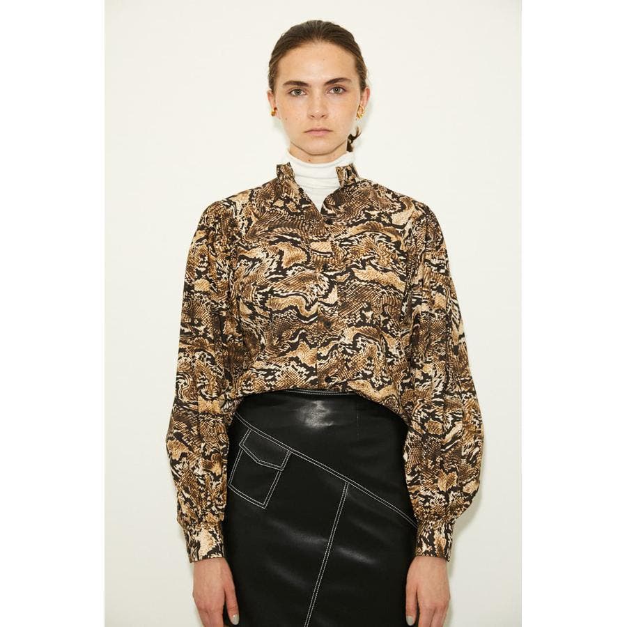 丸みのあるパフスリーブシルエットが女性らしい印象のシャツ。オリジナルでおこした目を惹く変形パイソン柄とデイリー使いしやすいWHTの2色展開。袖にボリュームがあるのでボトムはすっきりしたアイテムを合わせるバランスがおすすめ。