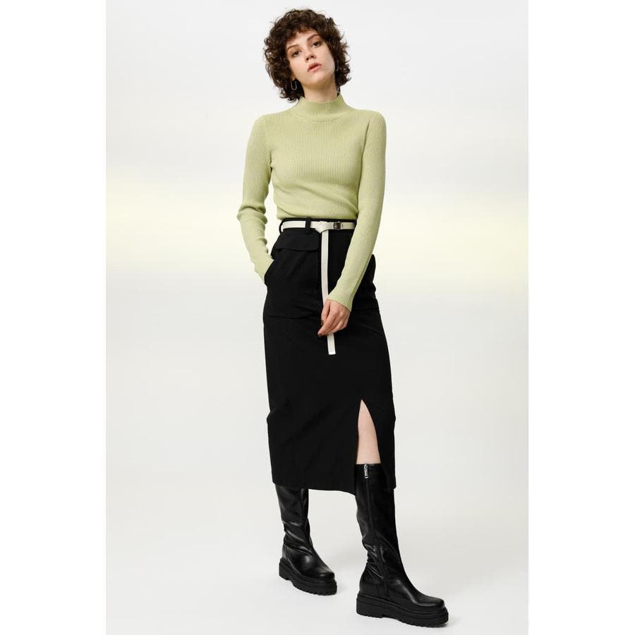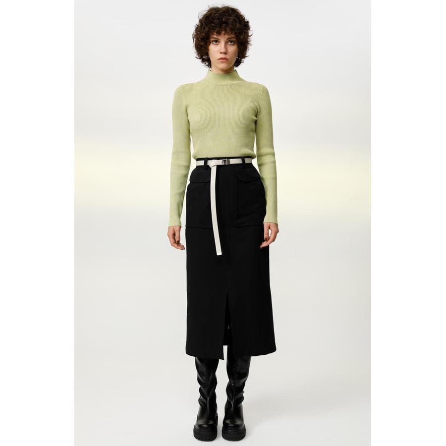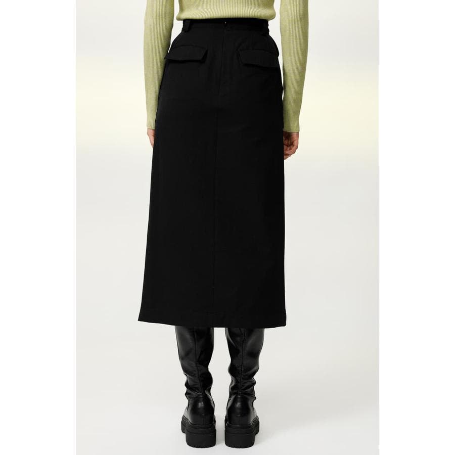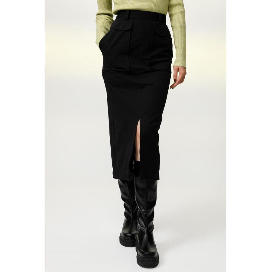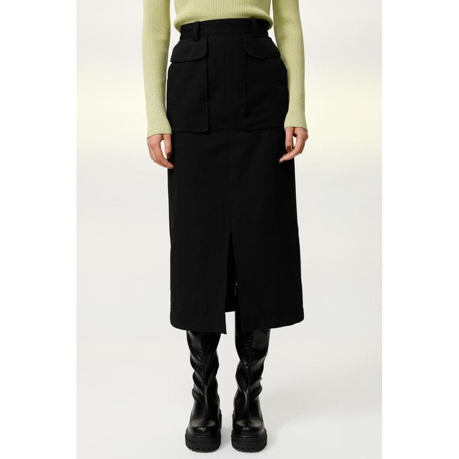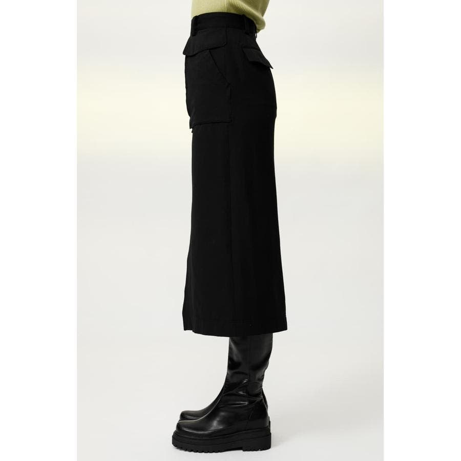 マチ付きのミリタリーライクなポケットが印象的なスカート。しなやかでハリ感のある綺麗な面の生地を使用しているため、カジュアルになりすぎず、トップスを選ばずスタイリングを楽しめます。裾のスリットが女性らしいシルエットを引き立てます。あえて今シーズンは、甘めのトップスをニーブーツと合わせて辛めのスタイリングに仕上げるのがオススメ。