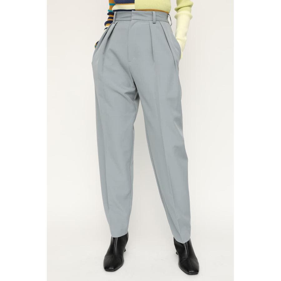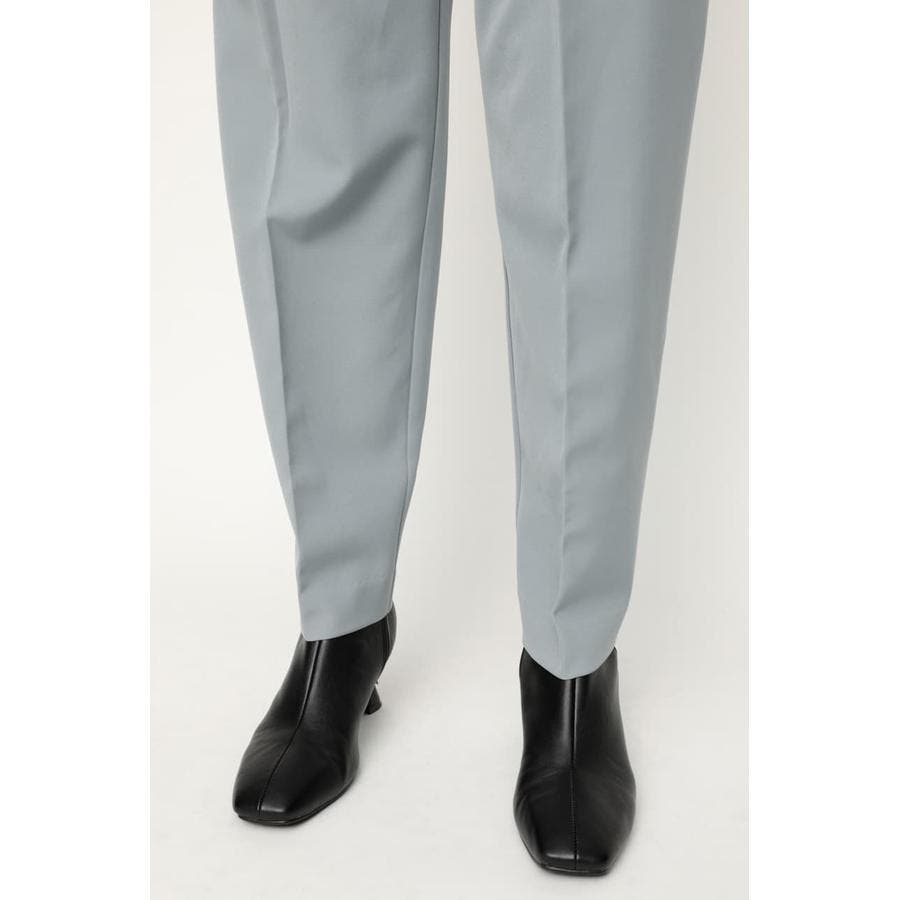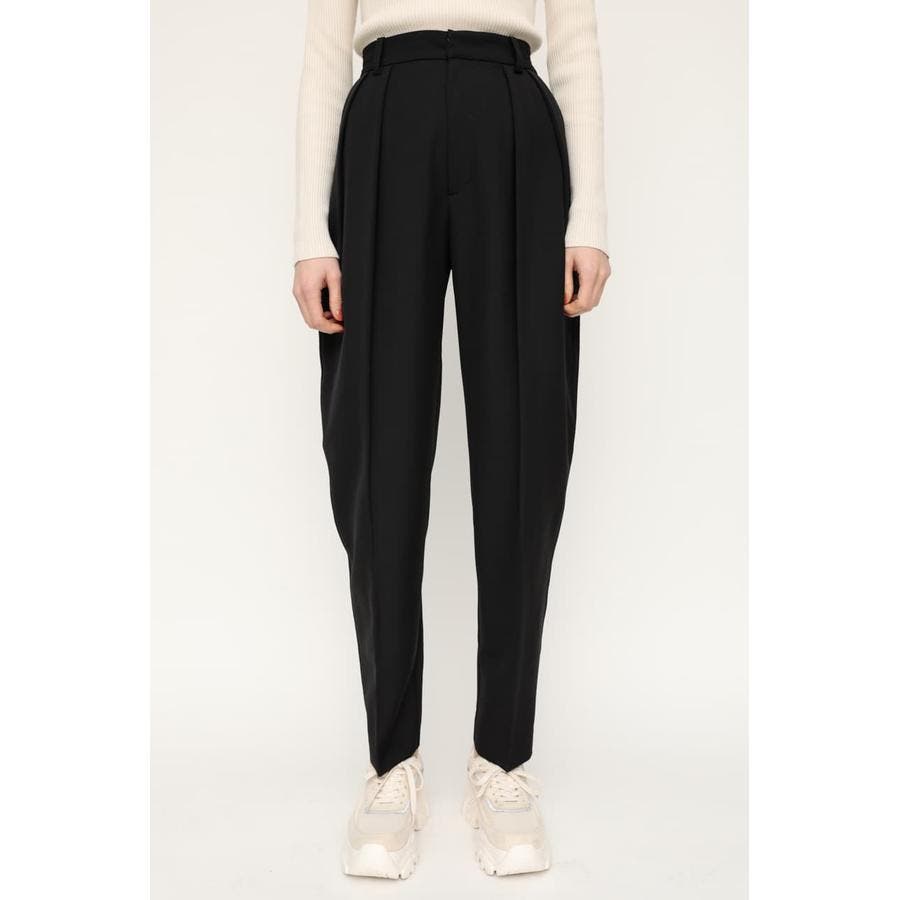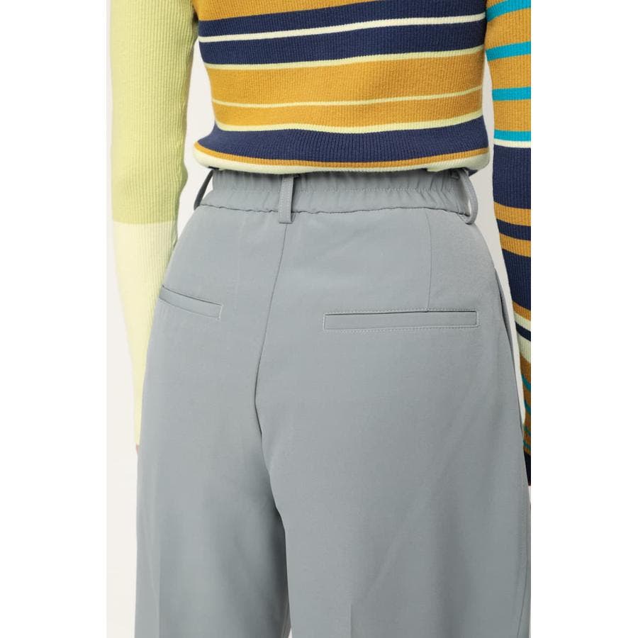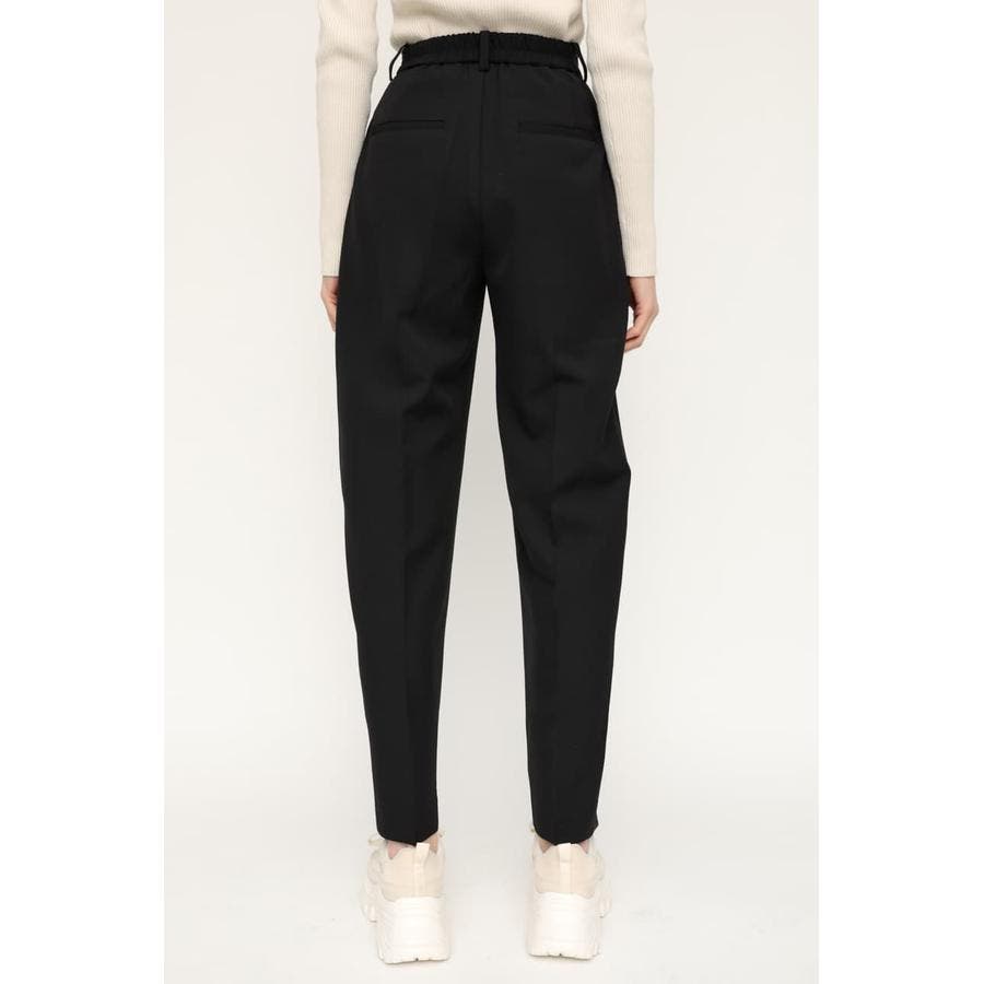 スーツ地を使用した程よい太さのテーパードパンツ。マニッシュな印象でありながら、後ウエストがゴム仕様になっているので履き心地も良く長時間履いても疲れません。トップスもボリュームのあるニットからコンパクトなトップスまで万能に使いまわせるアイテムです。