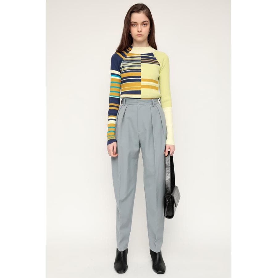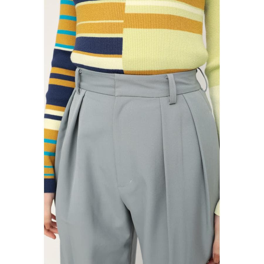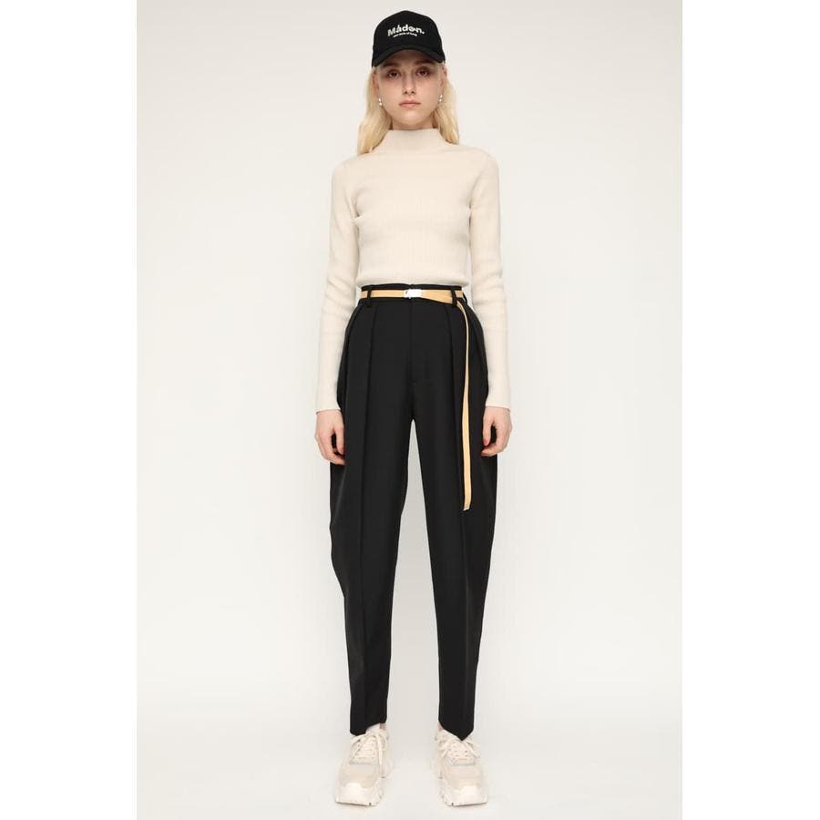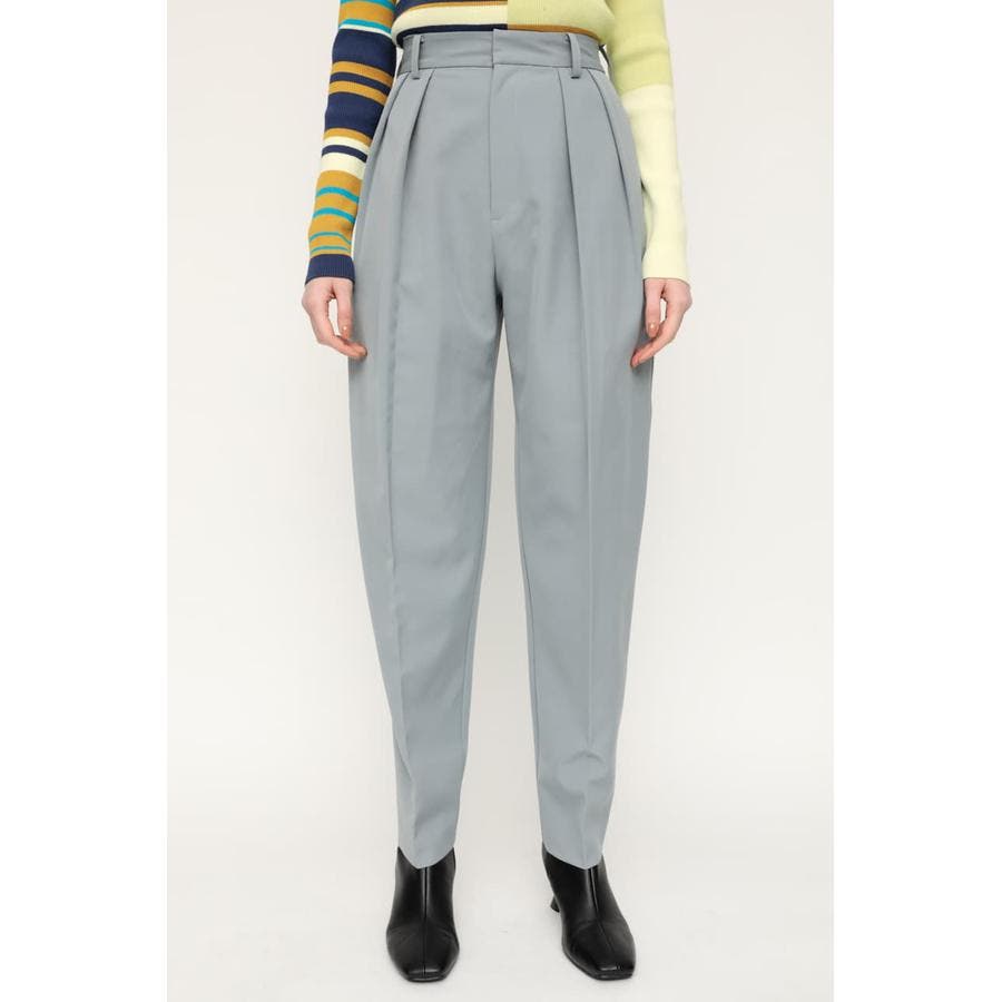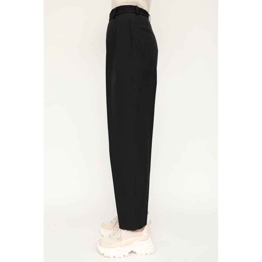 スーツ地を使用した程よい太さのテーパードパンツ。マニッシュな印象でありながら、後ウエストがゴム仕様になっているので履き心地も良く長時間履いても疲れません。トップスもボリュームのあるニットからコンパクトなトップスまで万能に使いまわせるアイテムです。