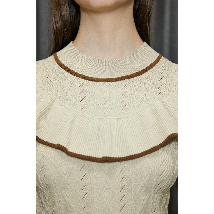 肌触りの良いコットンにナイロン糸を加えた程よいストレッチ性のある素材を使用したトップス。オリジナルで編み起こした柄とカラーによってバイカラーになっているのもポイントです。