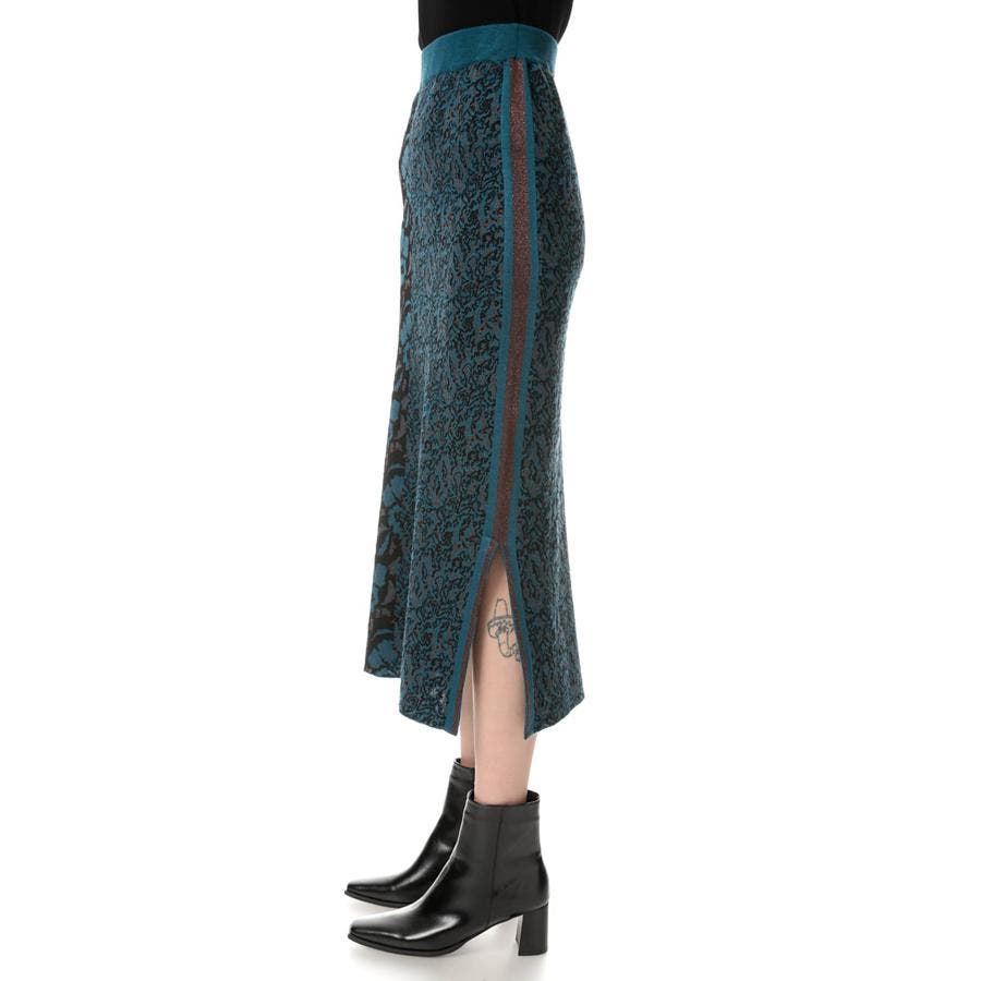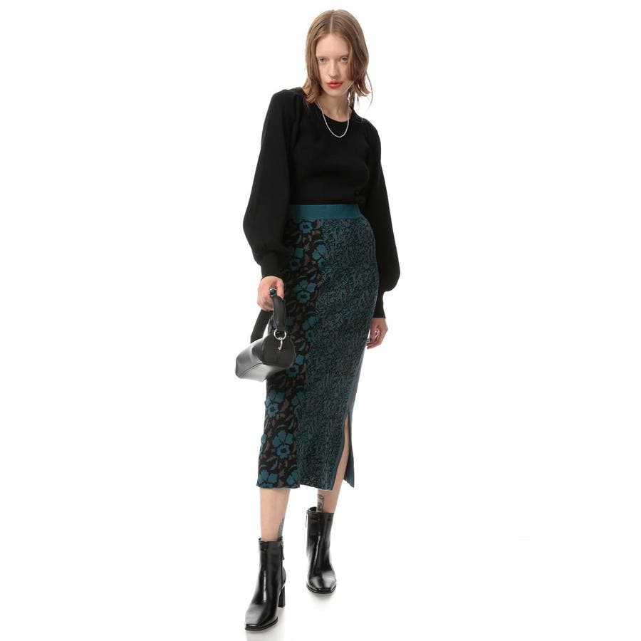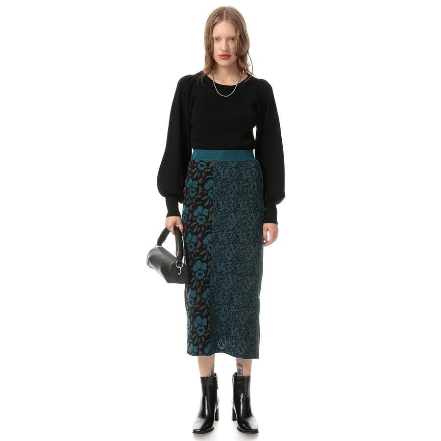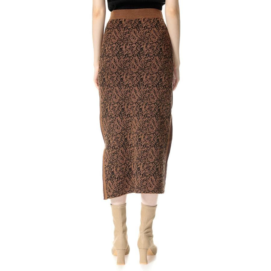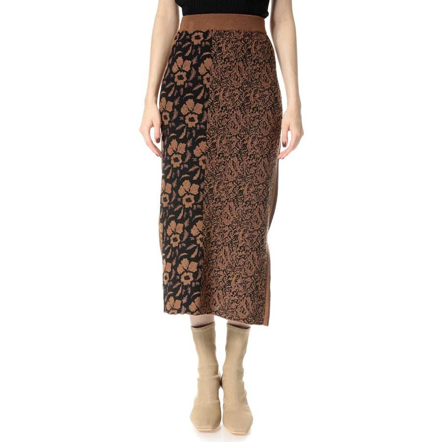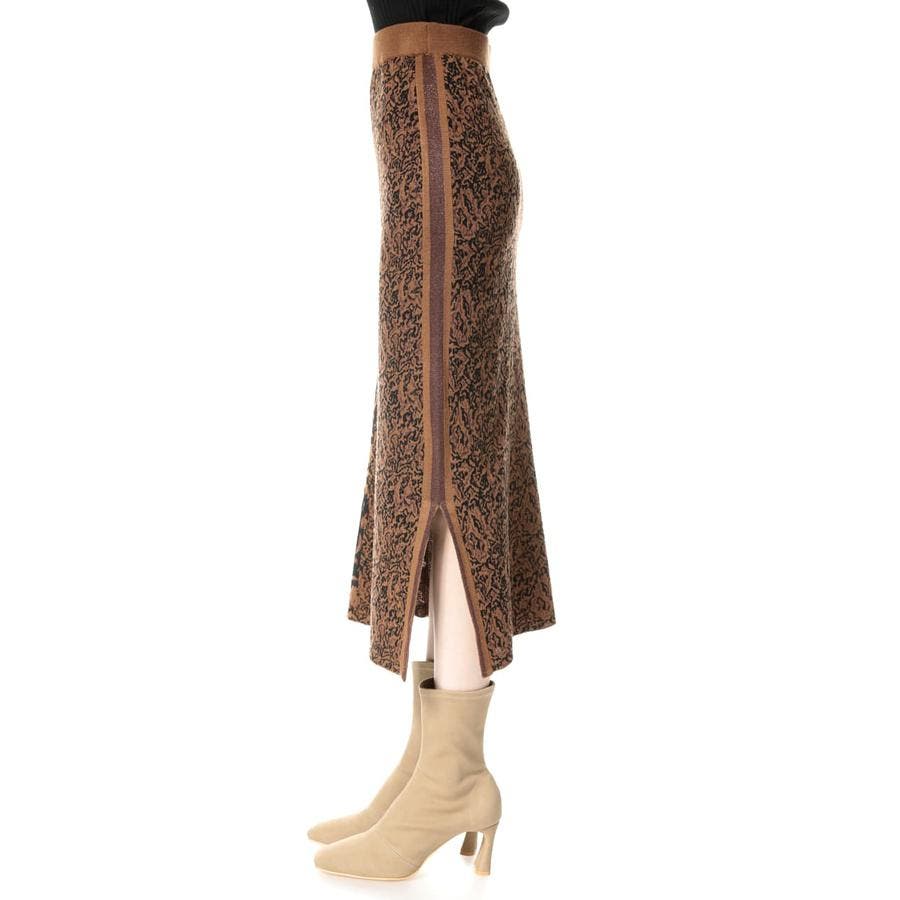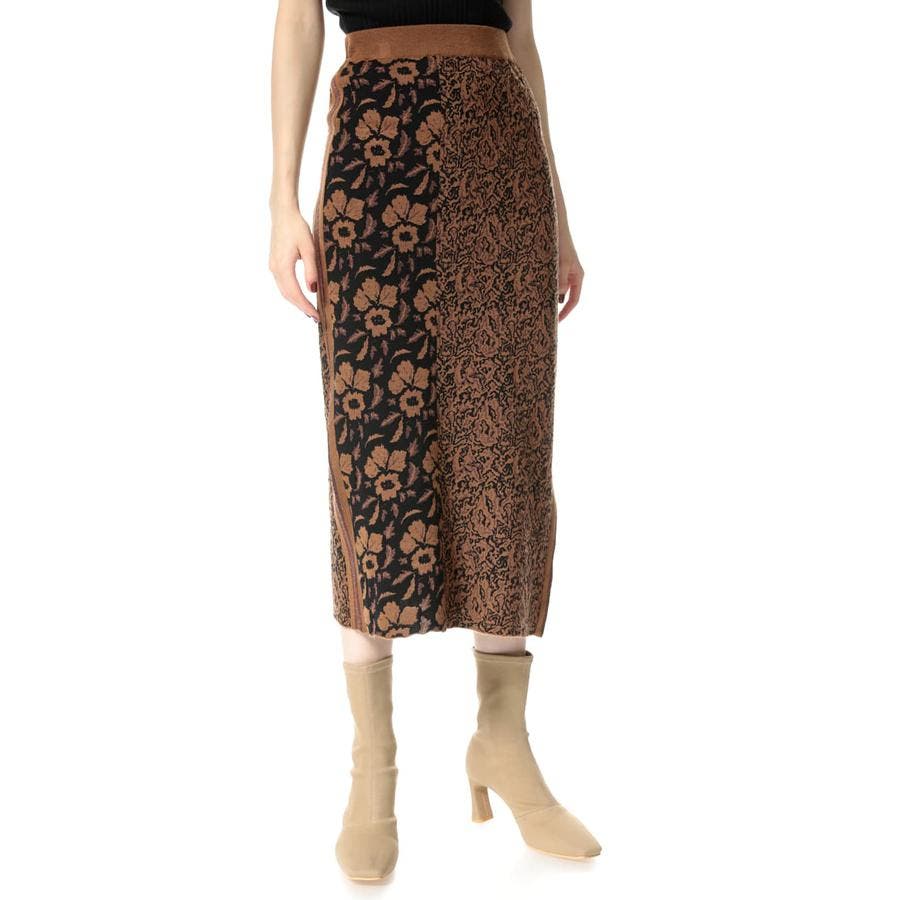 SLYオリジナル柄のジャガードニットスカート。部分的にラメ糸を混ぜているので上品な光沢感がある柄に仕上がっています。フロント部分は2つの柄を使用し、パッチワークになっているようなデザインがポイント。