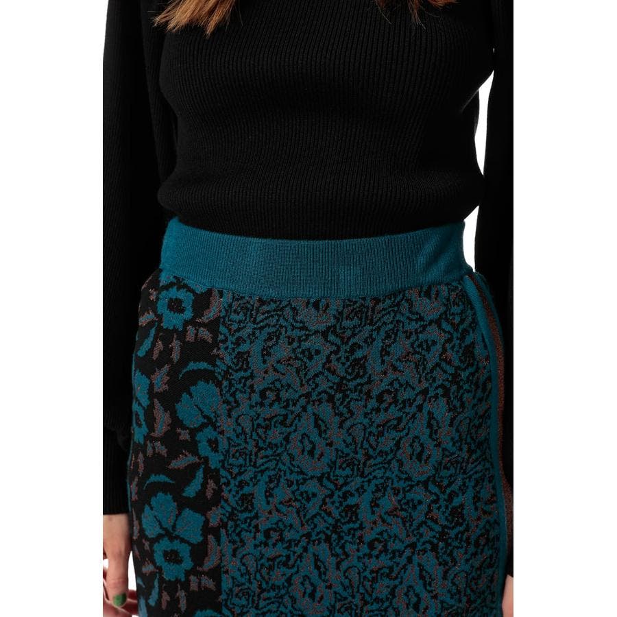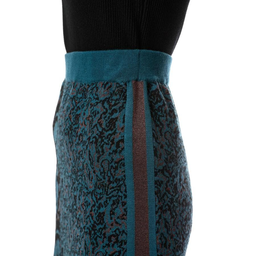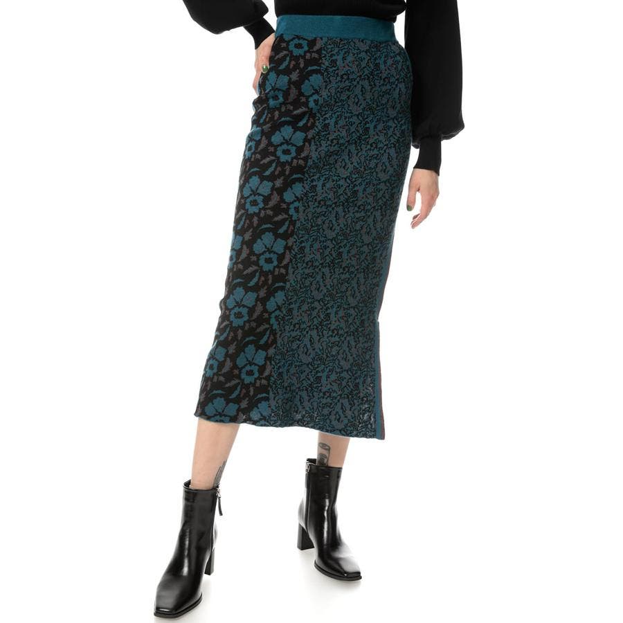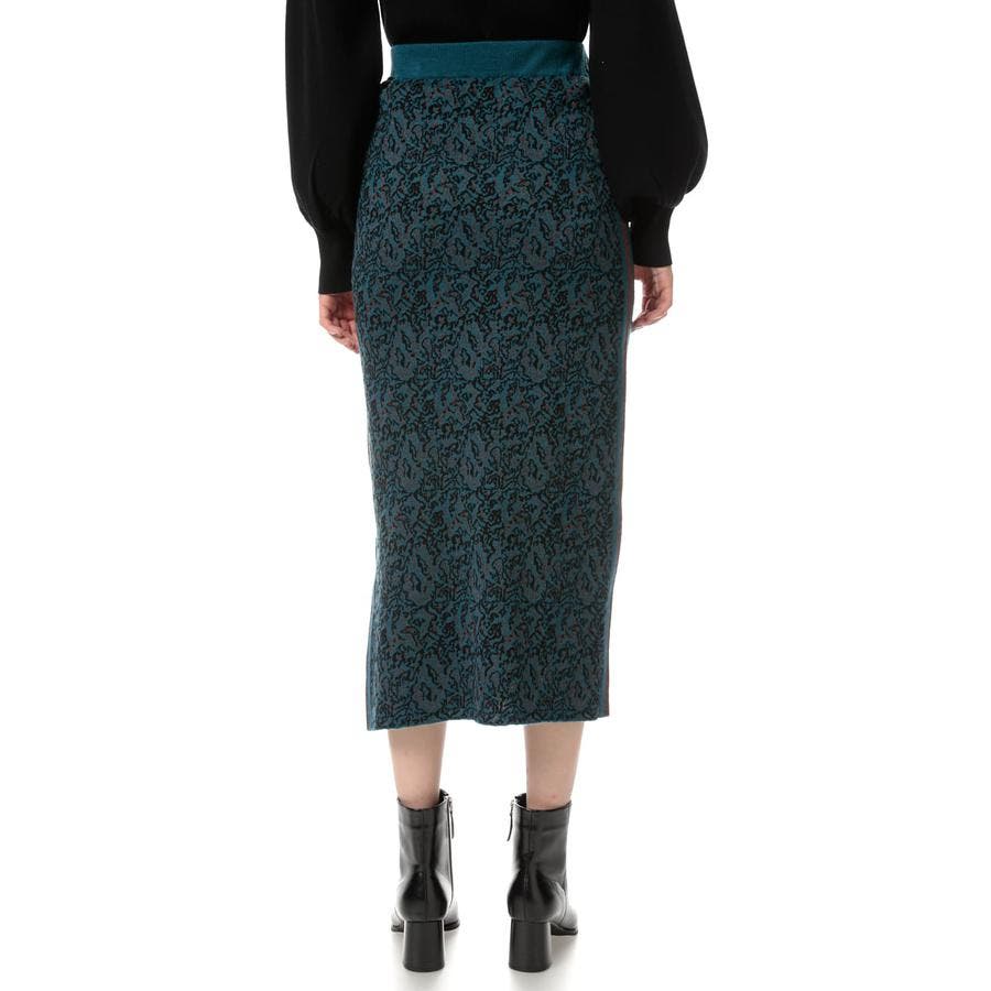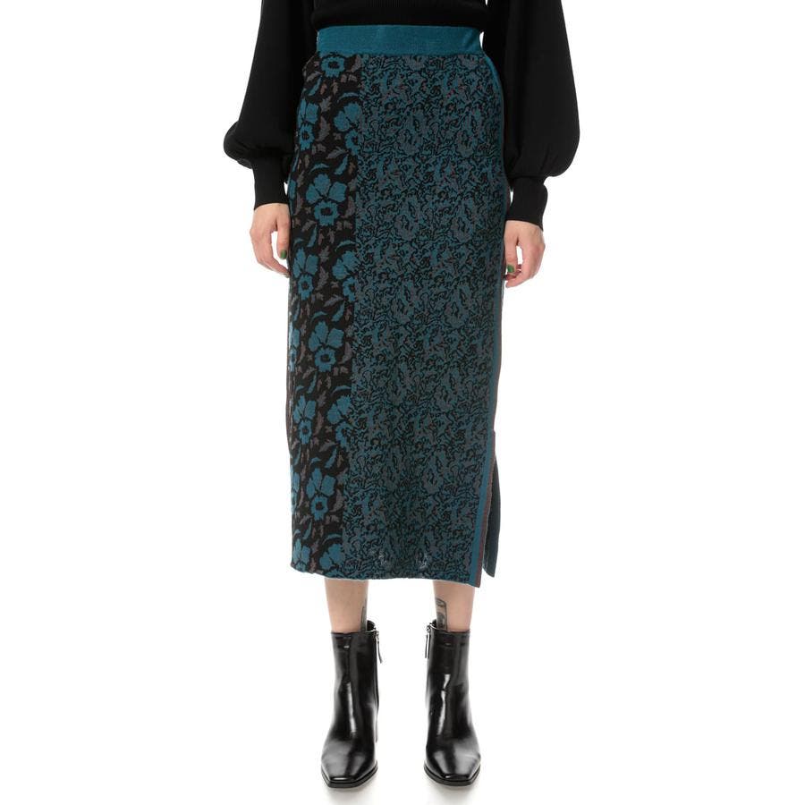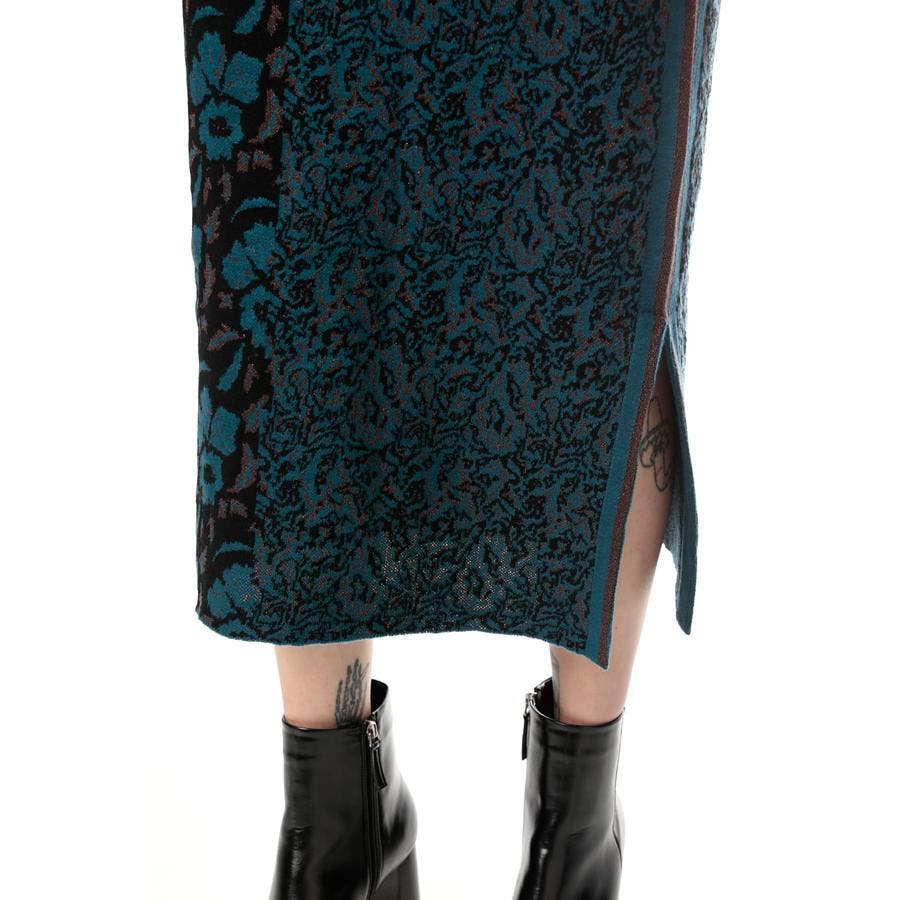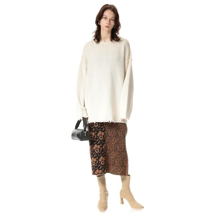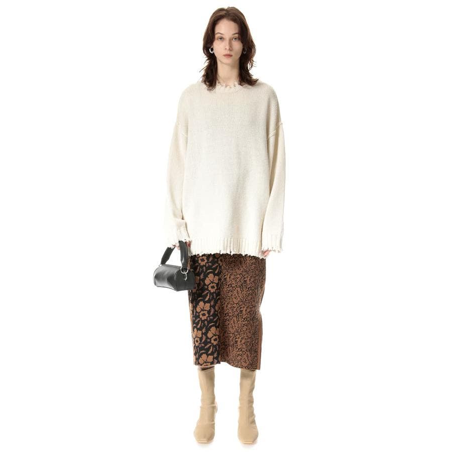 SLYオリジナル柄のジャガードニットスカート。部分的にラメ糸を混ぜているので上品な光沢感がある柄に仕上がっています。フロント部分は2つの柄を使用し、パッチワークになっているようなデザインがポイント。