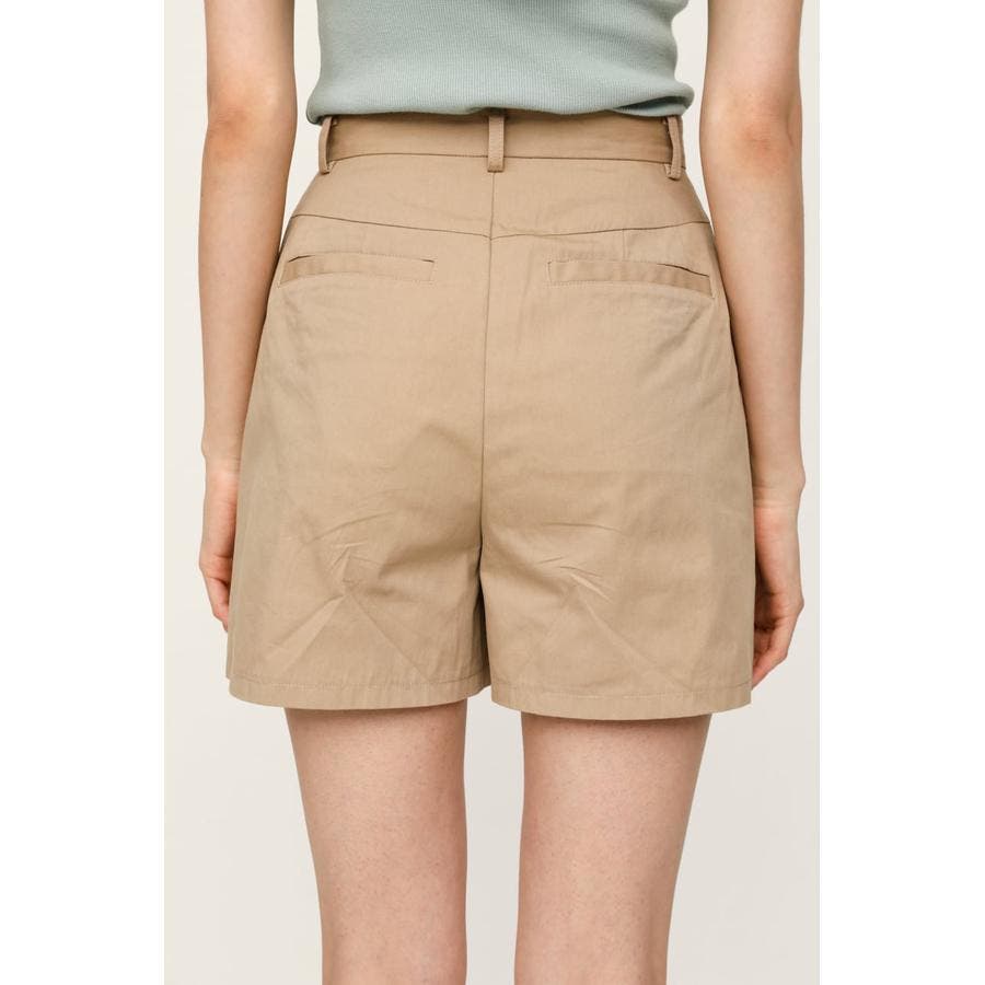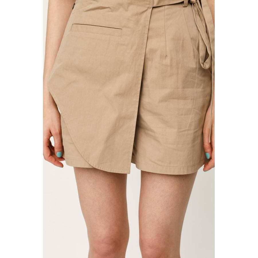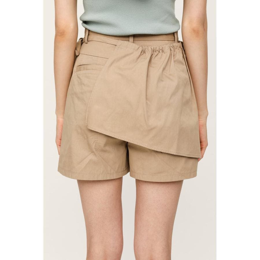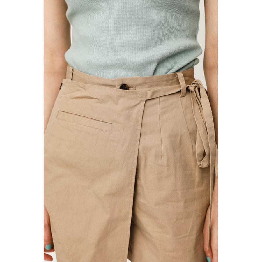 ラップの飾りベルトが付いているショートパンツ。2WAYなのでコーディネートの幅が広がるアイテム。ラップベルトは紐を絞って後ろにギャザーを作って着用します。