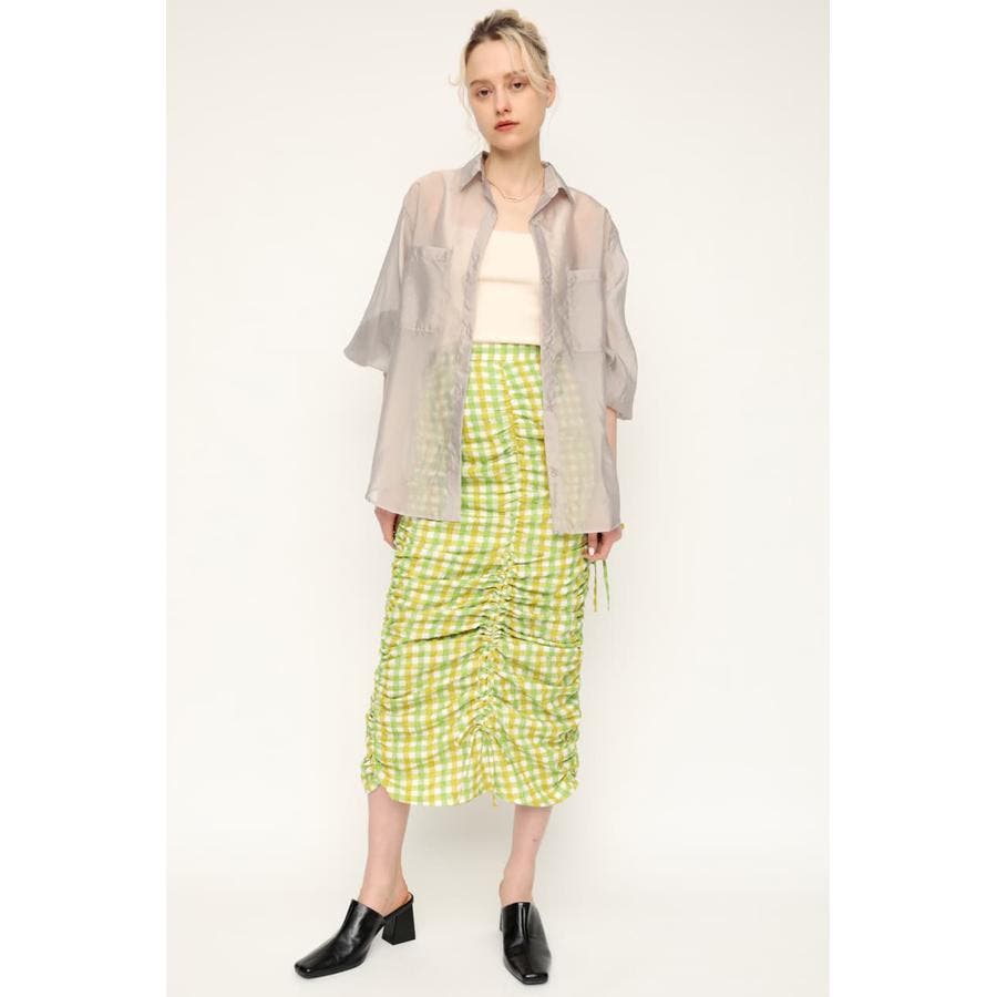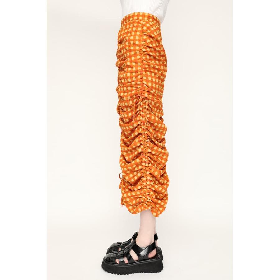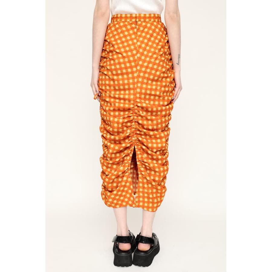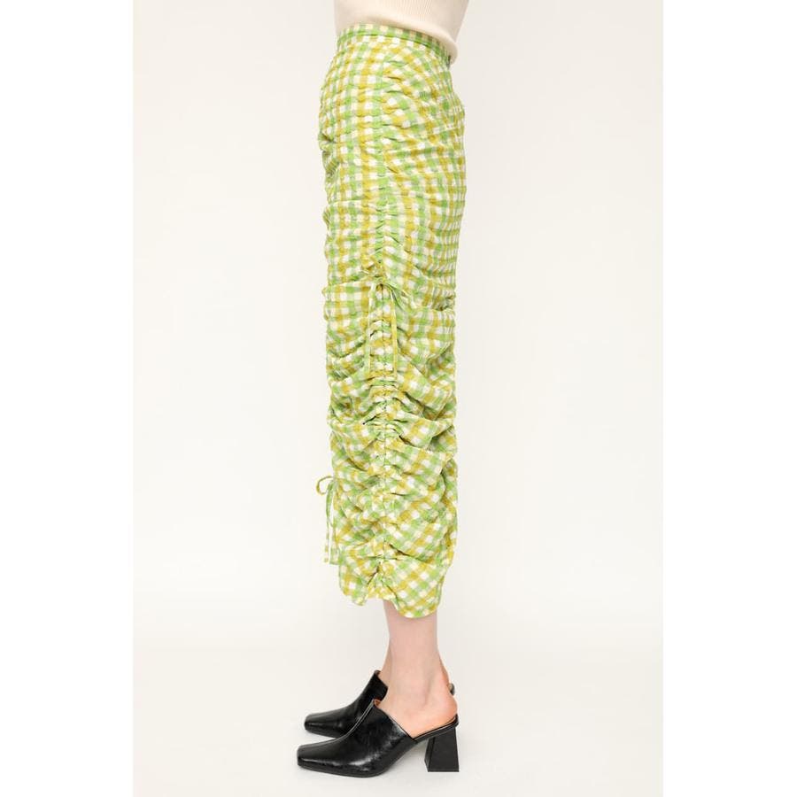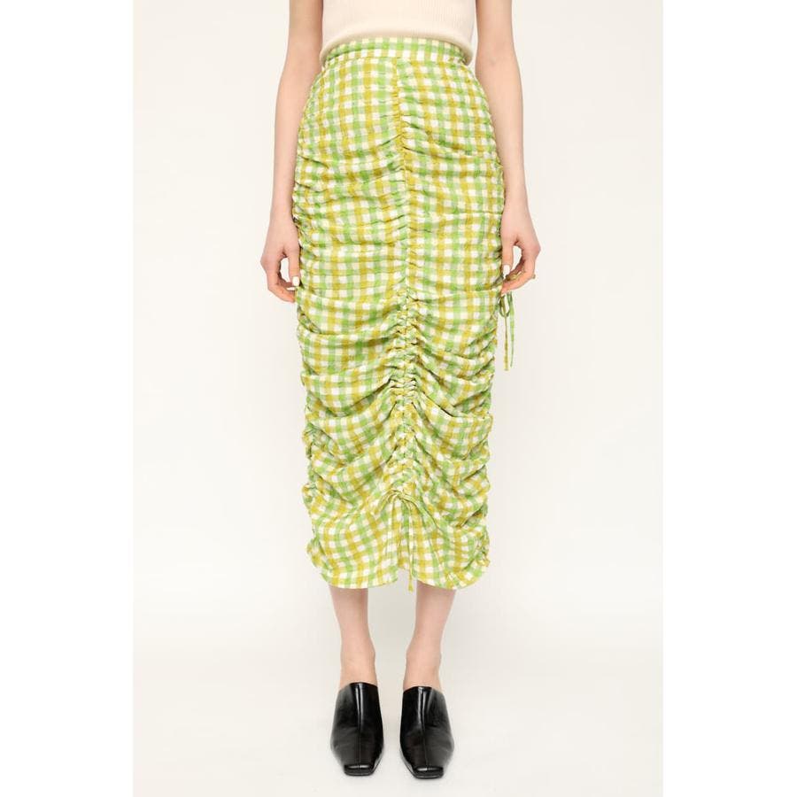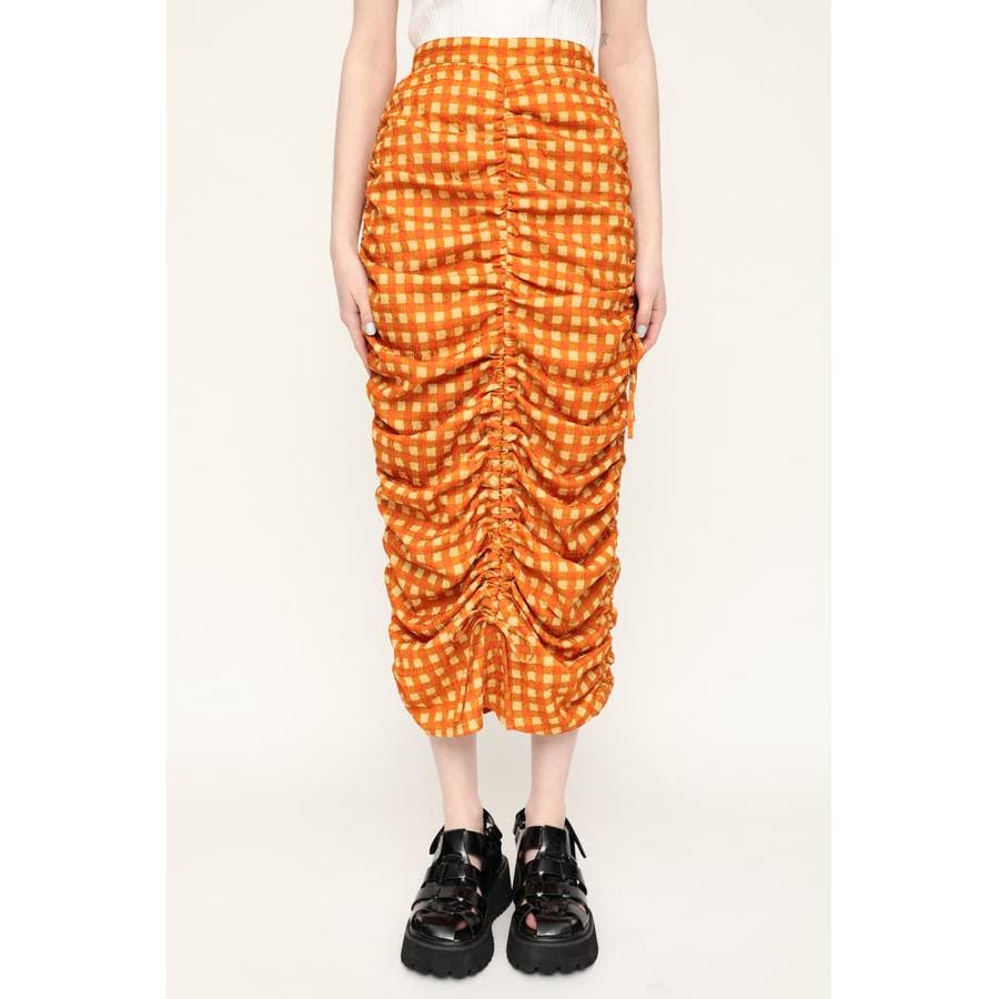 コーデに取り入れるだけで主役になるデザインスカート。独特の表面感が特徴の生地にSLYならではの発色の良いギンガムチェックを採用。アシンメトリーに入ったギャザーは女性らしいドレープを作ってくれるアイテムです。