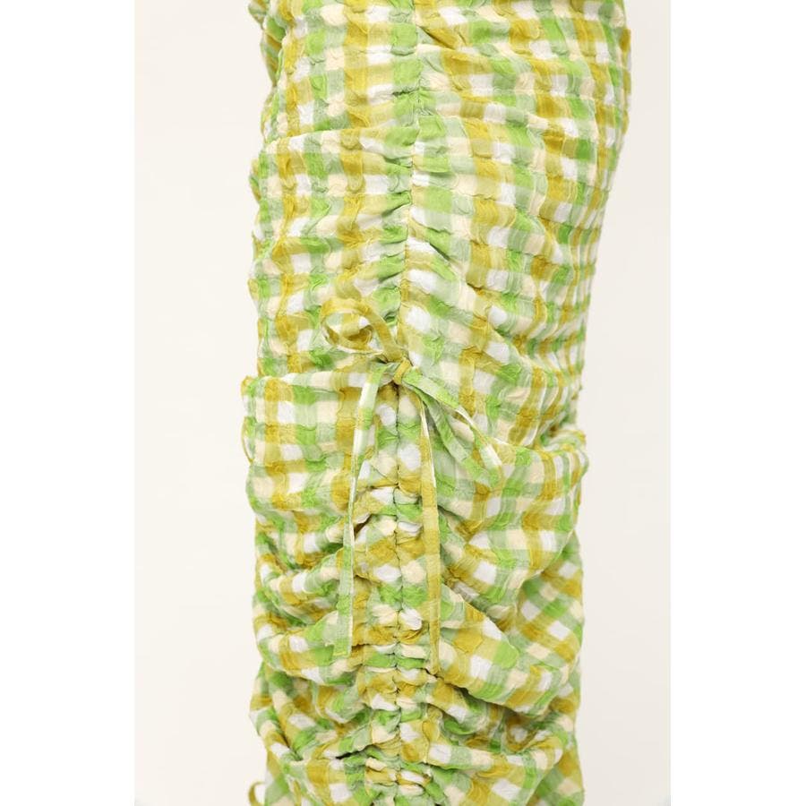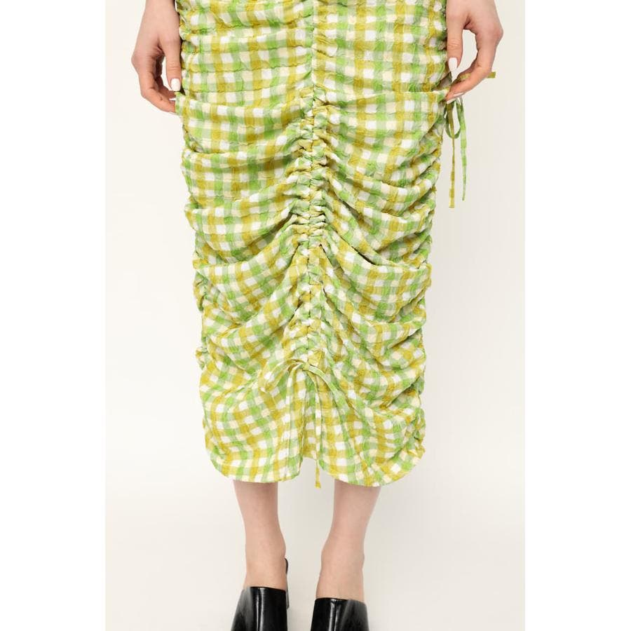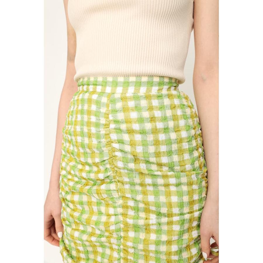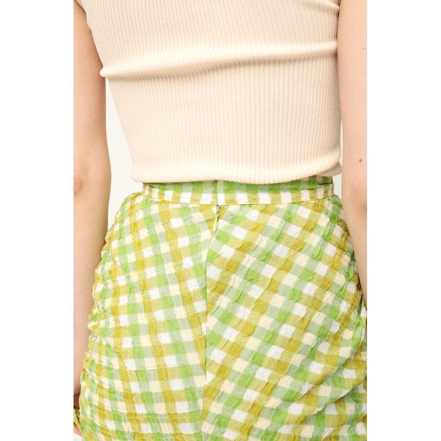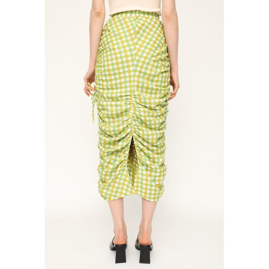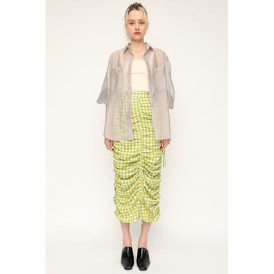 コーデに取り入れるだけで主役になるデザインスカート。独特の表面感が特徴の生地にSLYならではの発色の良いギンガムチェックを採用。アシンメトリーに入ったギャザーは女性らしいドレープを作ってくれるアイテムです。