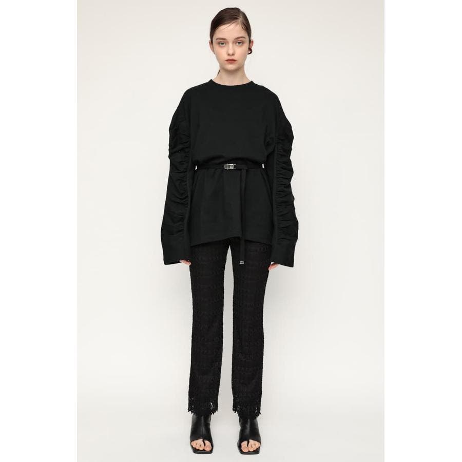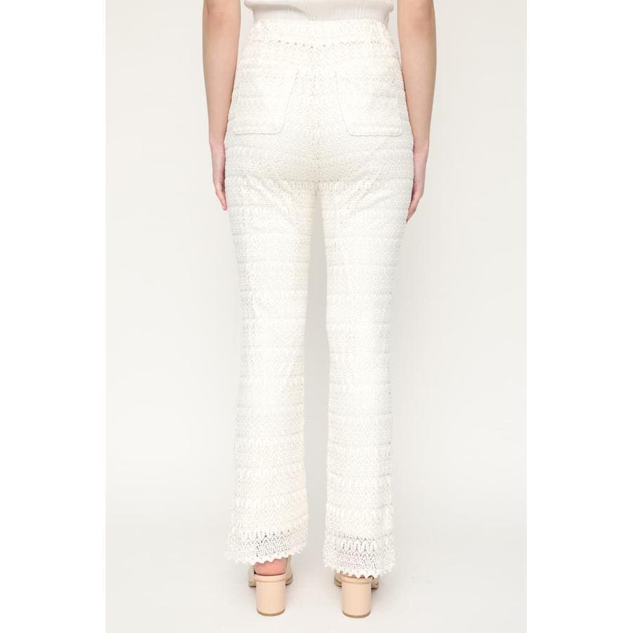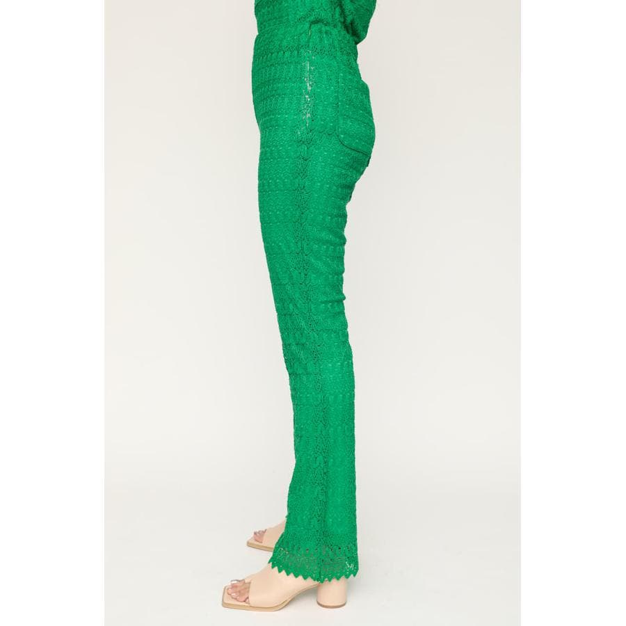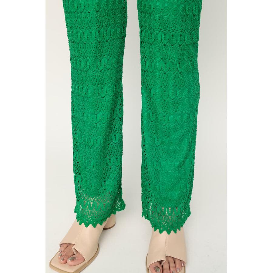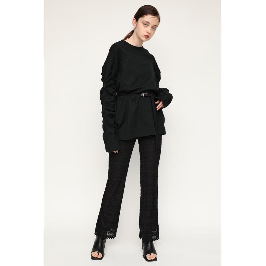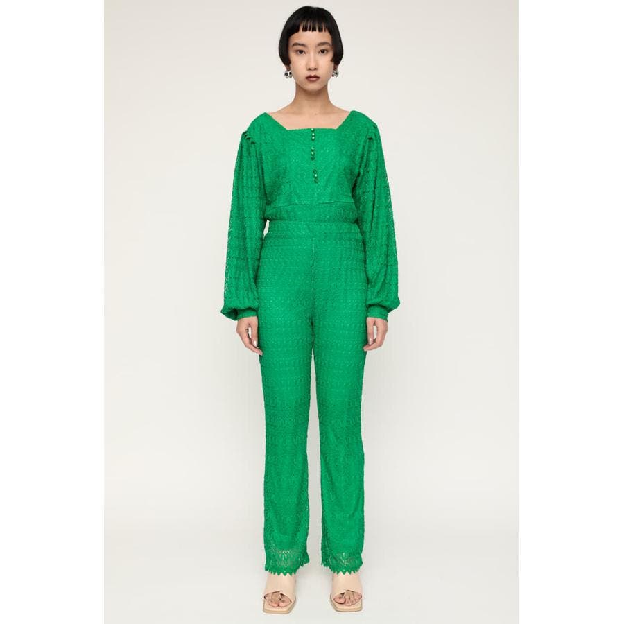 春を感じられるストレッチの効いたレースを使用したフレアパンツ。程よい太さで膝上を細くしているシルエットなので、足をきれいに見せてくれます。シンプルなカットトップスを合わせるだけで様になるアイテム。同シリーズのトップス(030FSY80-0930)とセットアップで合わせるスタイリングも今季おすすめです。