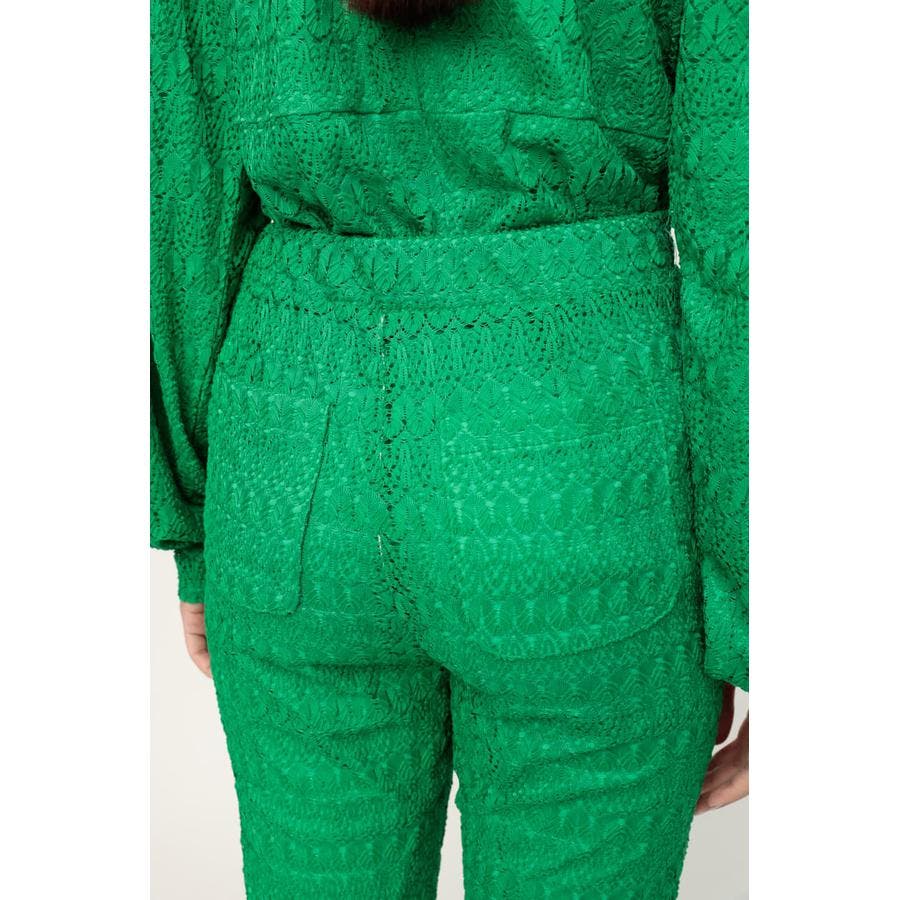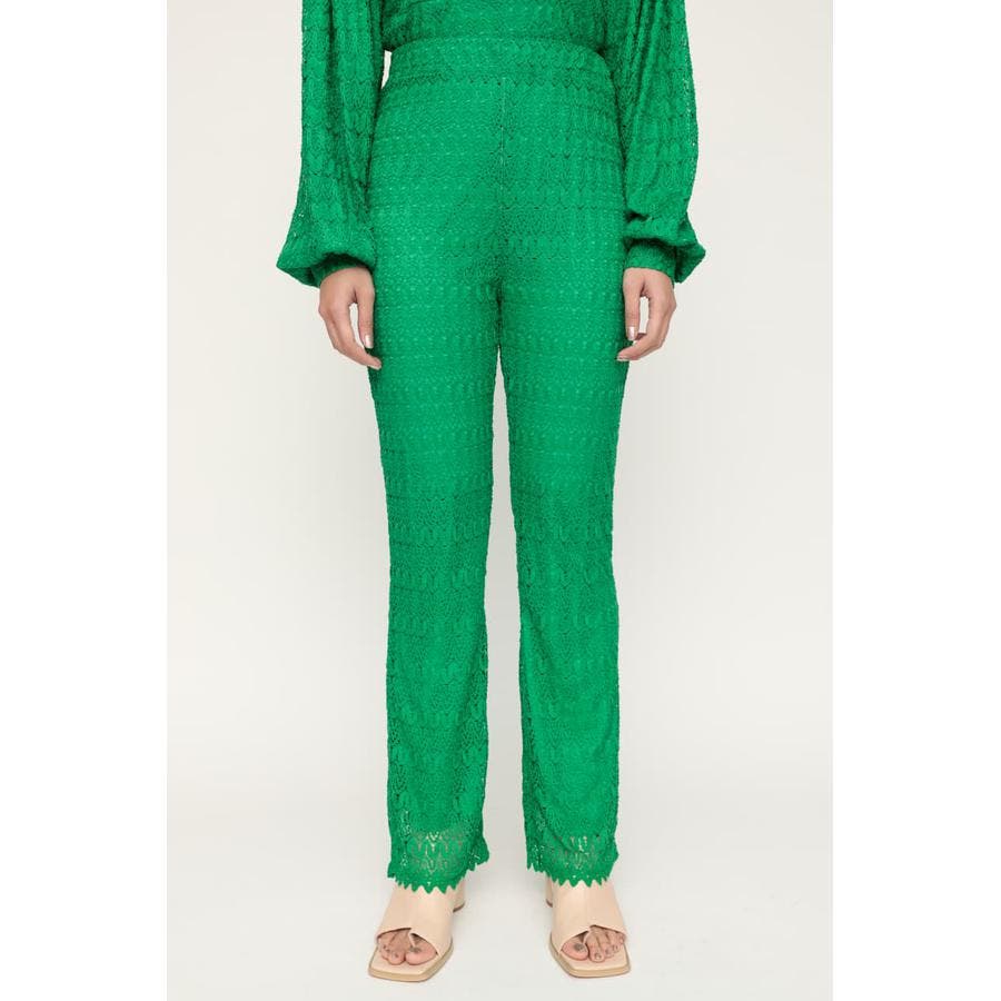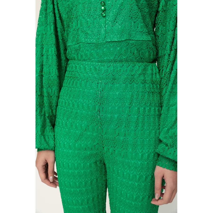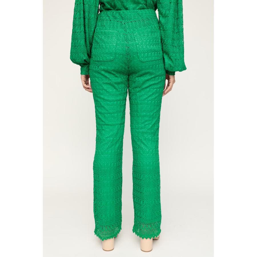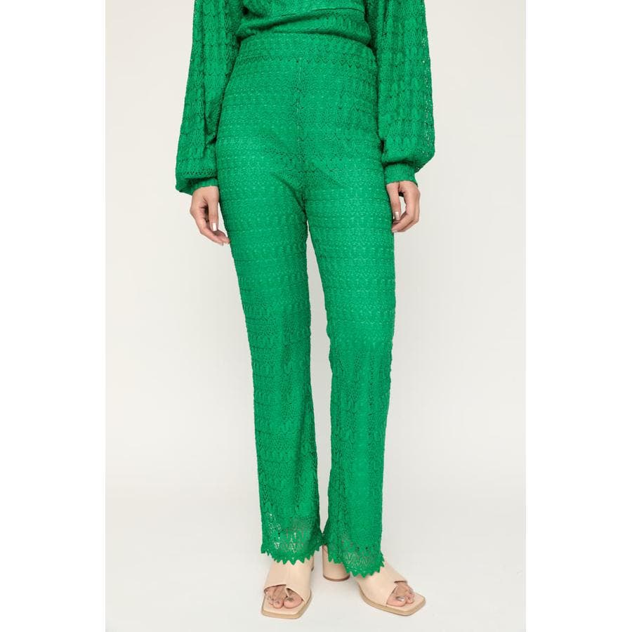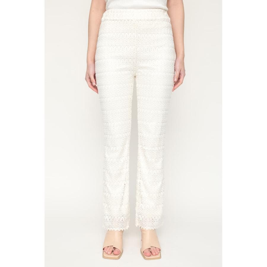 春を感じられるストレッチの効いたレースを使用したフレアパンツ。程よい太さで膝上を細くしているシルエットなので、足をきれいに見せてくれます。シンプルなカットトップスを合わせるだけで様になるアイテム。同シリーズのトップス(030FSY80-0930)とセットアップで合わせるスタイリングも今季おすすめです。