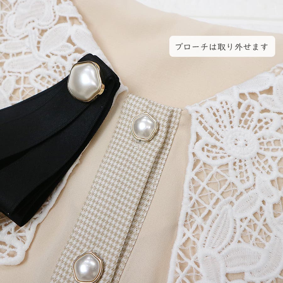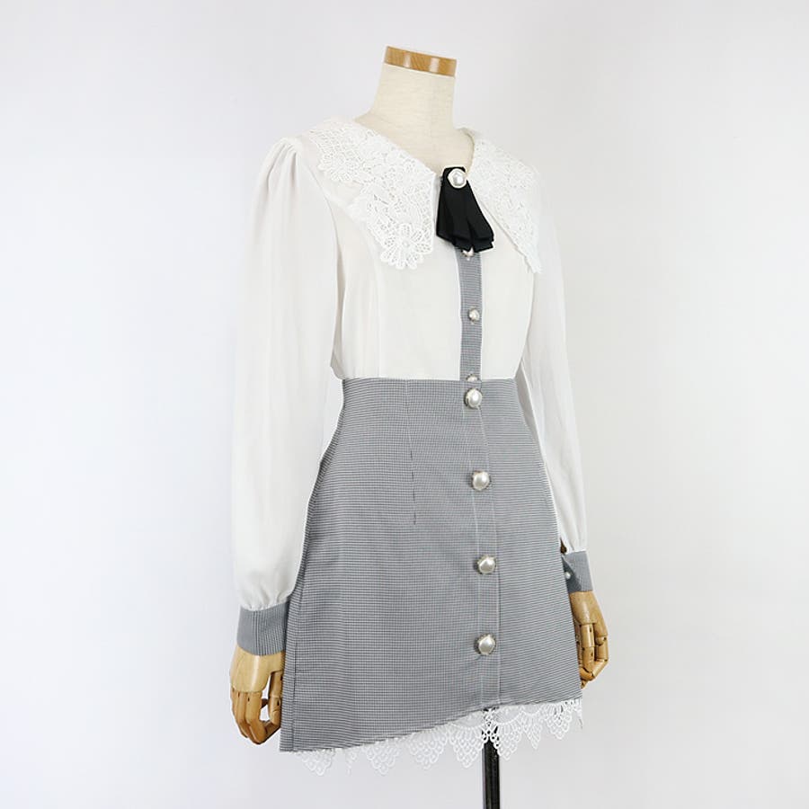 素材等 | 本体: ポリエステル100% 生地の伸縮性 : なし 生地の厚み : やや薄手 生地の透け感 : レース部分あり、ホワイトあり 裏地 : スカートインナーパンツ ブラウス : ボタンで着脱、ブローチ取り外し可 スカート : バックファスナー |