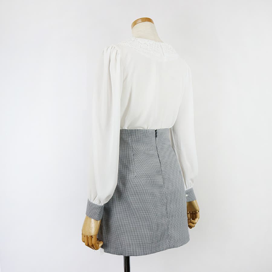 モデルの身長は162センチです。清楚なセットで単品でも活躍します。スカートはインナーパンツなのでミニ丈でも安心♪ブラウスは透けるのでインナーが必要です。 |