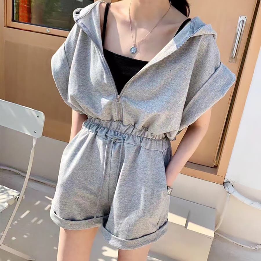スウェット生地よりかは薄くて夏に程よい。ラフな感じが可愛くて家着でも外着でもいけそう。つなぎになってるのでお腹の肉もカバーしてくれて良き。