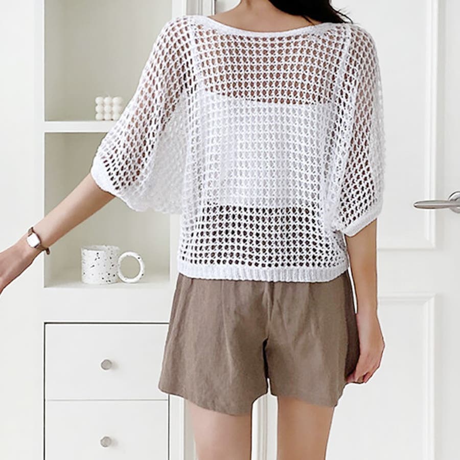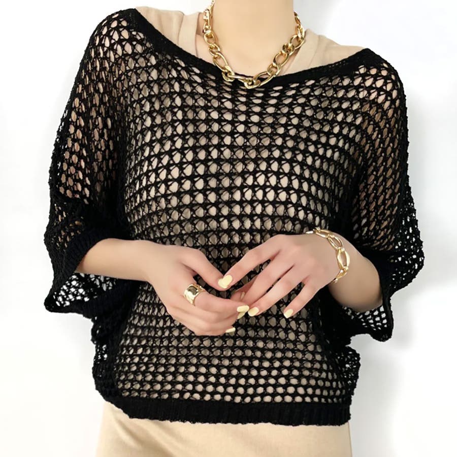 | 商品番号: 16944 商品名: 透かし編みメッシュニット 商品説明: リネン風のさらりとした質感の、透かし編みニット。気になる二の腕をカバーしてくれる幅広の袖が嬉しいポイント。大きな編みの透け感が、軽やかな印象に。ゆったりとしたラインで、カジュアルにまとめるのがおすすめです。 |