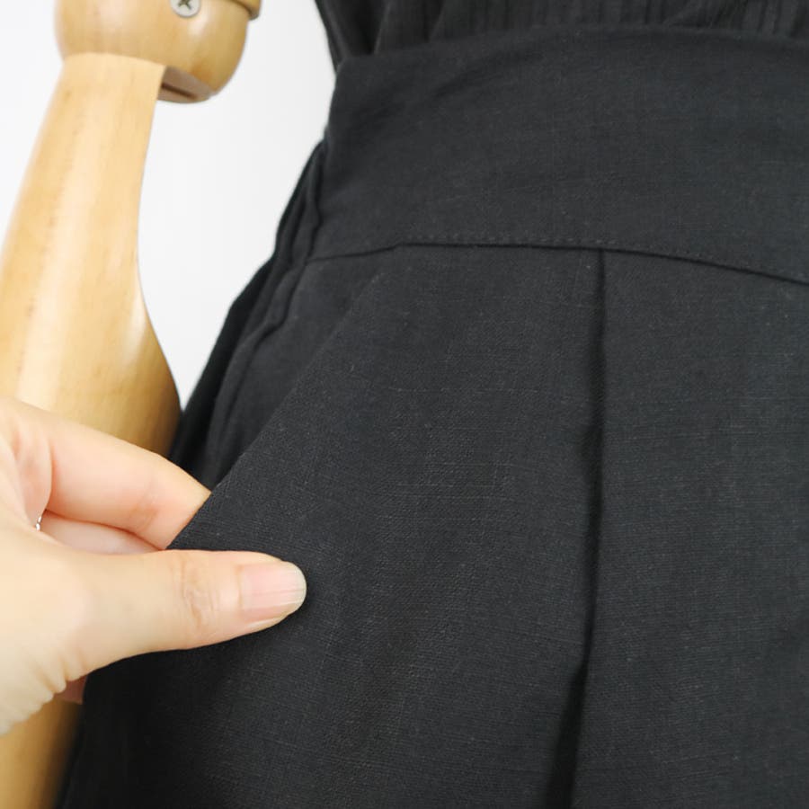 | 素材等 | 本体: 綿100% 生地の伸縮性 : なし 生地の厚み : 薄手 生地の透け感 : ホワイト、ベージュあり 裏地 : なし その他 : ウエスト後ろゴム、ポケット付き |