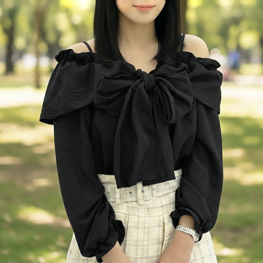 【17427】リボンタイオフショルブラウス