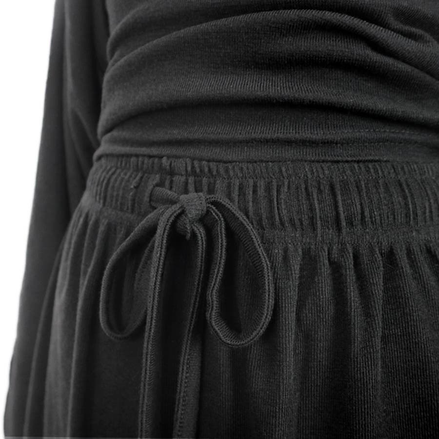 | モデルの身長は163センチです。ウエストゴムで、柔らかく伸縮性があるリラクシングな着心地! |