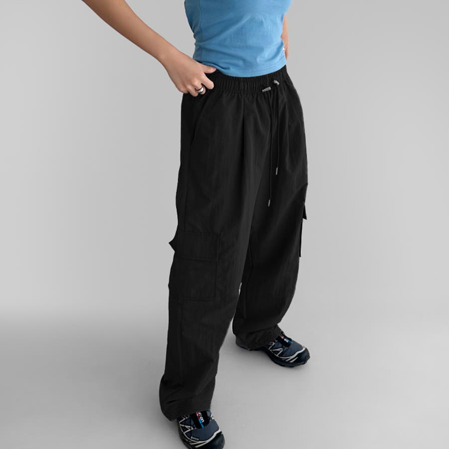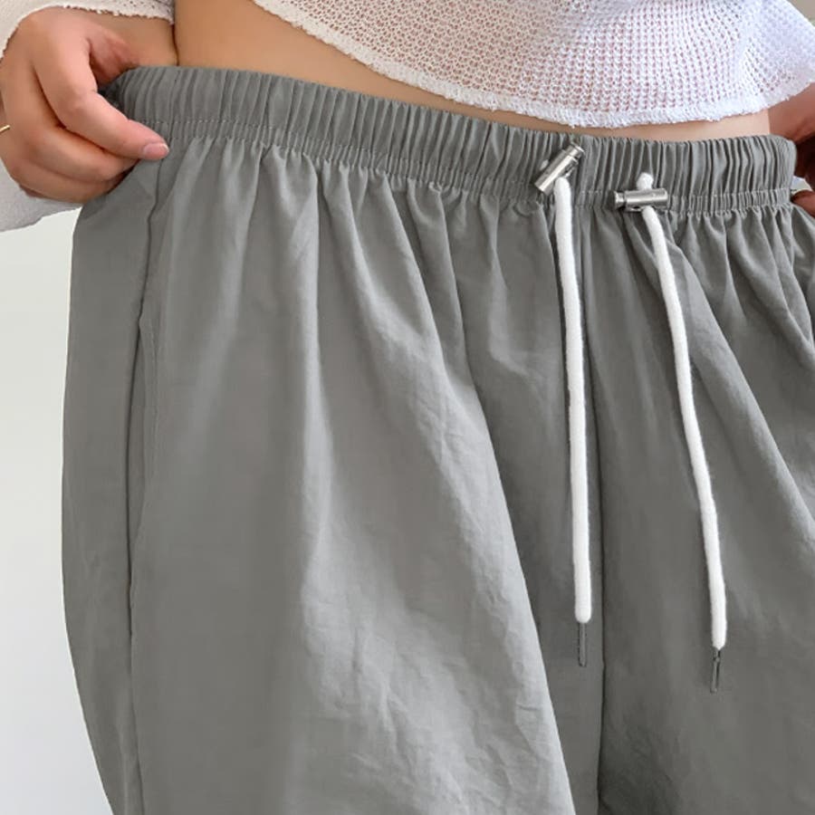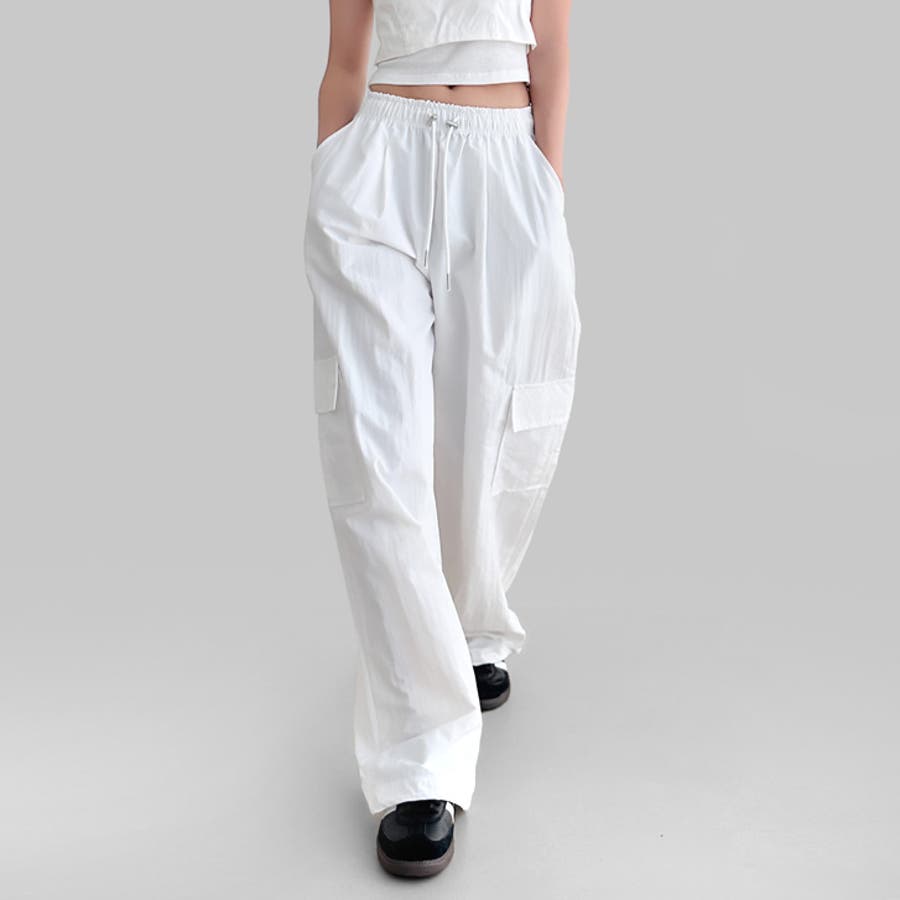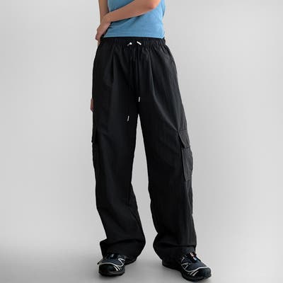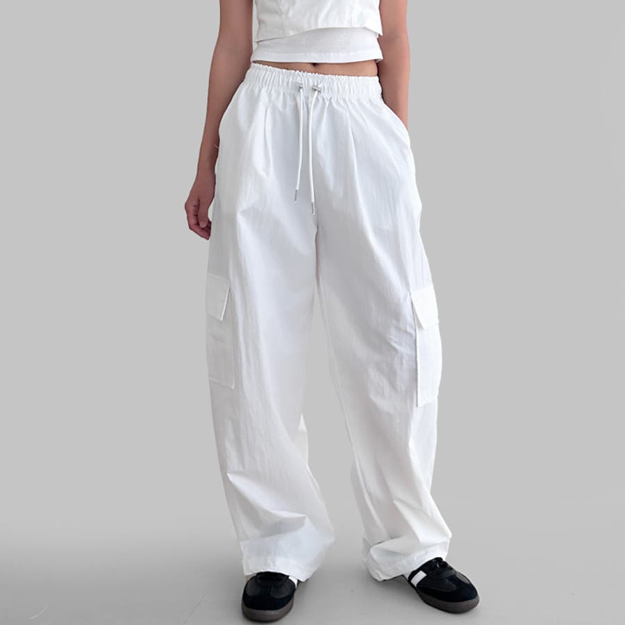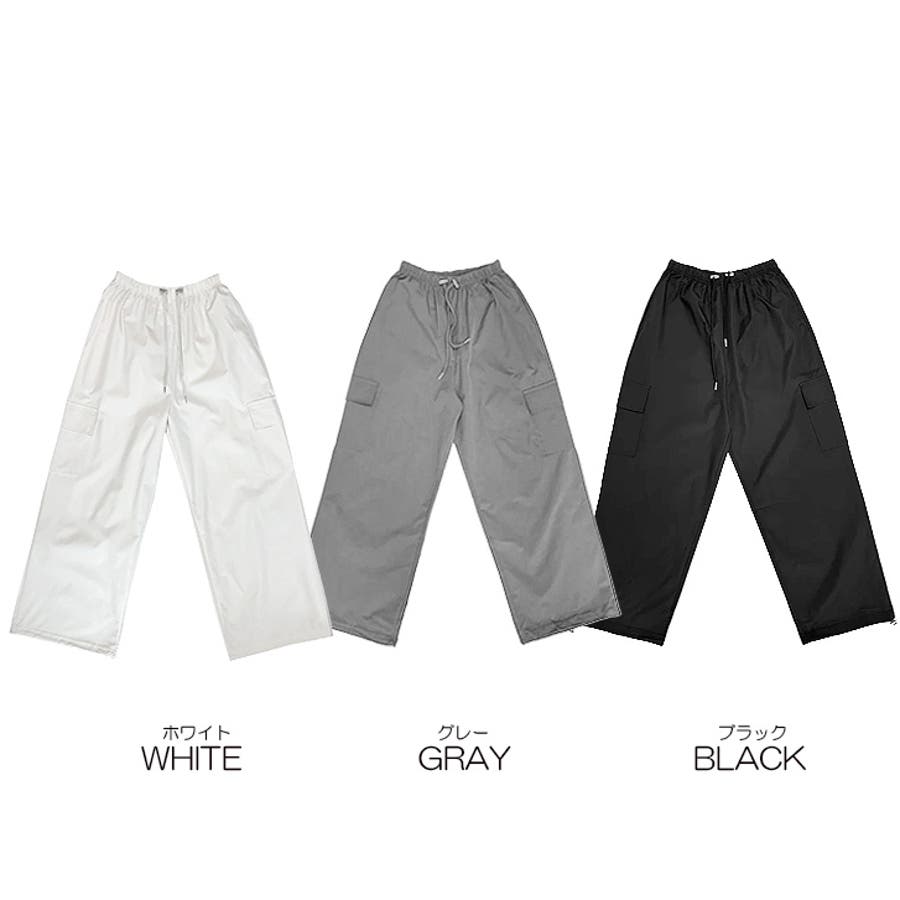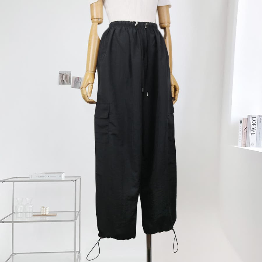 | 素材等 | 本体: ポリエステル100% 生地の伸縮性 : なし 生地の厚み : 薄手 生地の透け感 : ホワイトあり 裏地 : なし その他 : ウエストゴム、ポケット×4、裾口はしぼることができます |