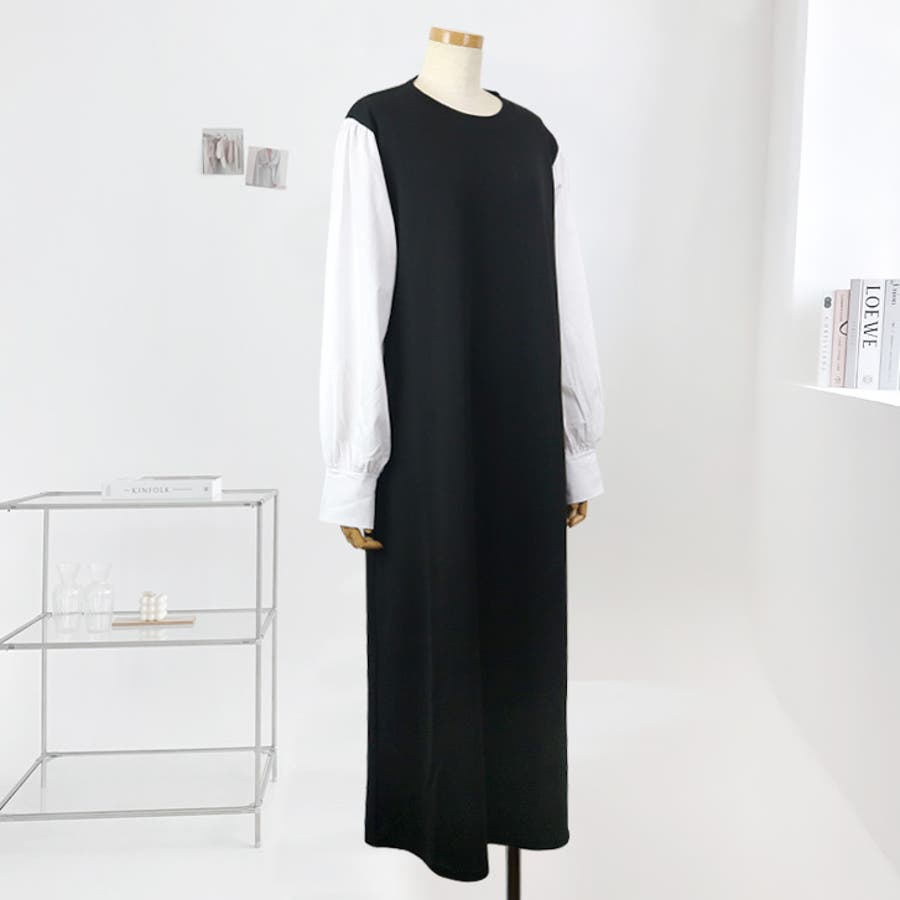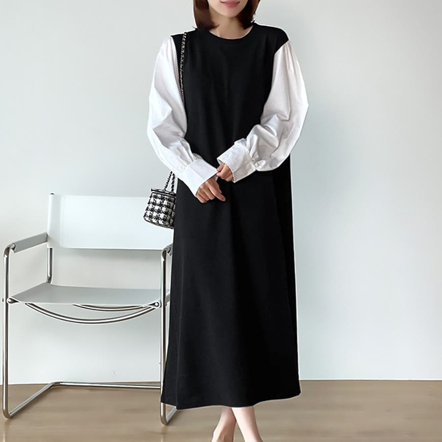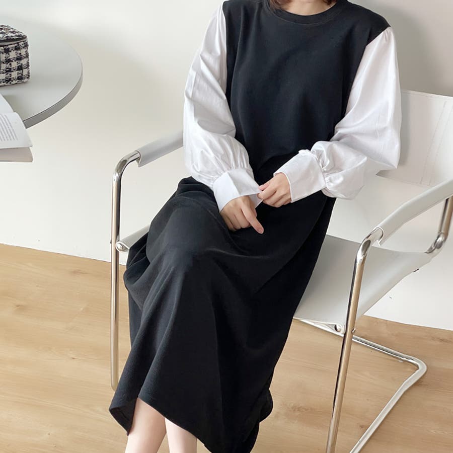 | ブラック着用のモデルの身長は162センチです。重ね着のようなデザインのコンビワンピです。 |