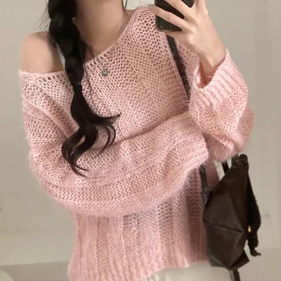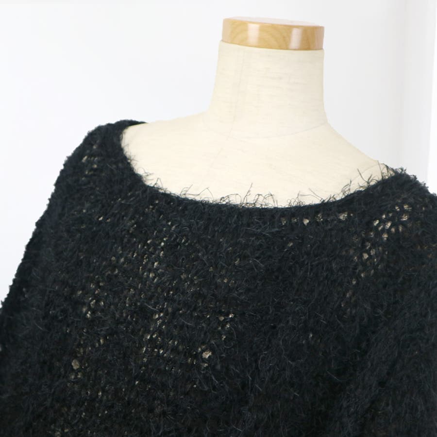 | デコルトが広めにあいているのでスッキリと着られます。編み目は透けるのでインナーが必要です。 |