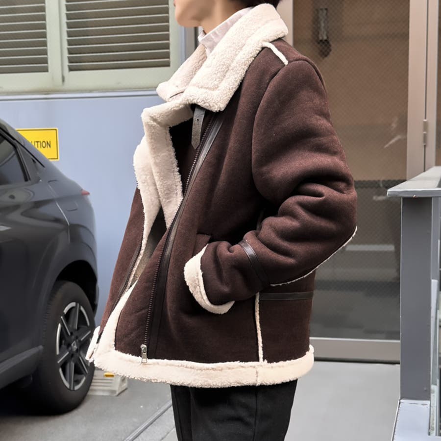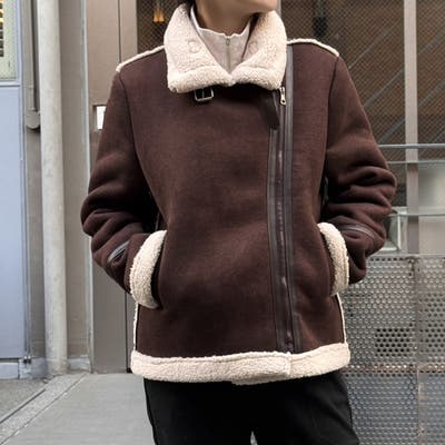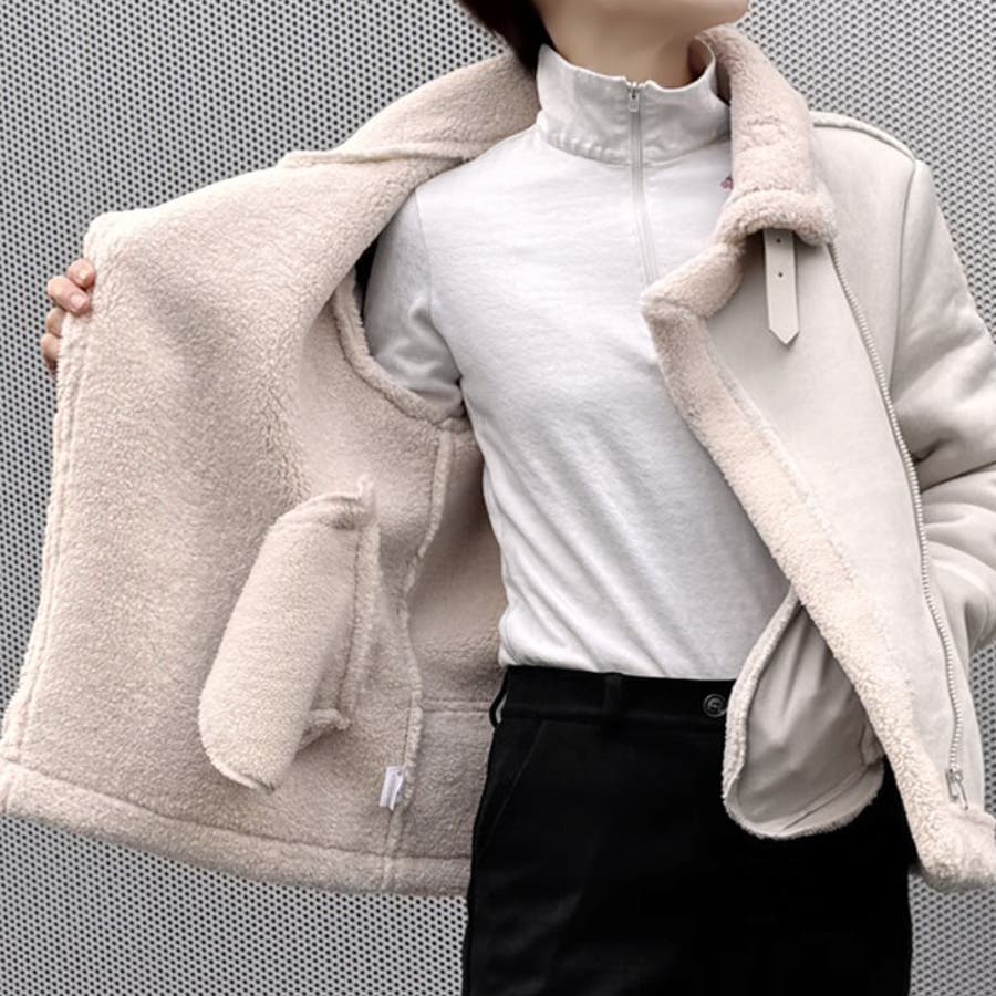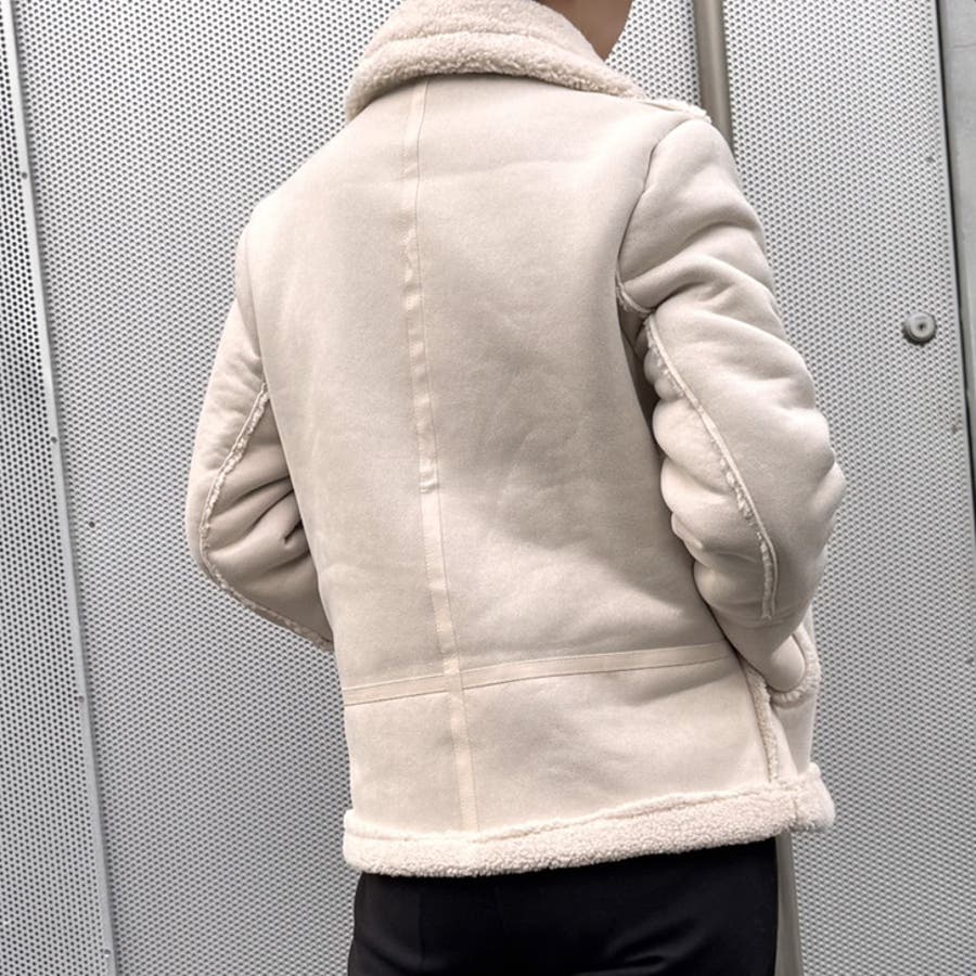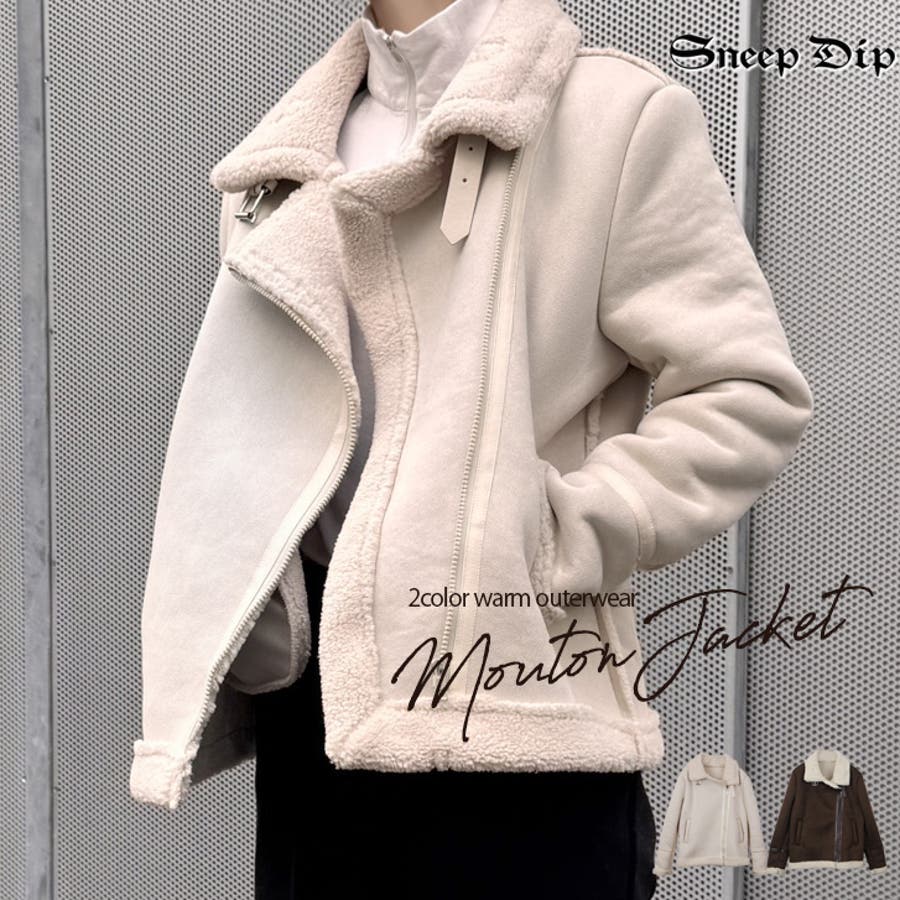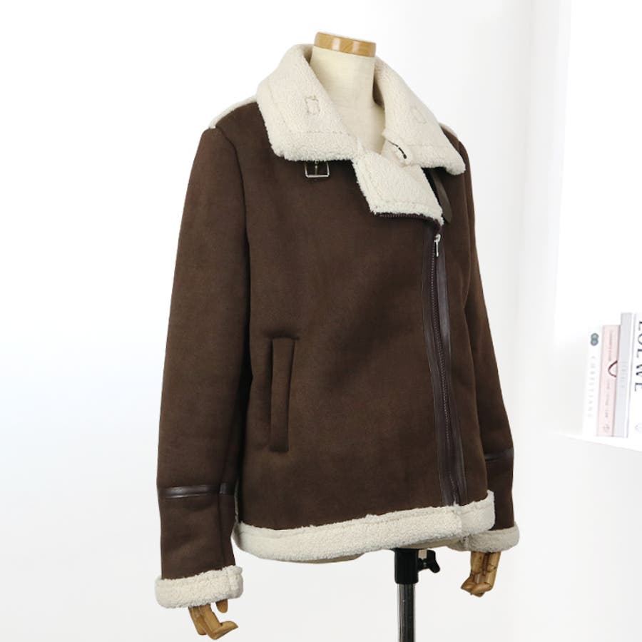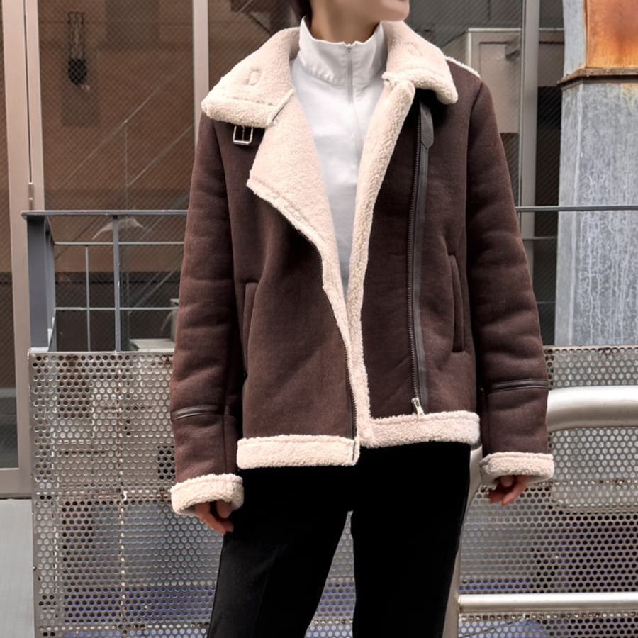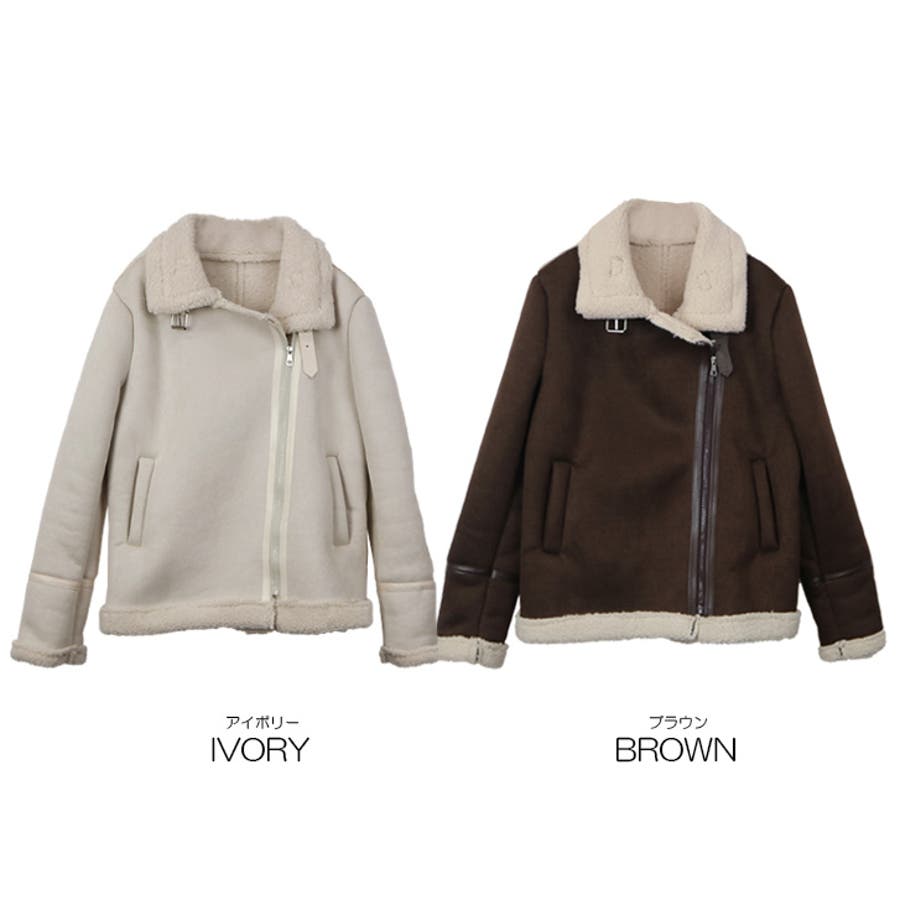 | モデルの身長は163センチです。ボアがポイントのムートン風ジャケット。ボトムスを選ばず、何にでも合わせやすいアウターです。 |