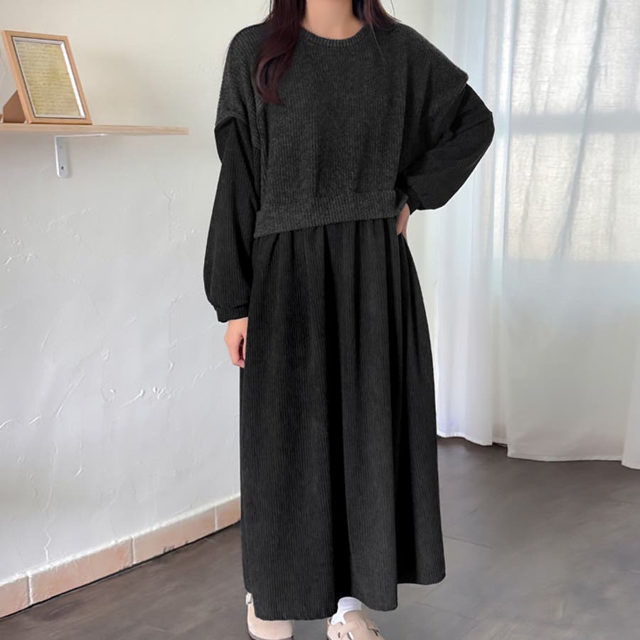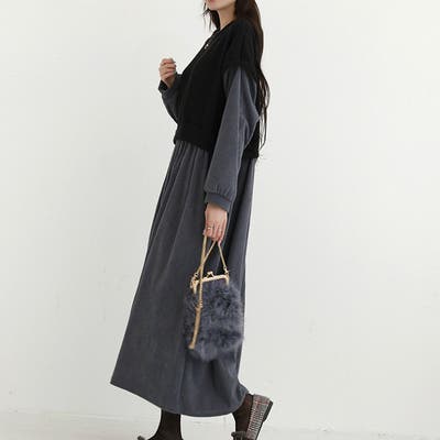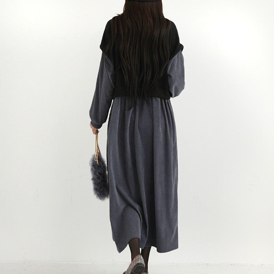 | チャコールグレーのモデルの身長は167センチです。ルックスも着心地もカジュアルで楽ちんなのにゆるかわいいワンピです。温かみのあるコーデュロイで一気に季節感が加速します。 |