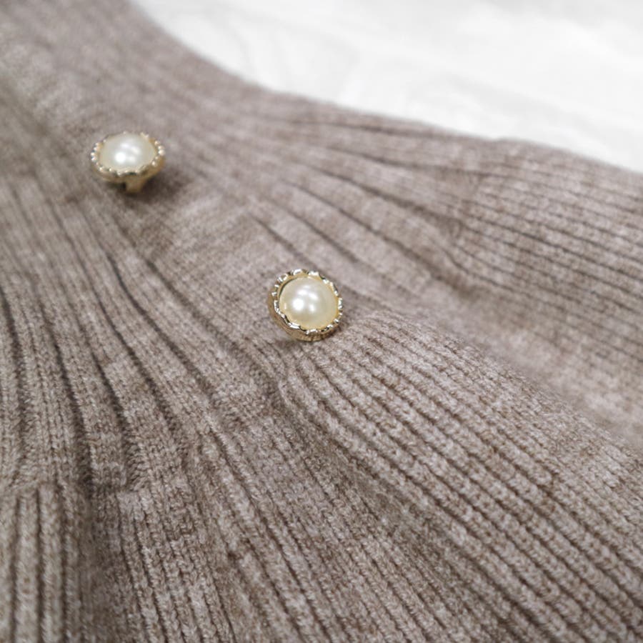 | モデルの身長は160センチです。袖にはパールが縫われていて、エレガントムードを後押しします。 |