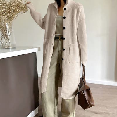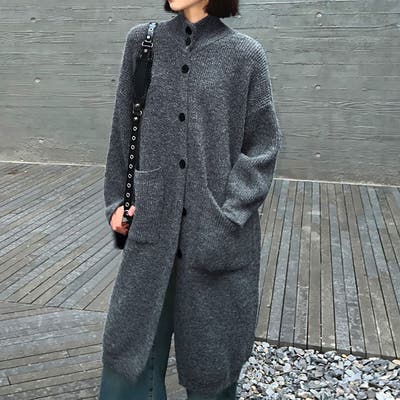 | グレー着用のモデルの身長は160センチです。コートの下にも着れるロングカーデです。 |