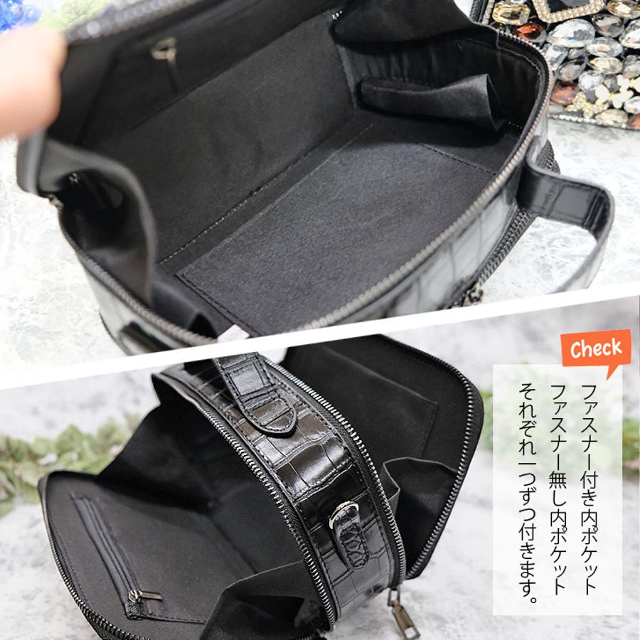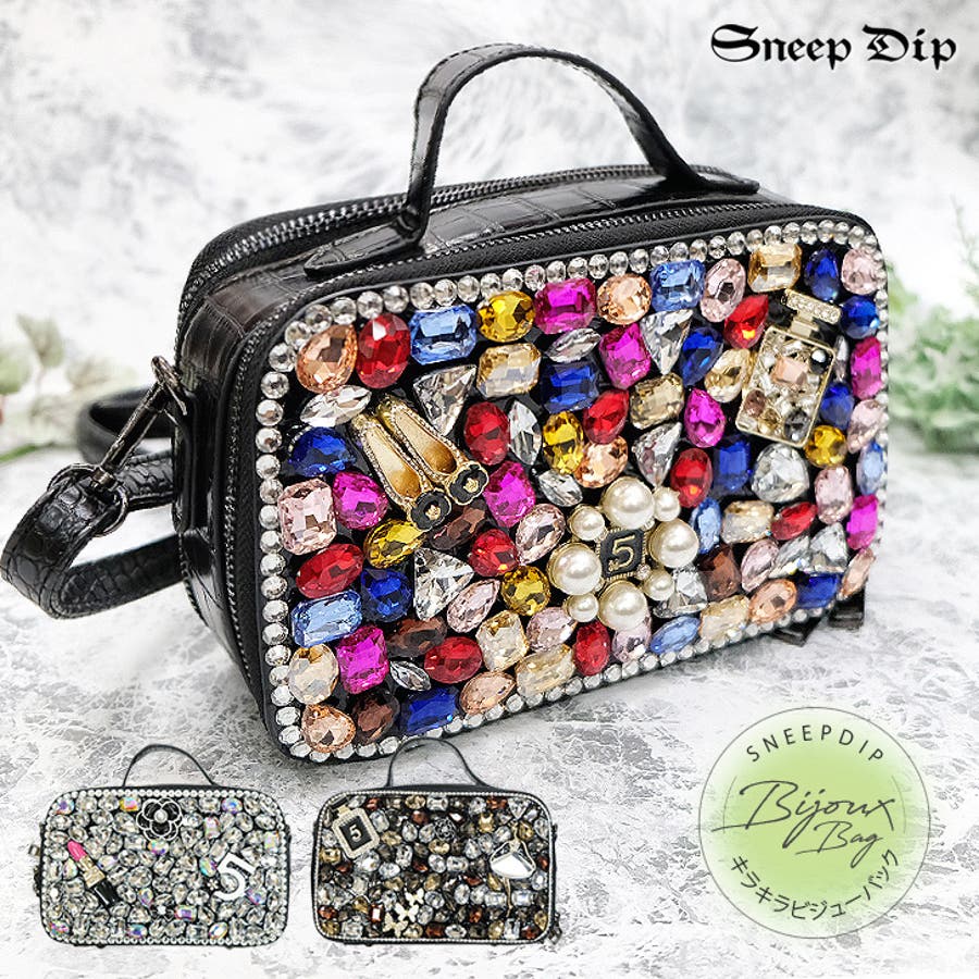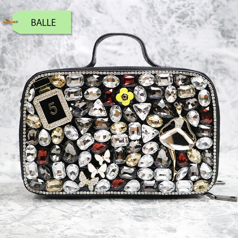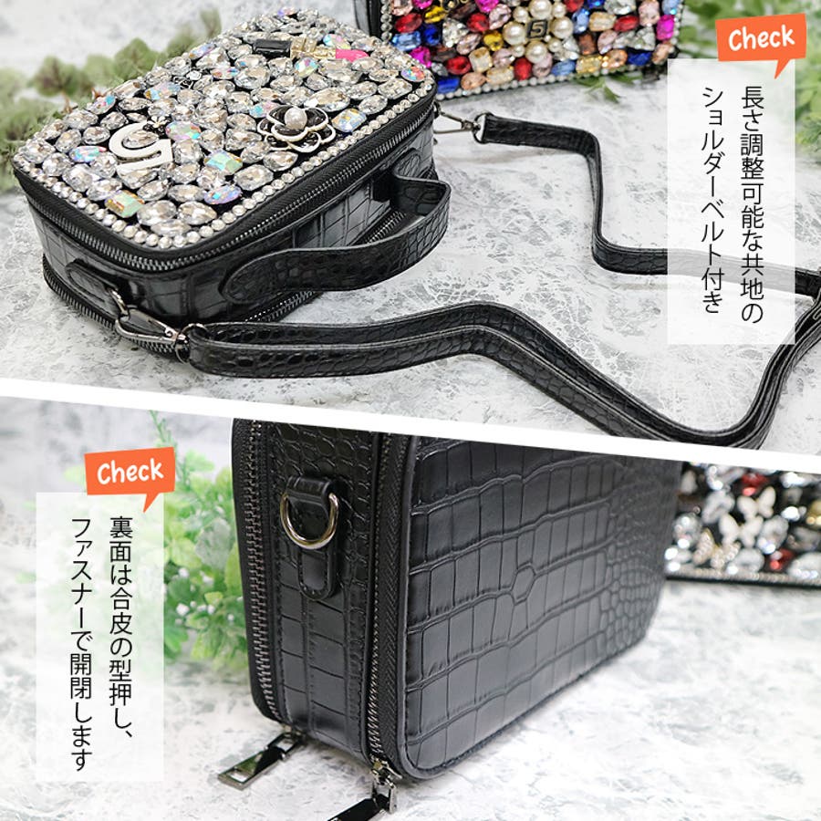 | 素材等 | 本体: エコレザー/合金 内側:ファスナーポケット×1、内ポケット×1 その他:持ち手取外し不可、ショルダーチェーン取外し可 ご注意:ビジューの色や形はそれぞれ異なります。予めご了承ください。 |