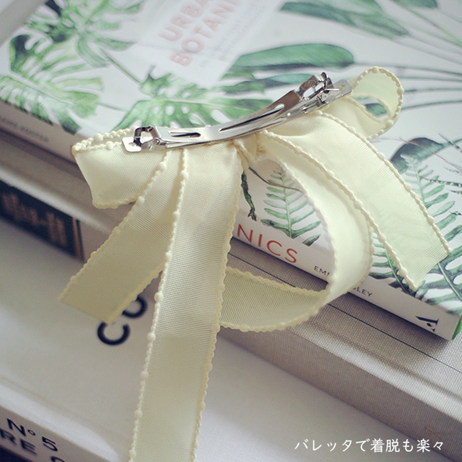 | 素材等 | 本体: ポリエステル/合金 生地の伸縮性 : なし 生地の厚み : 薄手 生地の透け感 : あり 裏地 : なし その他 : バレッタで着脱、リボン取り外し不可 |