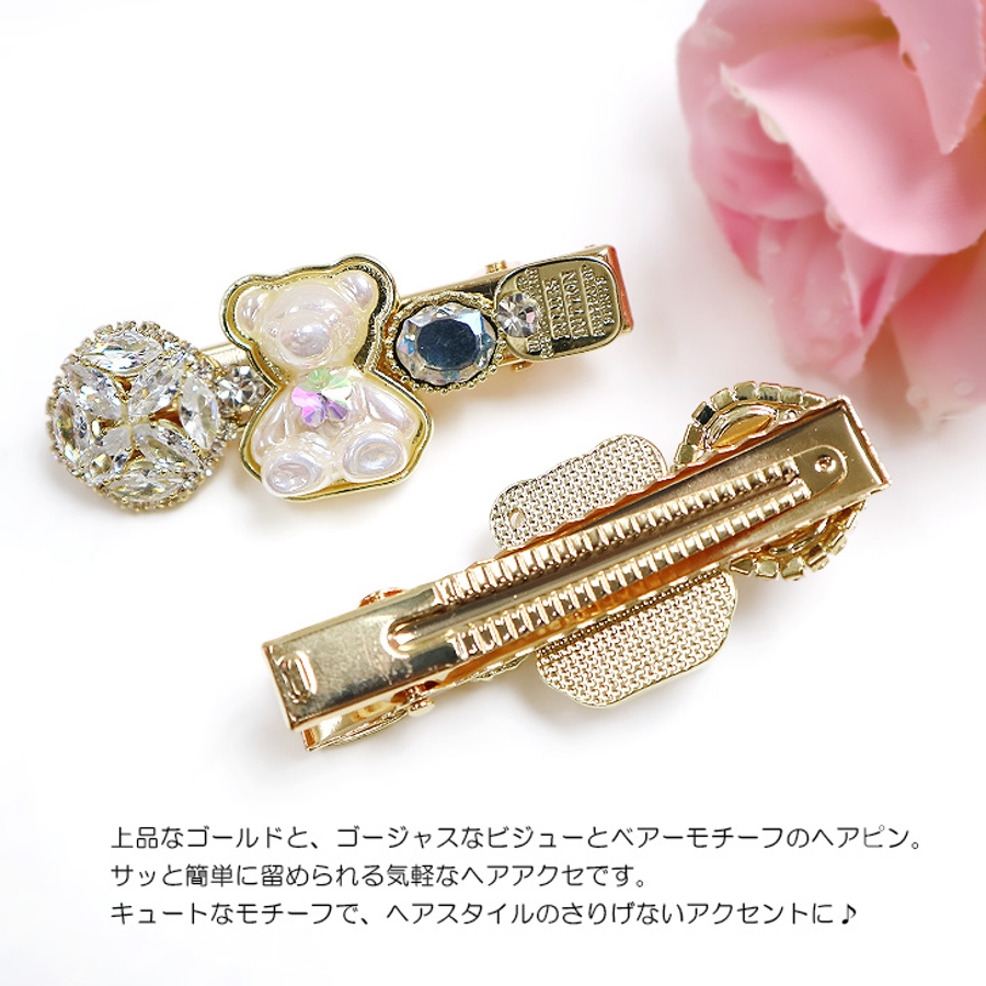 商品番号: 7144 商品名: キラキラビジュー×ベアーヘアピン 商品説明: 上品なゴールドと、ゴージャスなビジューとベアーモチーフのヘアピン。サッと簡単に留められる気軽なヘアアクセです。キュートなモチーフで、ヘアスタイルのさりげないアクセントに♪ |