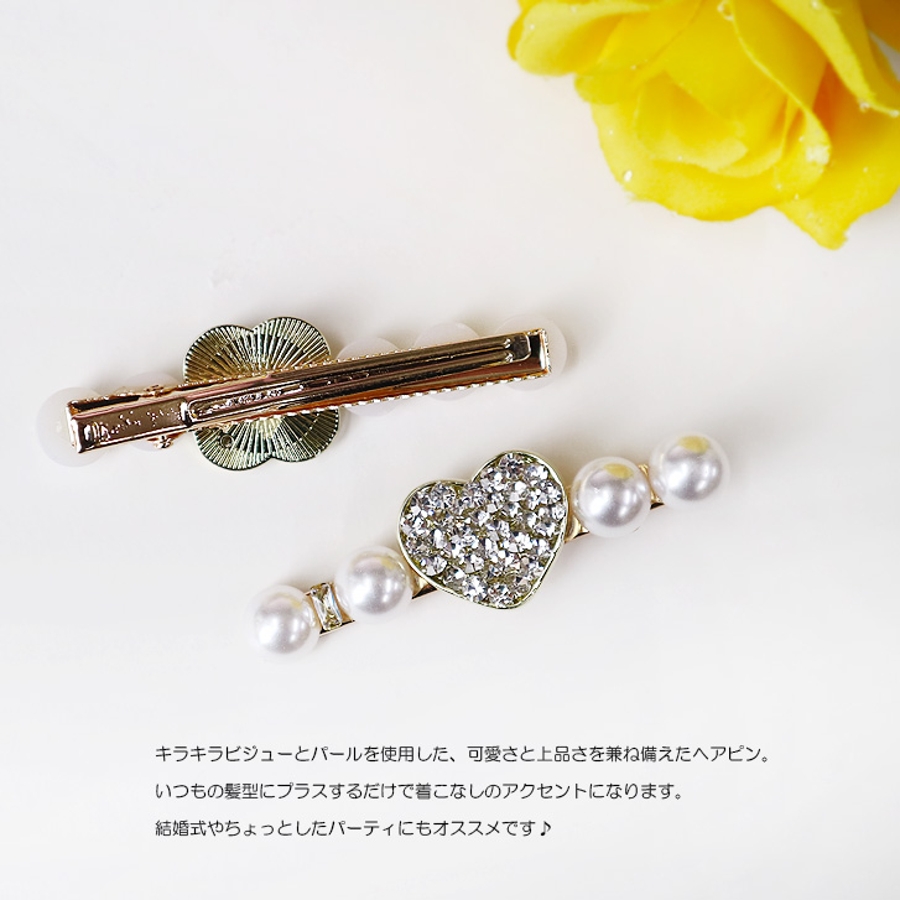 商品番号: 7156 商品名: キラキラビジューヘアピン 商品説明: キラキラビジューとパールを使用した、可愛さと上品さを兼ね備えたヘアアクセサリー。いつもの髪型にプラスするだけで着こなしのアクセントになります。結婚式やちょっとしたパーティにもオススメです♪ |