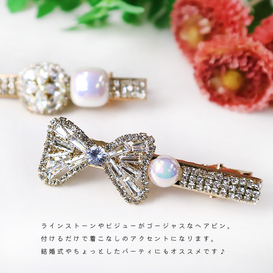 | 商品番号: 7158 商品名: ビジュー&ラインストーンヘアピン 商品説明: ラインストーンやビジューで、ゴージャスに仕上げたヘアアクセサリー。いつもの髪型にプラスするだけで着こなしのアクセントになります。結婚式やちょっとしたパーティにもオススメです♪ |