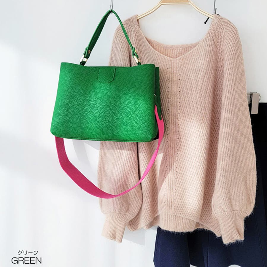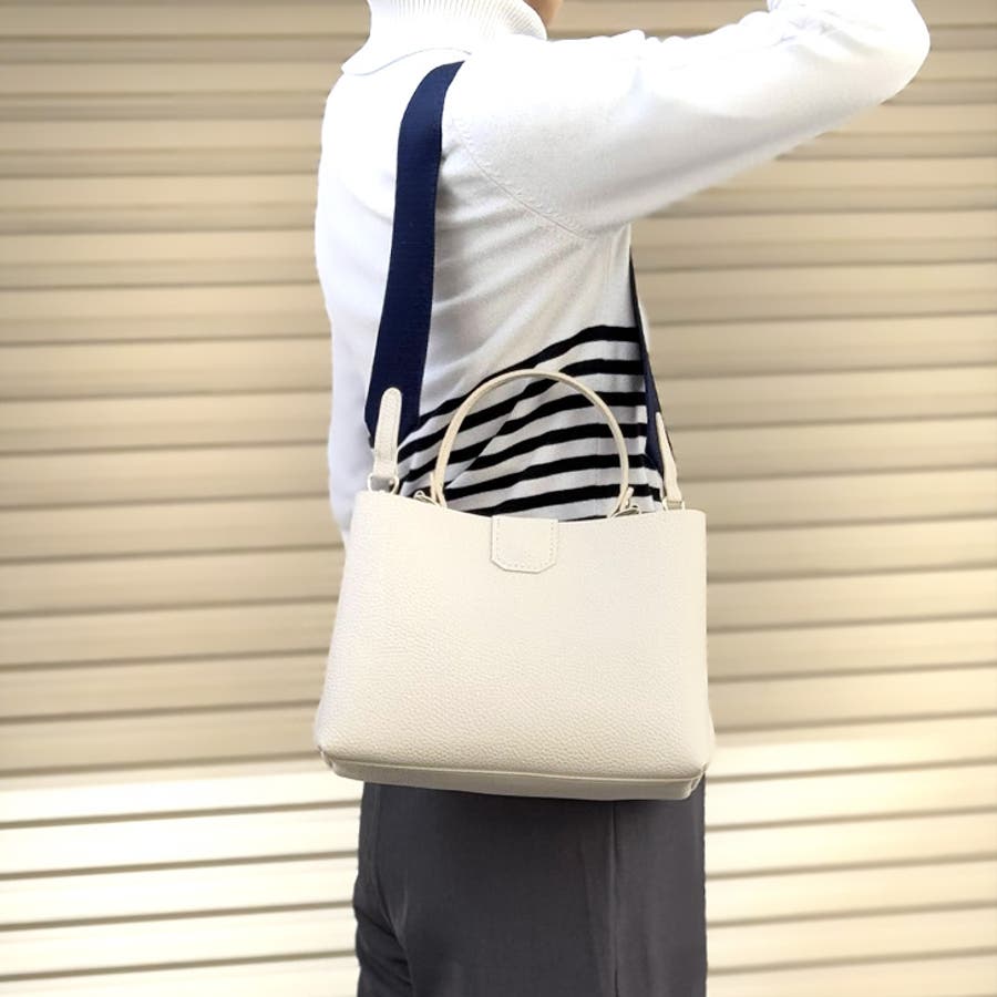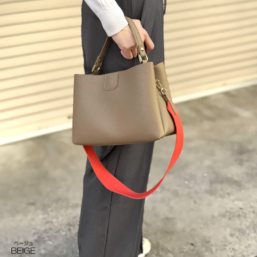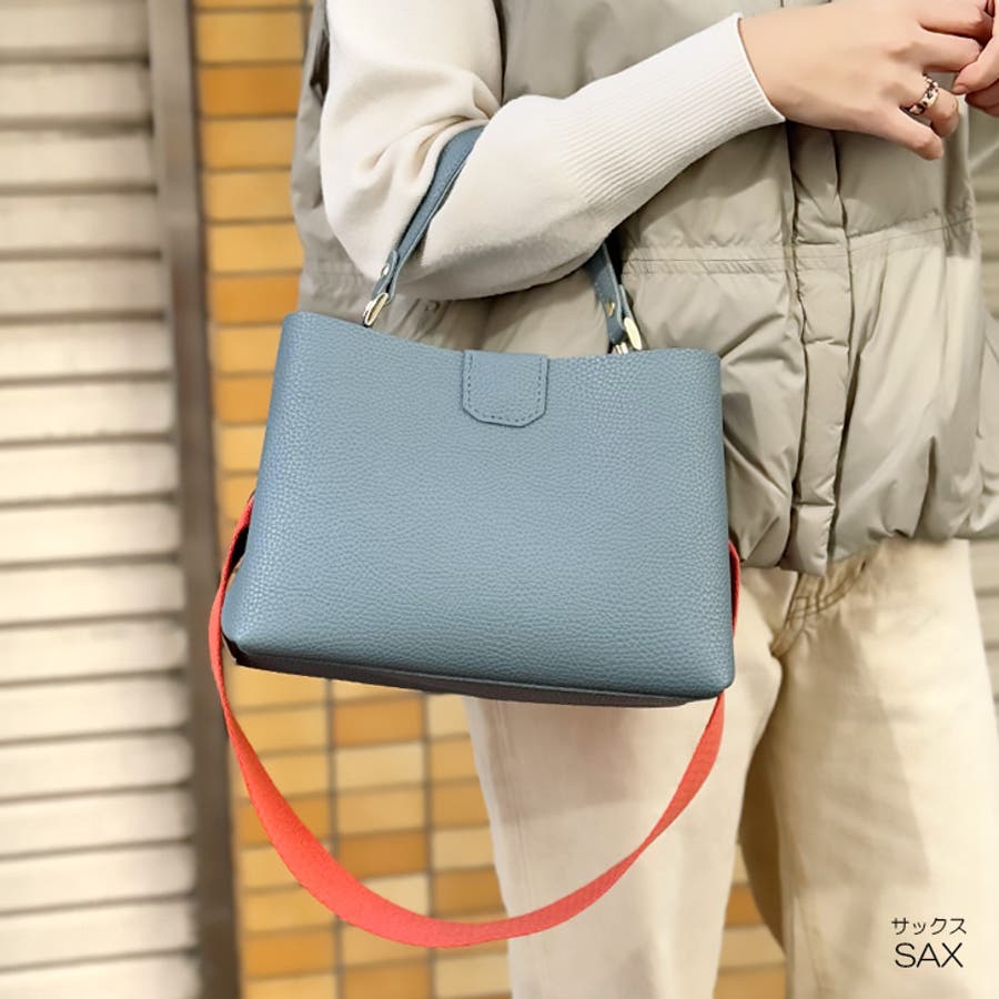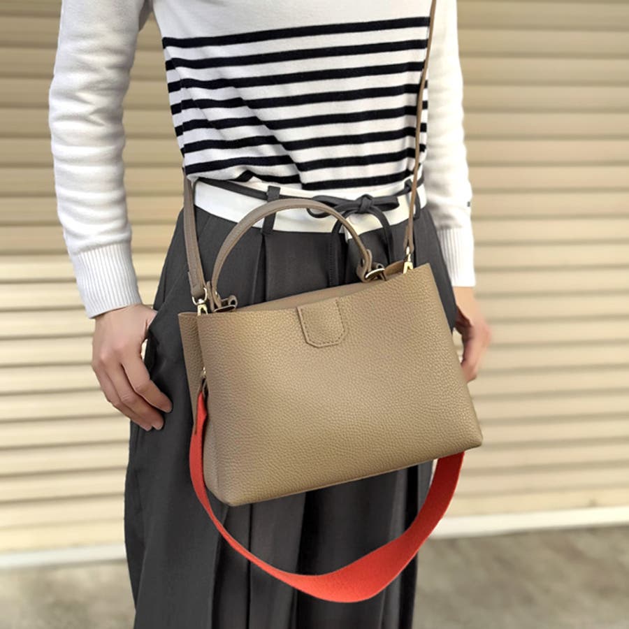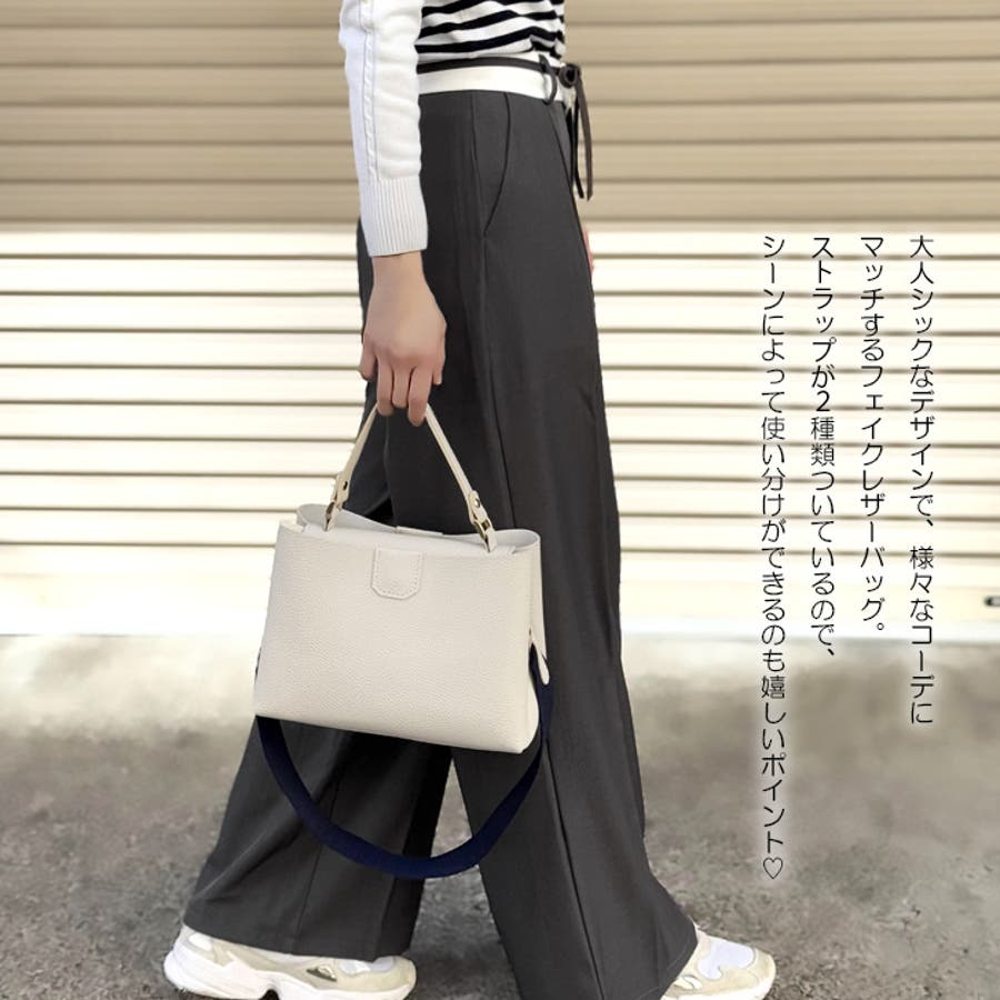 | 高見えフェイクレザーで大人の方にもオススメです。バイカラーストラップが目を引くポイント♪ |