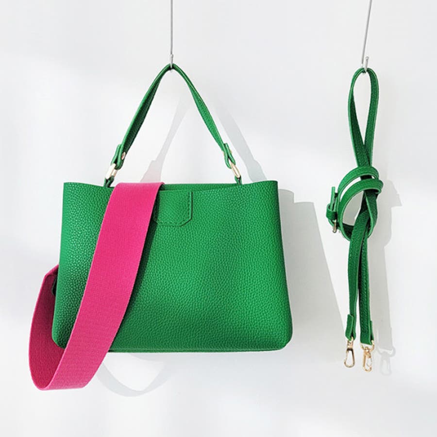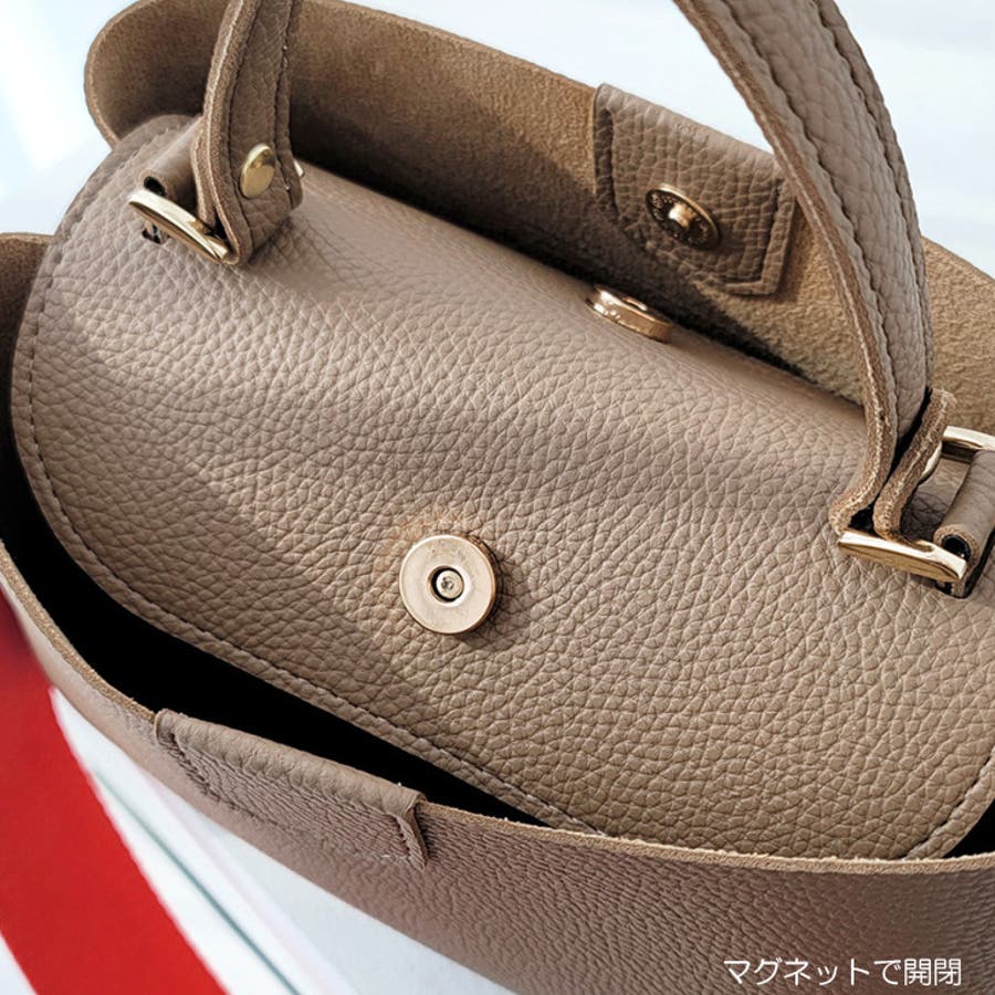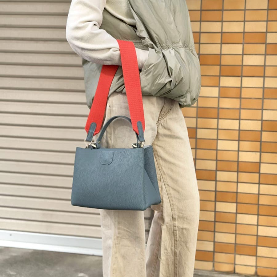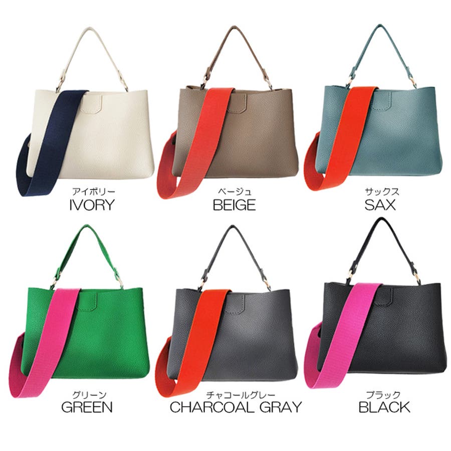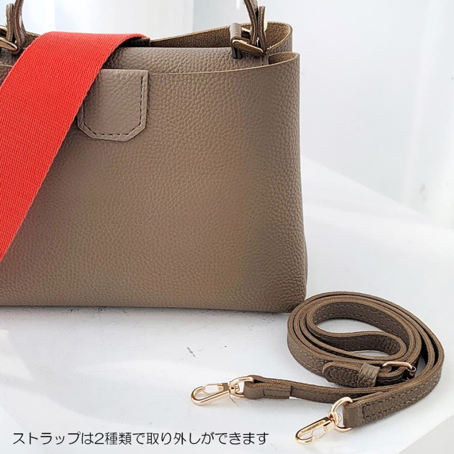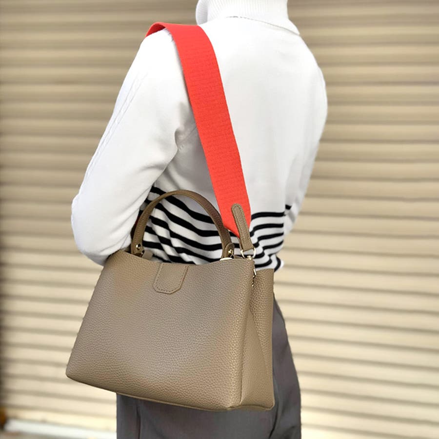 | 高見えフェイクレザーで大人の方にもオススメです。バイカラーストラップが目を引くポイント♪ |