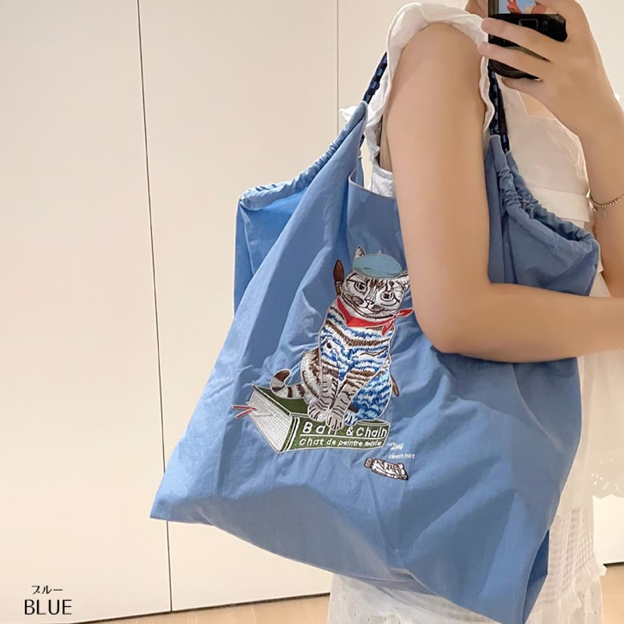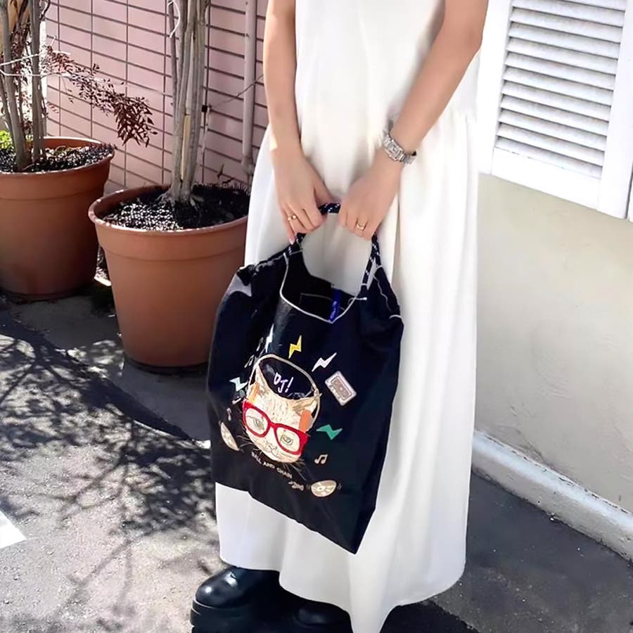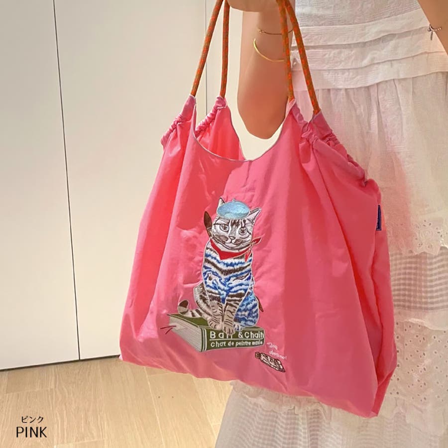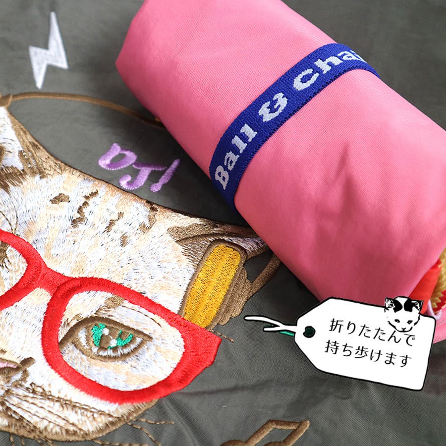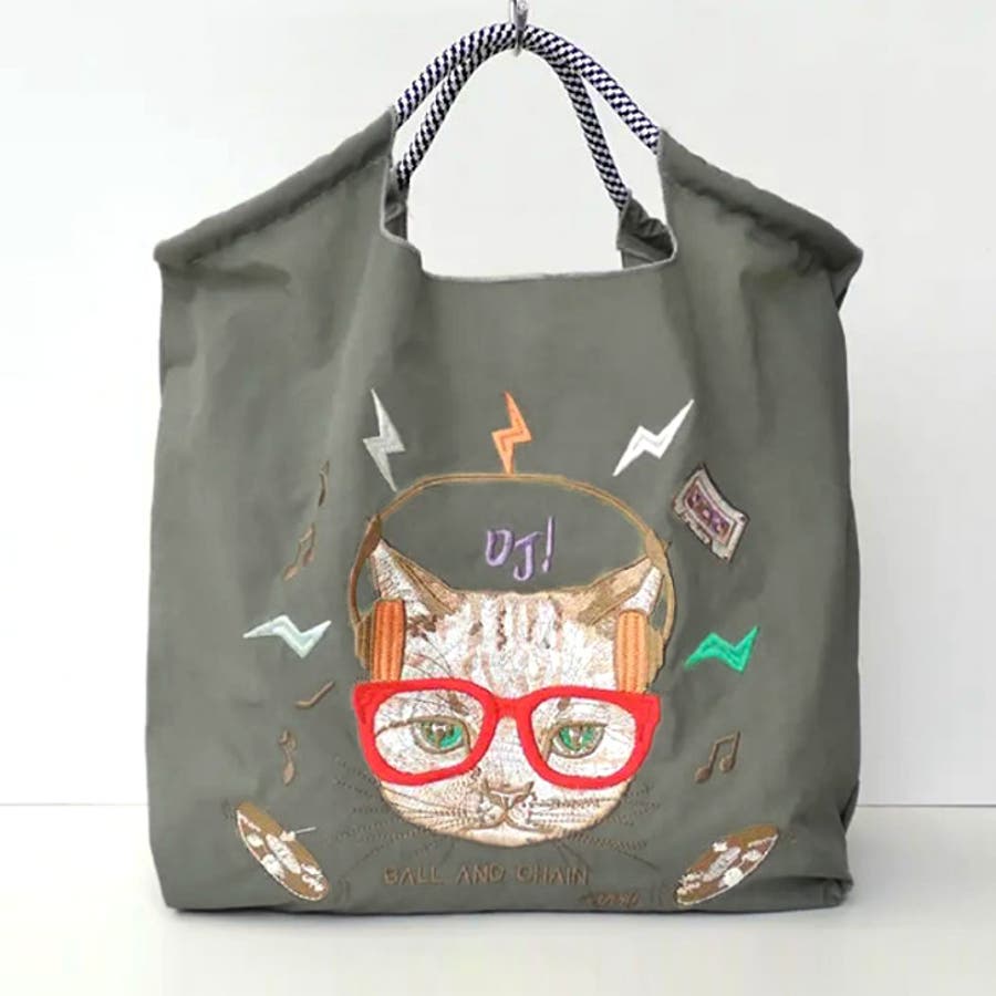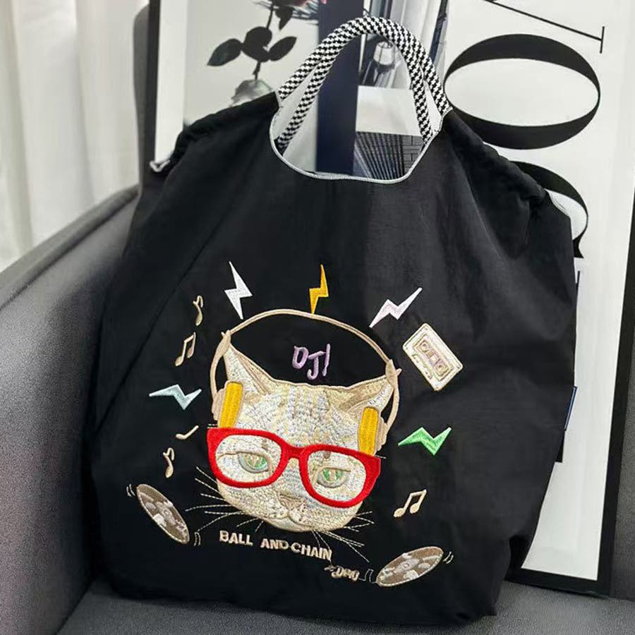 | コードデザインの持ち手や、ネコの刺繍が目を引くポイント♪小さくたたんで持ち歩けます。 |