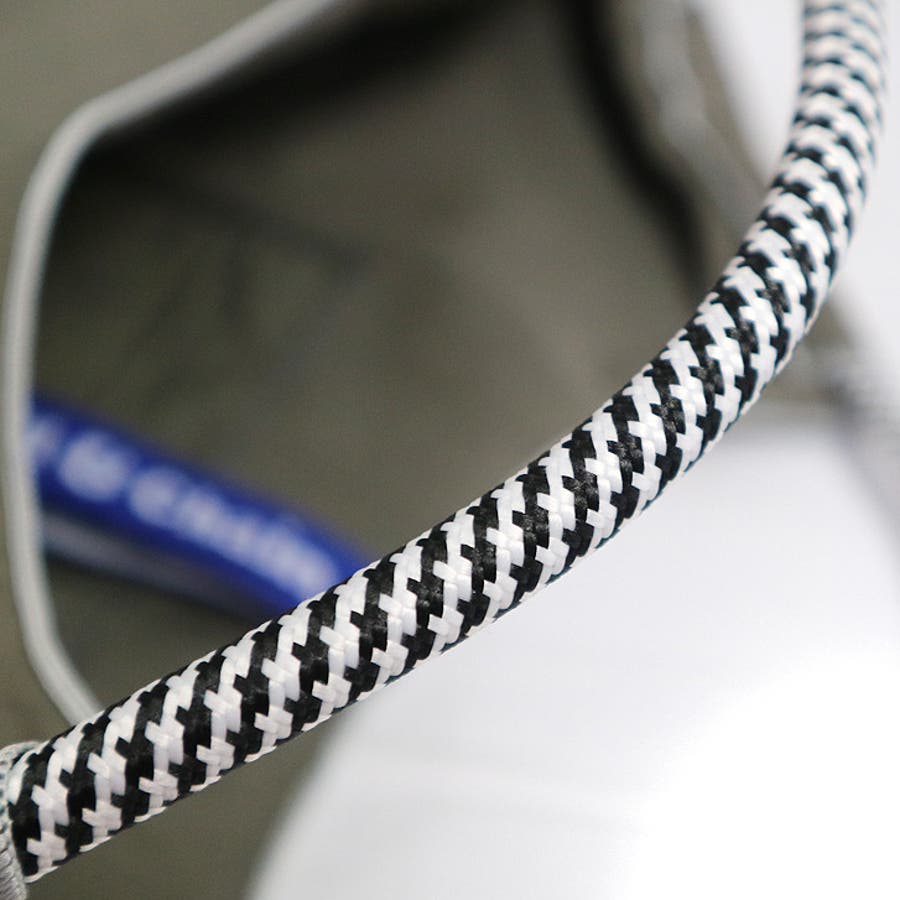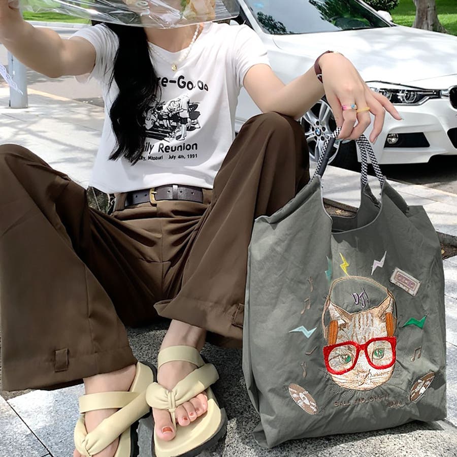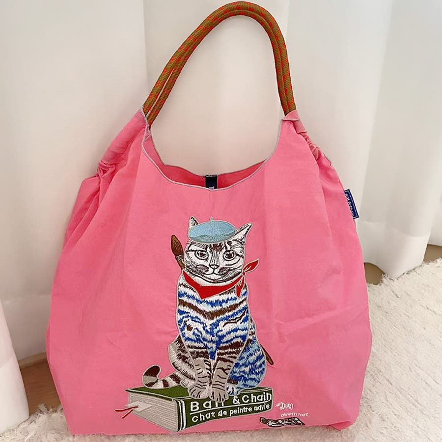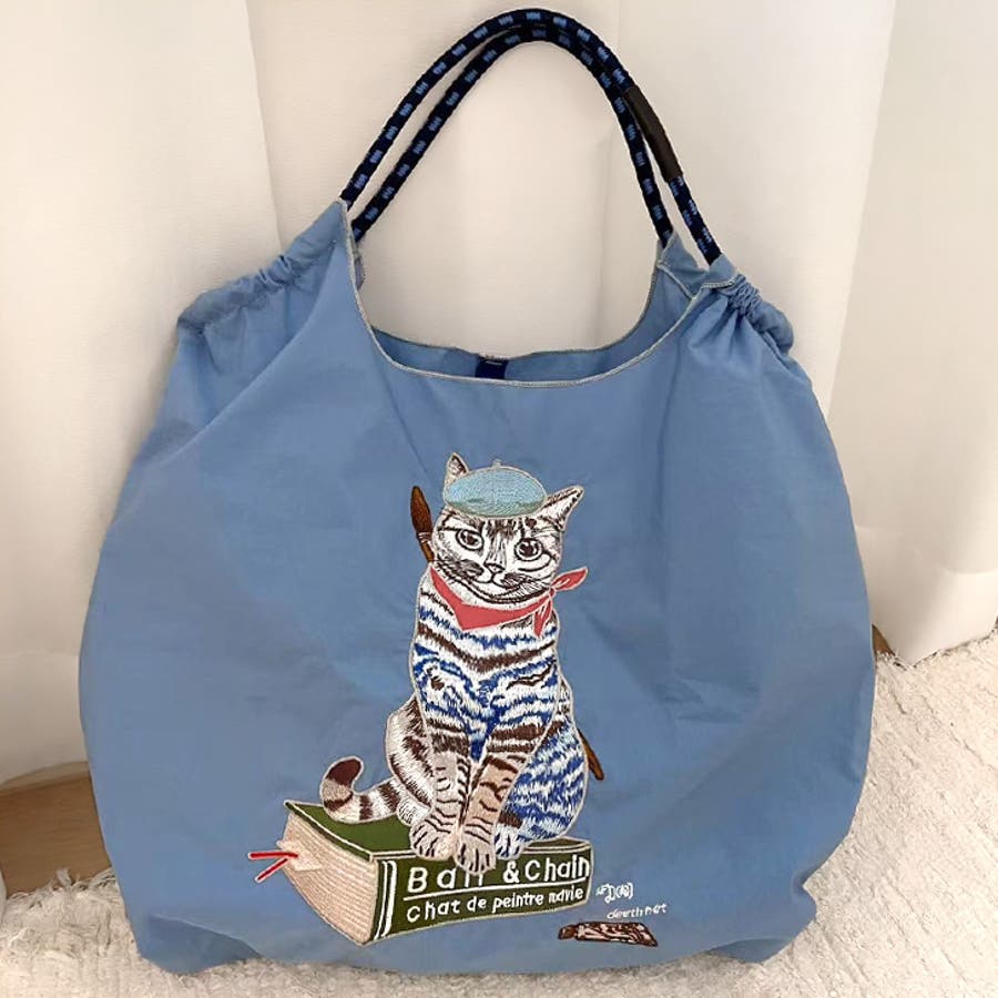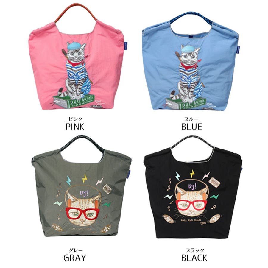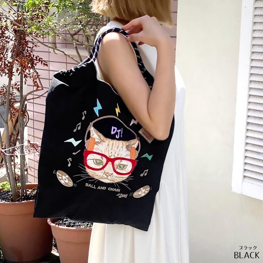 | コードデザインの持ち手や、ネコの刺繍が目を引くポイント♪小さくたたんで持ち歩けます。 |