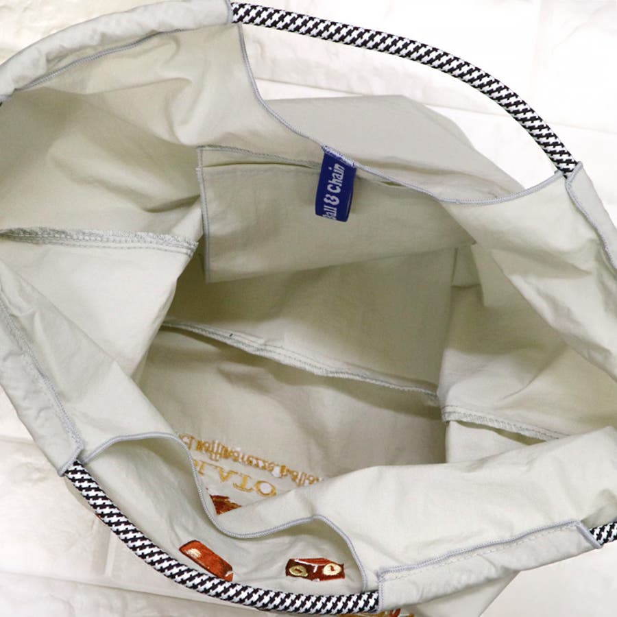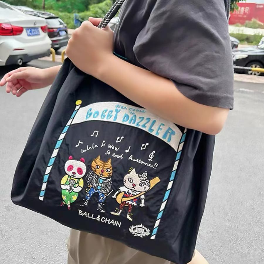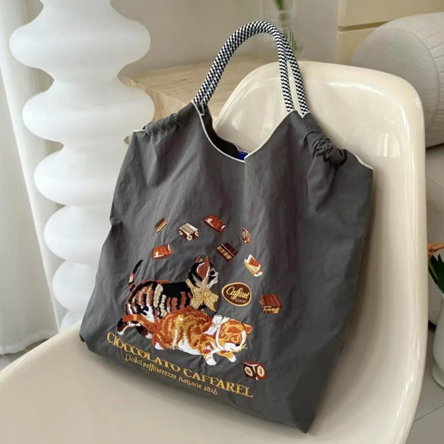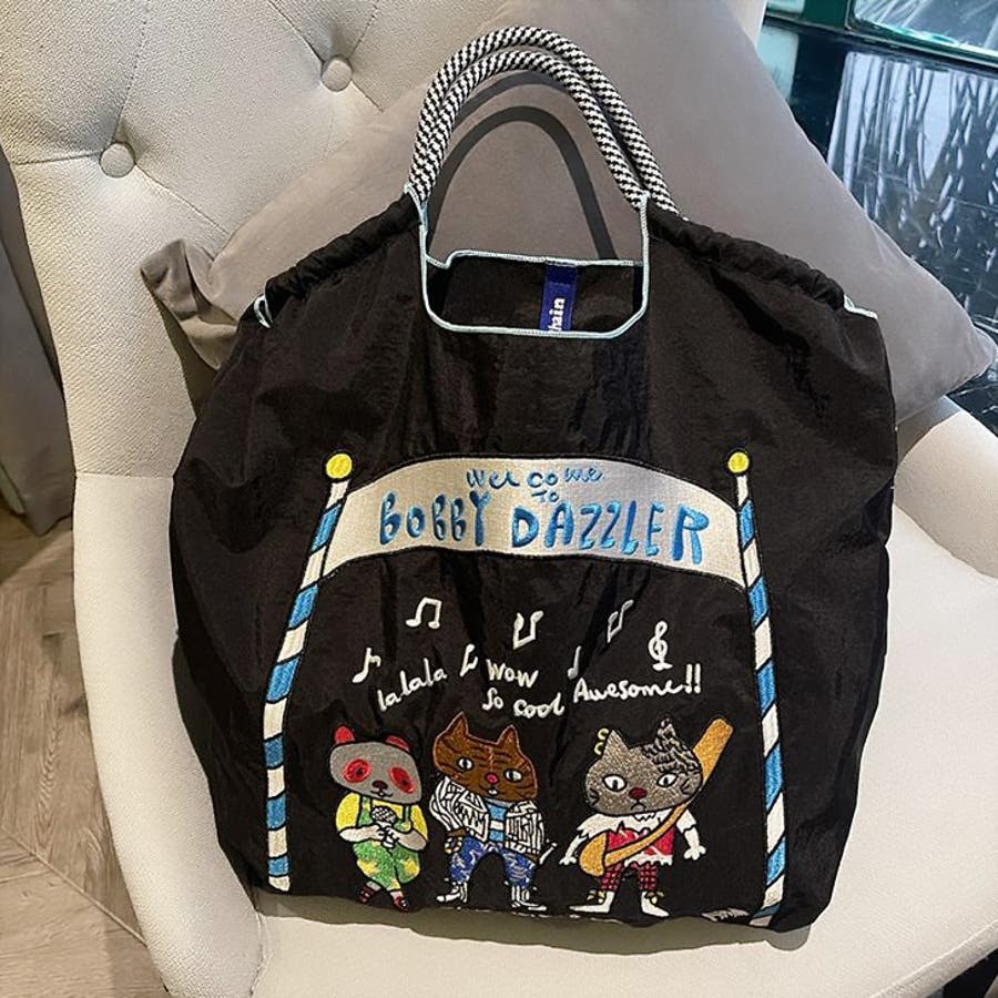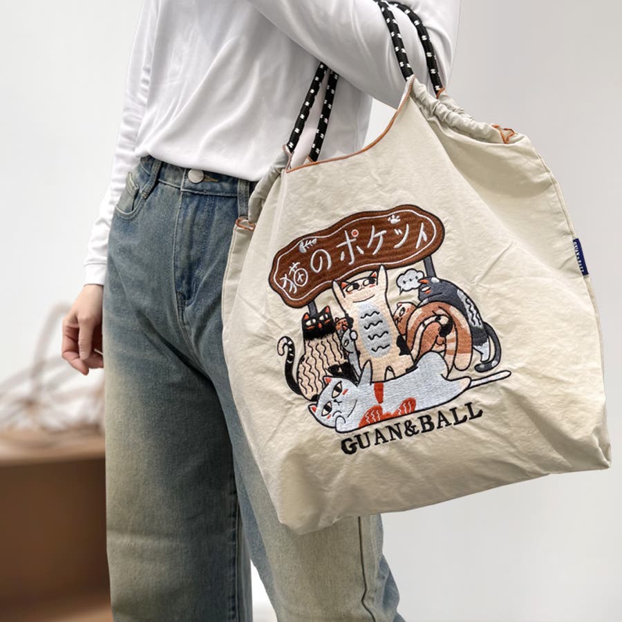 | コードデザインの持ち手や、ネコの刺繍が目を引くポイント♪小さくたたんで持ち歩けます。 |