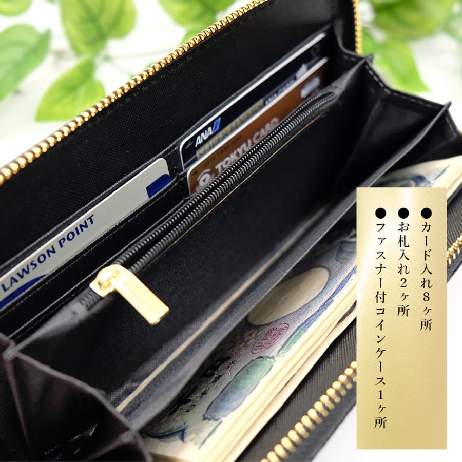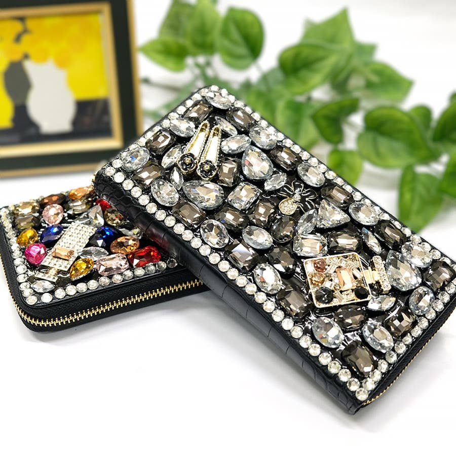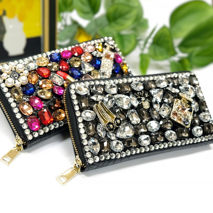 | 素材等 | 本体:フェイクレザー/合金 カード入れ:8ヶ所 お札入れ:2ヶ所 コインケース:ファスナーつき その他:ファスナーで開け閉め ご注意:ビジューの色や形はそれぞれ異なります。予めご了承ください。 |