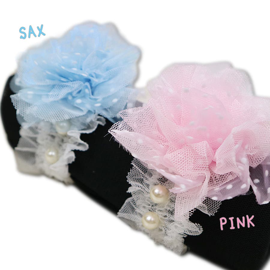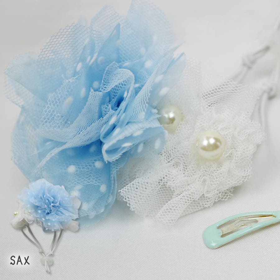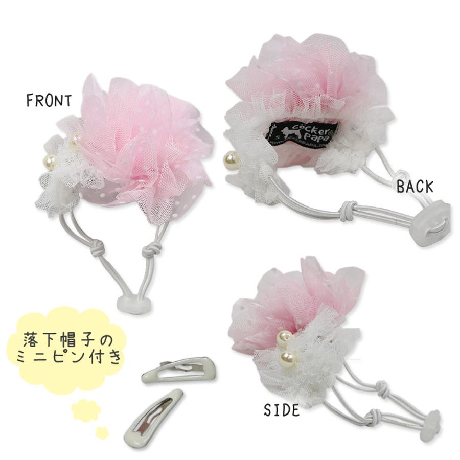 | 素材等 | 本体:ポリエステル/ポリウレタン/合金/プラスチック 生地の伸縮性:お花:なし、ひもはゴム仕様 生地の透け感:あり 調節:若干あり その他:落下防止用ピン付き |