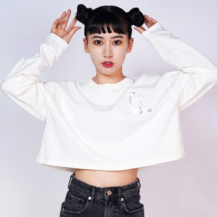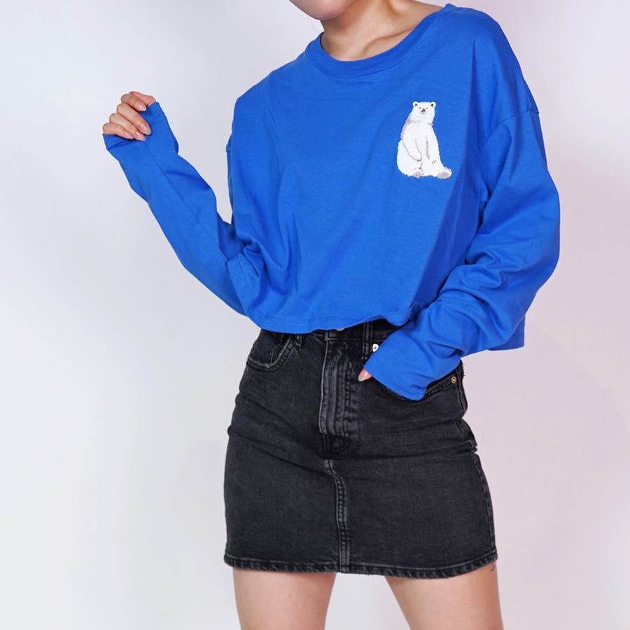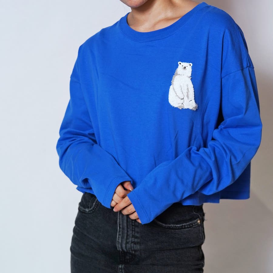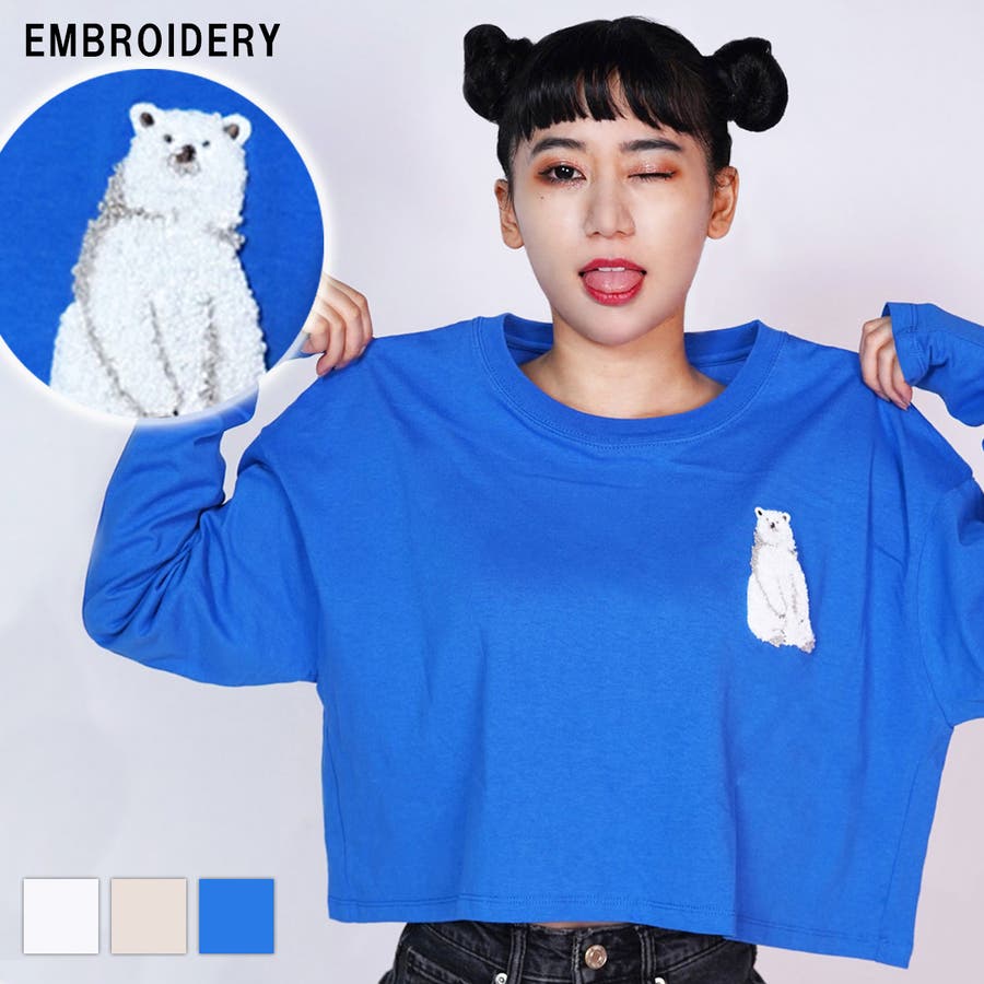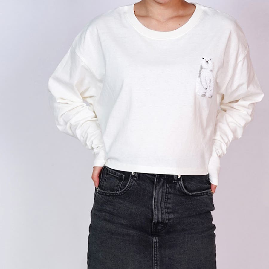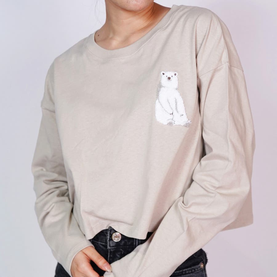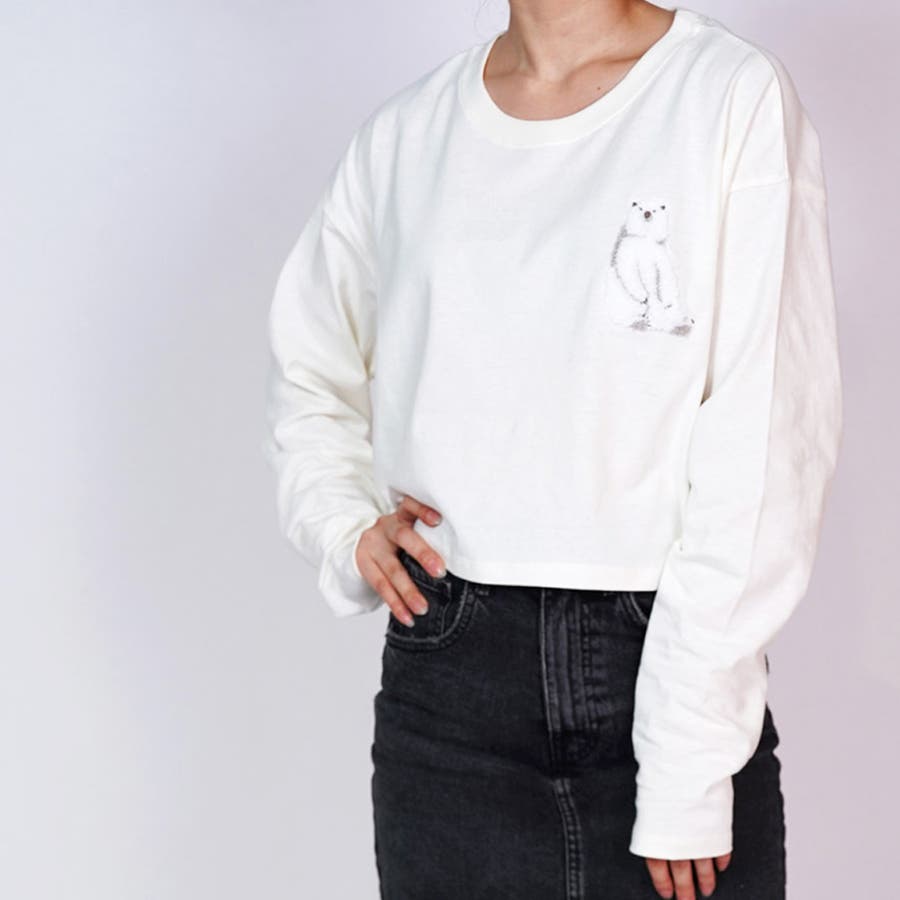 白 クマ 服 しろくま 刺繍トップス クロップド丈 トップス クロップド丈 長袖 レディーストップス レディース 白熊 クロップド トップス