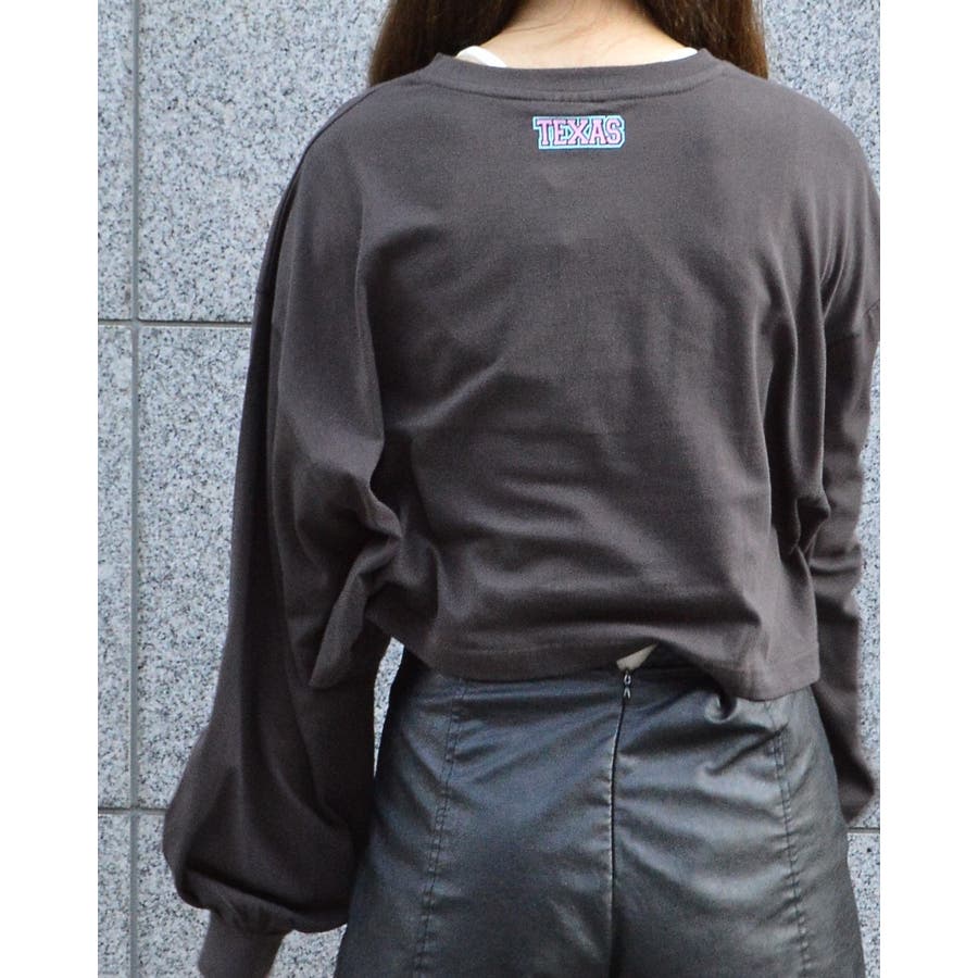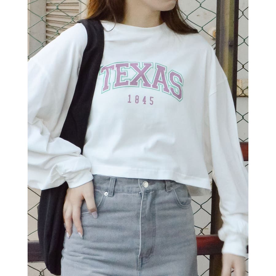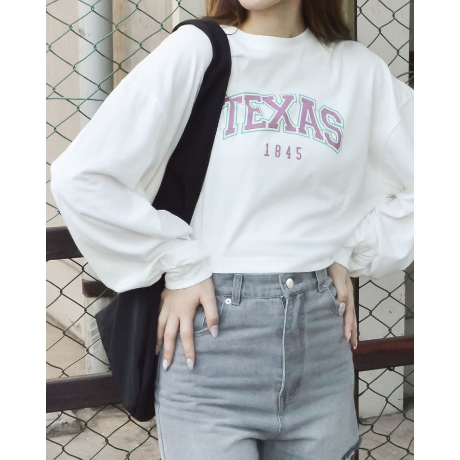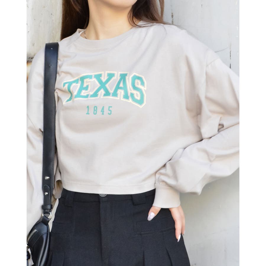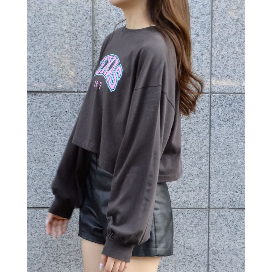 ・大きなカレッジロゴが映えるクロップド丈のロンT。